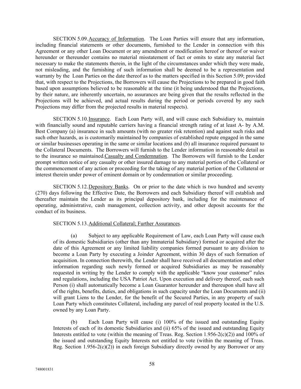 SECTION 5.09.Accuracy of Information. The Loan Parties will ensure that any information, including financial statements or other documents, furnished to the Lender in connection with this Agreement or any other Loan Document or any amendment or modification hereof or thereof or waiver hereunder or thereunder contains no material misstatement of fact or omits to state any material fact necessary to make the statements therein, in the light of the circumstances under which they were made, not misleading, and the furnishing of such information shall be deemed to be a representation and warranty by the Loan Parties on the date thereof as to the matters specified in this Section 5.09; provided that, with respect to the Projections, the Borrowers will cause the Projections to be prepared in good faith based upon assumptions believed to be reasonable at the time (it being understood that the Projections, by their nature, are inherently uncertain, no assurances are being given that the results reflected in the Projections will be achieved, and actual results during the period or periods covered by any such Projections may differ from the projected results in material respects). SECTION 5.10.Insurance. Each Loan Party will, and will cause each Subsidiary to, maintain with financially sound and reputable carriers having a financial strength rating of at least A- by A.M. Best Company (a) insurance in such amounts (with no greater risk retention) and against such risks and such other hazards, as is customarily maintained by companies of established repute engaged in the same or similar businesses operating in the same or similar locations and (b) all insurance required pursuant to the Collateral Documents. The Borrowers will furnish to the Lender information in reasonable detail as to the insurance so maintained.Casualty and Condemnation. The Borrowers will furnish to the Lender prompt written notice of any casualty or other insured damage to any material portion of the Collateral or the commencement of any action or proceeding for the taking of any material portion of the Collateral or interest therein under power of eminent domain or by condemnation or similar proceeding. SECTION 5.12.Depository Banks. On or prior to the date which is two hundred and seventy (270) days following the Effective Date, the Borrowers and each Subsidiary thereof will establish and thereafter maintain the Lender as its principal depository bank, including for the maintenance of operating, administrative, cash management, collection activity, and other deposit accounts for the conduct of its business. SECTION 5.13.Additional Collateral; Further Assurances. (a) Subject to any applicable Requirement of Law, each Loan Party will cause each of its domestic Subsidiaries (other than any Immaterial Subsidiary) formed or acquired after the date of this Agreement or any limited liability companies formed pursuant to any division to become a Loan Party by executing a Joinder Agreement, within 30 days of such formation of acquisition. In connection therewith, the Lender shall have received all documentation and other information regarding such newly formed or acquired Subsidiaries as may be reasonably requested in writing by the Lender to comply with the applicable “know your customer” rules and regulations, including the USA Patriot Act. Upon execution and delivery thereof, each such Person (i) shall automatically become a Loan Guarantor hereunder and thereupon shall have all of the rights, benefits, duties, and obligations in such capacity under the Loan Documents and (ii) will grant Liens to the Lender, for the benefit of the Secured Parties, in any property of such Loan Party which constitutes Collateral, including any parcel of real property located in the U.S. owned by any Loan Party. (b) Each Loan Party will cause (i) 100% of the issued and outstanding Equity Interests of each of its domestic Subsidiaries and (ii) 65% of the issued and outstanding Equity Interests entitled to vote (within the meaning of Treas. Reg. Section 1.956-2(c)(2)) and 100% of the issued and outstanding Equity Interests not entitled to vote (within the meaning of Treas. Reg. Section 1.956-2(c)(2)) in each foreign Subsidiary directly owned by any Borrower or any 58 748001831
