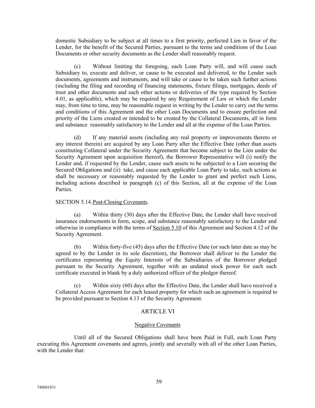 domestic Subsidiary to be subject at all times to a first priority, perfected Lien in favor of the Lender, for the benefit of the Secured Parties, pursuant to the terms and conditions of the Loan Documents or other security documents as the Lender shall reasonably request. (c) Without limiting the foregoing, each Loan Party will, and will cause each Subsidiary to, execute and deliver, or cause to be executed and delivered, to the Lender such documents, agreements and instruments, and will take or cause to be taken such further actions (including the filing and recording of financing statements, fixture filings, mortgages, deeds of trust and other documents and such other actions or deliveries of the type required by Section 4.01, as applicable), which may be required by any Requirement of Law or which the Lender may, from time to time, may be reasonable request in writing by the Lender to carry out the terms and conditions of this Agreement and the other Loan Documents and to ensure perfection and priority of the Liens created or intended to be created by the Collateral Documents, all in form and substance reasonably satisfactory to the Lender and all at the expense of the Loan Parties. (d) If any material assets (including any real property or improvements thereto or any interest therein) are acquired by any Loan Party after the Effective Date (other than assets constituting Collateral under the Security Agreement that become subject to the Lien under the Security Agreement upon acquisition thereof), the Borrower Representative will (i) notify the Lender and, if requested by the Lender, cause such assets to be subjected to a Lien securing the Secured Obligations and (ii) take, and cause each applicable Loan Party to take, such actions as shall be necessary or reasonably requested by the Lender to grant and perfect such Liens, including actions described in paragraph (c) of this Section, all at the expense of the Loan Parties. SECTION 5.14.Post-Closing Covenants. (a) Within thirty (30) days after the Effective Date, the Lender shall have received insurance endorsements in form, scope, and substance reasonably satisfactory to the Lender and otherwise in compliance with the terms of Section 5.10 of this Agreement and Section 4.12 of the Security Agreement. (b) Within forty-five (45) days after the Effective Date (or such later date as may be agreed to by the Lender in its sole discretion), the Borrower shall deliver to the Lender the certificates representing the Equity Interests of the Subsidiaries of the Borrower pledged pursuant to the Security Agreement, together with an undated stock power for each such certificate executed in blank by a duly authorized officer of the pledgor thereof. (c) Within sixty (60) days after the Effective Date, the Lender shall have received a Collateral Access Agreement for each leased property for which such an agreement is required to be provided pursuant to Section 4.13 of the Security Agreement. ARTICLE VI Negative Covenants Until all of the Secured Obligations shall have been Paid in Full, each Loan Party executing this Agreement covenants and agrees, jointly and severally with all of the other Loan Parties, with the Lender that: 59 748001831