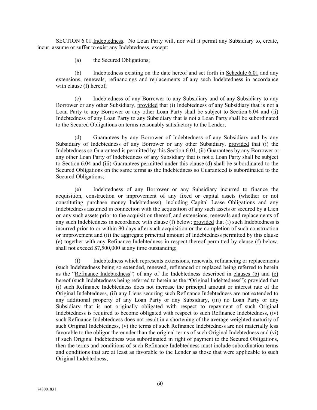 SECTION 6.01.Indebtedness. No Loan Party will, nor will it permit any Subsidiary to, create, incur, assume or suffer to exist any Indebtedness, except: (a) the Secured Obligations; (b) Indebtedness existing on the date hereof and set forth in Schedule 6.01 and any extensions, renewals, refinancings and replacements of any such Indebtedness in accordance with clause (f) hereof; (c) Indebtedness of any Borrower to any Subsidiary and of any Subsidiary to any Borrower or any other Subsidiary, provided that (i) Indebtedness of any Subsidiary that is not a Loan Party to any Borrower or any other Loan Party shall be subject to Section 6.04 and (ii) Indebtedness of any Loan Party to any Subsidiary that is not a Loan Party shall be subordinated to the Secured Obligations on terms reasonably satisfactory to the Lender; (d) Guarantees by any Borrower of Indebtedness of any Subsidiary and by any Subsidiary of Indebtedness of any Borrower or any other Subsidiary, provided that (i) the Indebtedness so Guaranteed is permitted by this Section 6.01, (ii) Guarantees by any Borrower or any other Loan Party of Indebtedness of any Subsidiary that is not a Loan Party shall be subject to Section 6.04 and (iii) Guarantees permitted under this clause (d) shall be subordinated to the Secured Obligations on the same terms as the Indebtedness so Guaranteed is subordinated to the Secured Obligations; (e) Indebtedness of any Borrower or any Subsidiary incurred to finance the acquisition, construction or improvement of any fixed or capital assets (whether or not constituting purchase money Indebtedness), including Capital Lease Obligations and any Indebtedness assumed in connection with the acquisition of any such assets or secured by a Lien on any such assets prior to the acquisition thereof, and extensions, renewals and replacements of any such Indebtedness in accordance with clause (f) below; provided that (i) such Indebtedness is incurred prior to or within 90 days after such acquisition or the completion of such construction or improvement and (ii) the aggregate principal amount of Indebtedness permitted by this clause (e) together with any Refinance Indebtedness in respect thereof permitted by clause (f) below, shall not exceed $7,500,000 at any time outstanding; (f) Indebtedness which represents extensions, renewals, refinancing or replacements (such Indebtedness being so extended, renewed, refinanced or replaced being referred to herein as the “Refinance Indebtedness”) of any of the Indebtedness described in clauses (b) and (e) hereof (such Indebtedness being referred to herein as the “Original Indebtedness”); provided that (i) such Refinance Indebtedness does not increase the principal amount or interest rate of the Original Indebtedness, (ii) any Liens securing such Refinance Indebtedness are not extended to any additional property of any Loan Party or any Subsidiary, (iii) no Loan Party or any Subsidiary that is not originally obligated with respect to repayment of such Original Indebtedness is required to become obligated with respect to such Refinance Indebtedness, (iv) such Refinance Indebtedness does not result in a shortening of the average weighted maturity of such Original Indebtedness, (v) the terms of such Refinance Indebtedness are not materially less favorable to the obligor thereunder than the original terms of such Original Indebtedness and (vi) if such Original Indebtedness was subordinated in right of payment to the Secured Obligations, then the terms and conditions of such Refinance Indebtedness must include subordination terms and conditions that are at least as favorable to the Lender as those that were applicable to such Original Indebtedness; 60 748001831