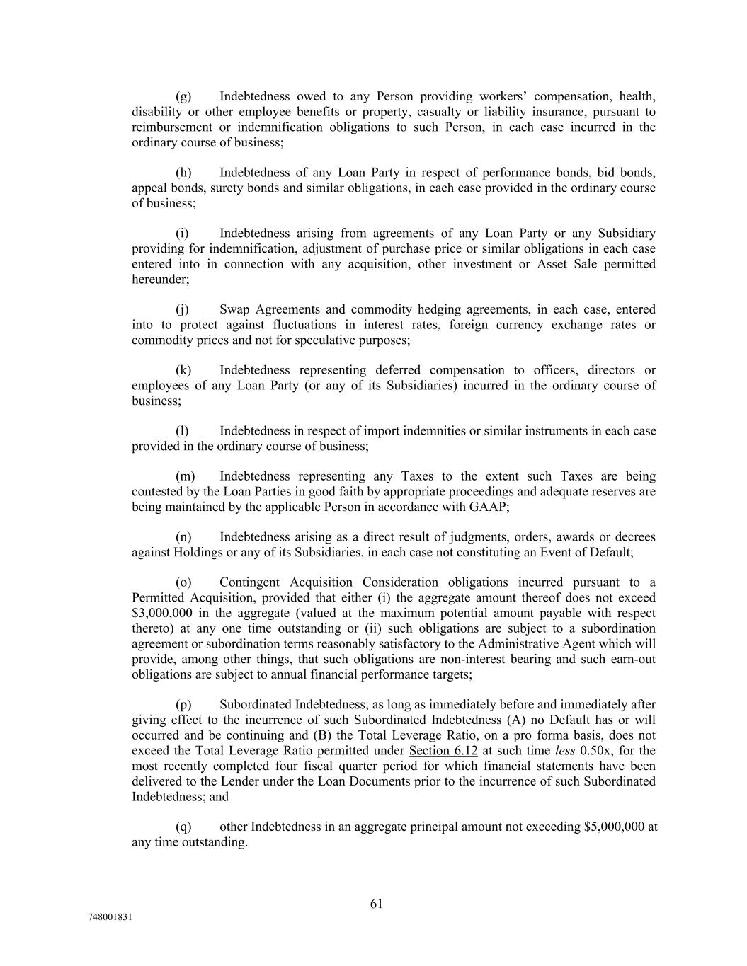 (g) Indebtedness owed to any Person providing workers’ compensation, health, disability or other employee benefits or property, casualty or liability insurance, pursuant to reimbursement or indemnification obligations to such Person, in each case incurred in the ordinary course of business; (h) Indebtedness of any Loan Party in respect of performance bonds, bid bonds, appeal bonds, surety bonds and similar obligations, in each case provided in the ordinary course of business; (i) Indebtedness arising from agreements of any Loan Party or any Subsidiary providing for indemnification, adjustment of purchase price or similar obligations in each case entered into in connection with any acquisition, other investment or Asset Sale permitted hereunder; (j) Swap Agreements and commodity hedging agreements, in each case, entered into to protect against fluctuations in interest rates, foreign currency exchange rates or commodity prices and not for speculative purposes; (k) Indebtedness representing deferred compensation to officers, directors or employees of any Loan Party (or any of its Subsidiaries) incurred in the ordinary course of business; (l) Indebtedness in respect of import indemnities or similar instruments in each case provided in the ordinary course of business; (m) Indebtedness representing any Taxes to the extent such Taxes are being contested by the Loan Parties in good faith by appropriate proceedings and adequate reserves are being maintained by the applicable Person in accordance with GAAP; (n) Indebtedness arising as a direct result of judgments, orders, awards or decrees against Holdings or any of its Subsidiaries, in each case not constituting an Event of Default; (o) Contingent Acquisition Consideration obligations incurred pursuant to a Permitted Acquisition, provided that either (i) the aggregate amount thereof does not exceed $3,000,000 in the aggregate (valued at the maximum potential amount payable with respect thereto) at any one time outstanding or (ii) such obligations are subject to a subordination agreement or subordination terms reasonably satisfactory to the Administrative Agent which will provide, among other things, that such obligations are non-interest bearing and such earn-out obligations are subject to annual financial performance targets; (p) Subordinated Indebtedness; as long as immediately before and immediately after giving effect to the incurrence of such Subordinated Indebtedness (A) no Default has or will occurred and be continuing and (B) the Total Leverage Ratio, on a pro forma basis, does not exceed the Total Leverage Ratio permitted under Section 6.12 at such time less 0.50x, for the most recently completed four fiscal quarter period for which financial statements have been delivered to the Lender under the Loan Documents prior to the incurrence of such Subordinated Indebtedness; and (q) other Indebtedness in an aggregate principal amount not exceeding $5,000,000 at any time outstanding. 61 748001831