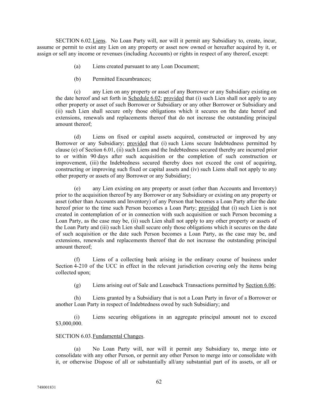 SECTION 6.02.Liens. No Loan Party will, nor will it permit any Subsidiary to, create, incur, assume or permit to exist any Lien on any property or asset now owned or hereafter acquired by it, or assign or sell any income or revenues (including Accounts) or rights in respect of any thereof, except: (a) Liens created pursuant to any Loan Document; (b) Permitted Encumbrances; (c) any Lien on any property or asset of any Borrower or any Subsidiary existing on the date hereof and set forth in Schedule 6.02; provided that (i) such Lien shall not apply to any other property or asset of such Borrower or Subsidiary or any other Borrower or Subsidiary and (ii) such Lien shall secure only those obligations which it secures on the date hereof and extensions, renewals and replacements thereof that do not increase the outstanding principal amount thereof; (d) Liens on fixed or capital assets acquired, constructed or improved by any Borrower or any Subsidiary; provided that (i) such Liens secure Indebtedness permitted by clause (e) of Section 6.01, (ii) such Liens and the Indebtedness secured thereby are incurred prior to or within 90 days after such acquisition or the completion of such construction or improvement, (iii) the Indebtedness secured thereby does not exceed the cost of acquiring, constructing or improving such fixed or capital assets and (iv) such Liens shall not apply to any other property or assets of any Borrower or any Subsidiary; (e) any Lien existing on any property or asset (other than Accounts and Inventory) prior to the acquisition thereof by any Borrower or any Subsidiary or existing on any property or asset (other than Accounts and Inventory) of any Person that becomes a Loan Party after the date hereof prior to the time such Person becomes a Loan Party; provided that (i) such Lien is not created in contemplation of or in connection with such acquisition or such Person becoming a Loan Party, as the case may be, (ii) such Lien shall not apply to any other property or assets of the Loan Party and (iii) such Lien shall secure only those obligations which it secures on the date of such acquisition or the date such Person becomes a Loan Party, as the case may be, and extensions, renewals and replacements thereof that do not increase the outstanding principal amount thereof; (f) Liens of a collecting bank arising in the ordinary course of business under Section 4-210 of the UCC in effect in the relevant jurisdiction covering only the items being collected upon; (g) Liens arising out of Sale and Leaseback Transactions permitted by Section 6.06; (h) Liens granted by a Subsidiary that is not a Loan Party in favor of a Borrower or another Loan Party in respect of Indebtedness owed by such Subsidiary; and (i) Liens securing obligations in an aggregate principal amount not to exceed $3,000,000. SECTION 6.03.Fundamental Changes. (a) No Loan Party will, nor will it permit any Subsidiary to, merge into or consolidate with any other Person, or permit any other Person to merge into or consolidate with it, or otherwise Dispose of all or substantially all/any substantial part of its assets, or all or 62 748001831