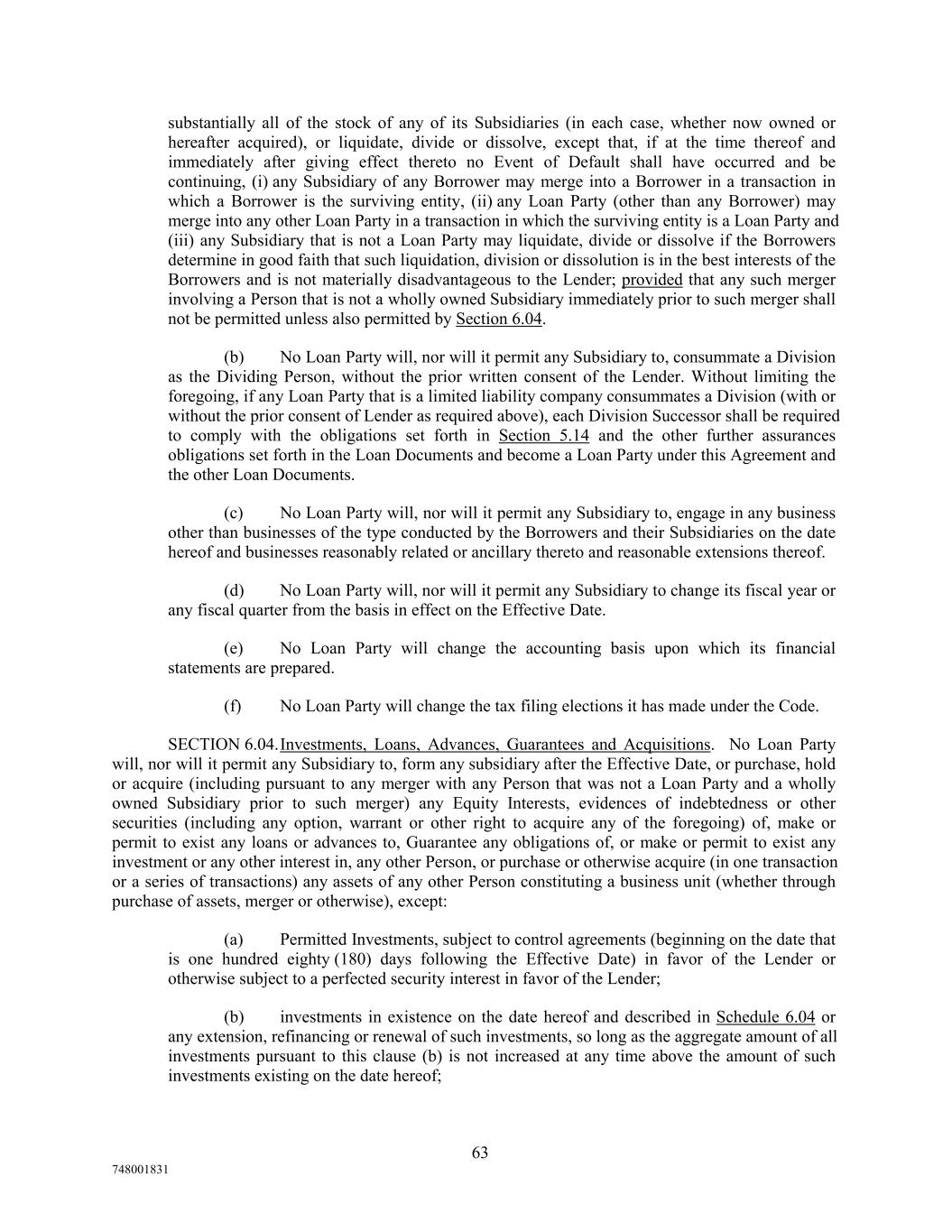 substantially all of the stock of any of its Subsidiaries (in each case, whether now owned or hereafter acquired), or liquidate, divide or dissolve, except that, if at the time thereof and immediately after giving effect thereto no Event of Default shall have occurred and be continuing, (i) any Subsidiary of any Borrower may merge into a Borrower in a transaction in which a Borrower is the surviving entity, (ii) any Loan Party (other than any Borrower) may merge into any other Loan Party in a transaction in which the surviving entity is a Loan Party and (iii) any Subsidiary that is not a Loan Party may liquidate, divide or dissolve if the Borrowers determine in good faith that such liquidation, division or dissolution is in the best interests of the Borrowers and is not materially disadvantageous to the Lender; provided that any such merger involving a Person that is not a wholly owned Subsidiary immediately prior to such merger shall not be permitted unless also permitted by Section 6.04. (b) No Loan Party will, nor will it permit any Subsidiary to, consummate a Division as the Dividing Person, without the prior written consent of the Lender. Without limiting the foregoing, if any Loan Party that is a limited liability company consummates a Division (with or without the prior consent of Lender as required above), each Division Successor shall be required to comply with the obligations set forth in Section 5.14 and the other further assurances obligations set forth in the Loan Documents and become a Loan Party under this Agreement and the other Loan Documents. (c) No Loan Party will, nor will it permit any Subsidiary to, engage in any business other than businesses of the type conducted by the Borrowers and their Subsidiaries on the date hereof and businesses reasonably related or ancillary thereto and reasonable extensions thereof. (d) No Loan Party will, nor will it permit any Subsidiary to change its fiscal year or any fiscal quarter from the basis in effect on the Effective Date. (e) No Loan Party will change the accounting basis upon which its financial statements are prepared. (f) No Loan Party will change the tax filing elections it has made under the Code. SECTION 6.04.Investments, Loans, Advances, Guarantees and Acquisitions. No Loan Party will, nor will it permit any Subsidiary to, form any subsidiary after the Effective Date, or purchase, hold or acquire (including pursuant to any merger with any Person that was not a Loan Party and a wholly owned Subsidiary prior to such merger) any Equity Interests, evidences of indebtedness or other securities (including any option, warrant or other right to acquire any of the foregoing) of, make or permit to exist any loans or advances to, Guarantee any obligations of, or make or permit to exist any investment or any other interest in, any other Person, or purchase or otherwise acquire (in one transaction or a series of transactions) any assets of any other Person constituting a business unit (whether through purchase of assets, merger or otherwise), except: (a) Permitted Investments, subject to control agreements (beginning on the date that is one hundred eighty (180) days following the Effective Date) in favor of the Lender or otherwise subject to a perfected security interest in favor of the Lender; (b) investments in existence on the date hereof and described in Schedule 6.04 or any extension, refinancing or renewal of such investments, so long as the aggregate amount of all investments pursuant to this clause (b) is not increased at any time above the amount of such investments existing on the date hereof; 63 748001831