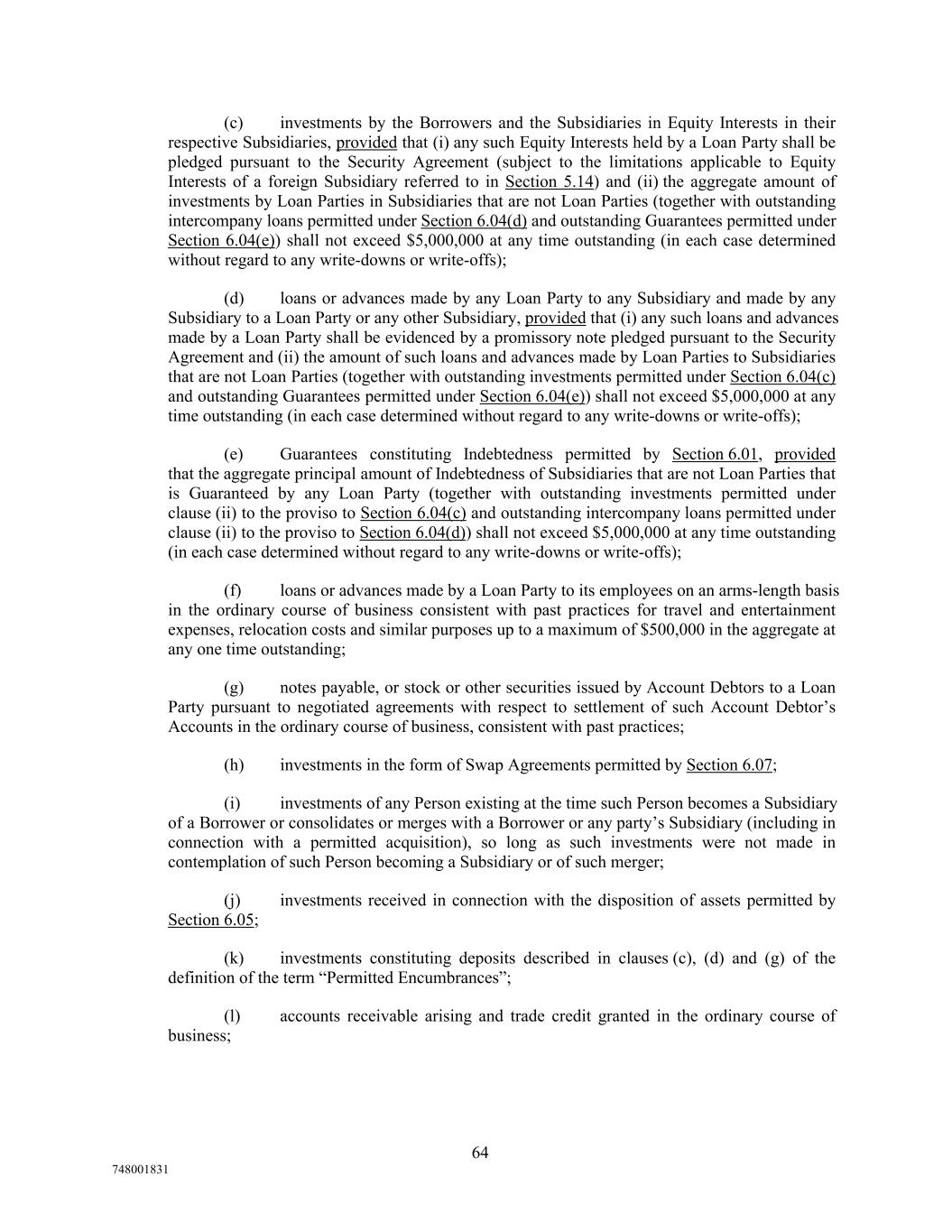 (c) investments by the Borrowers and the Subsidiaries in Equity Interests in their respective Subsidiaries, provided that (i) any such Equity Interests held by a Loan Party shall be pledged pursuant to the Security Agreement (subject to the limitations applicable to Equity Interests of a foreign Subsidiary referred to in Section 5.14) and (ii) the aggregate amount of investments by Loan Parties in Subsidiaries that are not Loan Parties (together with outstanding intercompany loans permitted under Section 6.04(d) and outstanding Guarantees permitted under Section 6.04(e)) shall not exceed $5,000,000 at any time outstanding (in each case determined without regard to any write-downs or write-offs); (d) loans or advances made by any Loan Party to any Subsidiary and made by any Subsidiary to a Loan Party or any other Subsidiary, provided that (i) any such loans and advances made by a Loan Party shall be evidenced by a promissory note pledged pursuant to the Security Agreement and (ii) the amount of such loans and advances made by Loan Parties to Subsidiaries that are not Loan Parties (together with outstanding investments permitted under Section 6.04(c) and outstanding Guarantees permitted under Section 6.04(e)) shall not exceed $5,000,000 at any time outstanding (in each case determined without regard to any write-downs or write-offs); (e) Guarantees constituting Indebtedness permitted by Section 6.01, provided that the aggregate principal amount of Indebtedness of Subsidiaries that are not Loan Parties that is Guaranteed by any Loan Party (together with outstanding investments permitted under clause (ii) to the proviso to Section 6.04(c) and outstanding intercompany loans permitted under clause (ii) to the proviso to Section 6.04(d)) shall not exceed $5,000,000 at any time outstanding (in each case determined without regard to any write-downs or write-offs); (f) loans or advances made by a Loan Party to its employees on an arms-length basis in the ordinary course of business consistent with past practices for travel and entertainment expenses, relocation costs and similar purposes up to a maximum of $500,000 in the aggregate at any one time outstanding; (g) notes payable, or stock or other securities issued by Account Debtors to a Loan Party pursuant to negotiated agreements with respect to settlement of such Account Debtor’s Accounts in the ordinary course of business, consistent with past practices; (h) investments in the form of Swap Agreements permitted by Section 6.07; (i) investments of any Person existing at the time such Person becomes a Subsidiary of a Borrower or consolidates or merges with a Borrower or any party’s Subsidiary (including in connection with a permitted acquisition), so long as such investments were not made in contemplation of such Person becoming a Subsidiary or of such merger; (j) investments received in connection with the disposition of assets permitted by Section 6.05; (k) investments constituting deposits described in clauses (c), (d) and (g) of the definition of the term “Permitted Encumbrances”; (l) accounts receivable arising and trade credit granted in the ordinary course of business; 64 748001831