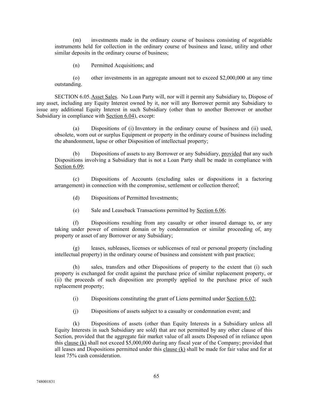 (m) investments made in the ordinary course of business consisting of negotiable instruments held for collection in the ordinary course of business and lease, utility and other similar deposits in the ordinary course of business; (n) Permitted Acquisitions; and (o) other investments in an aggregate amount not to exceed $2,000,000 at any time outstanding. SECTION 6.05.Asset Sales. No Loan Party will, nor will it permit any Subsidiary to, Dispose of any asset, including any Equity Interest owned by it, nor will any Borrower permit any Subsidiary to issue any additional Equity Interest in such Subsidiary (other than to another Borrower or another Subsidiary in compliance with Section 6.04), except: (a) Dispositions of (i) Inventory in the ordinary course of business and (ii) used, obsolete, worn out or surplus Equipment or property in the ordinary course of business including the abandonment, lapse or other Disposition of intellectual property; (b) Dispositions of assets to any Borrower or any Subsidiary, provided that any such Dispositions involving a Subsidiary that is not a Loan Party shall be made in compliance with Section 6.09; (c) Dispositions of Accounts (excluding sales or dispositions in a factoring arrangement) in connection with the compromise, settlement or collection thereof; (d) Dispositions of Permitted Investments; (e) Sale and Leaseback Transactions permitted by Section 6.06; (f) Dispositions resulting from any casualty or other insured damage to, or any taking under power of eminent domain or by condemnation or similar proceeding of, any property or asset of any Borrower or any Subsidiary; (g) leases, subleases, licenses or sublicenses of real or personal property (including intellectual property) in the ordinary course of business and consistent with past practice; (h) sales, transfers and other Dispositions of property to the extent that (i) such property is exchanged for credit against the purchase price of similar replacement property, or (ii) the proceeds of such disposition are promptly applied to the purchase price of such replacement property; (i) Dispositions constituting the grant of Liens permitted under Section 6.02; (j) Dispositions of assets subject to a casualty or condemnation event; and (k) Dispositions of assets (other than Equity Interests in a Subsidiary unless all Equity Interests in such Subsidiary are sold) that are not permitted by any other clause of this Section, provided that the aggregate fair market value of all assets Disposed of in reliance upon this clause (k) shall not exceed $5,000,000 during any fiscal year of the Company; provided that all leases and Dispositions permitted under this clause (k) shall be made for fair value and for at least 75% cash consideration. 65 748001831