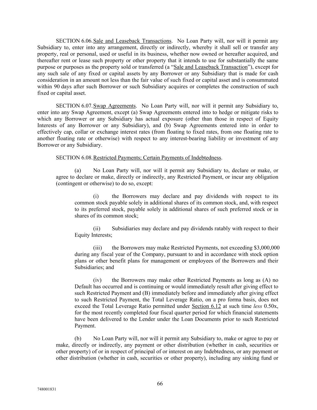SECTION 6.06.Sale and Leaseback Transactions. No Loan Party will, nor will it permit any Subsidiary to, enter into any arrangement, directly or indirectly, whereby it shall sell or transfer any property, real or personal, used or useful in its business, whether now owned or hereafter acquired, and thereafter rent or lease such property or other property that it intends to use for substantially the same purpose or purposes as the property sold or transferred (a “Sale and Leaseback Transaction”), except for any such sale of any fixed or capital assets by any Borrower or any Subsidiary that is made for cash consideration in an amount not less than the fair value of such fixed or capital asset and is consummated within 90 days after such Borrower or such Subsidiary acquires or completes the construction of such fixed or capital asset. SECTION 6.07.Swap Agreements. No Loan Party will, nor will it permit any Subsidiary to, enter into any Swap Agreement, except (a) Swap Agreements entered into to hedge or mitigate risks to which any Borrower or any Subsidiary has actual exposure (other than those in respect of Equity Interests of any Borrower or any Subsidiary), and (b) Swap Agreements entered into in order to effectively cap, collar or exchange interest rates (from floating to fixed rates, from one floating rate to another floating rate or otherwise) with respect to any interest-bearing liability or investment of any Borrower or any Subsidiary. SECTION 6.08.Restricted Payments; Certain Payments of Indebtedness. (a) No Loan Party will, nor will it permit any Subsidiary to, declare or make, or agree to declare or make, directly or indirectly, any Restricted Payment, or incur any obligation (contingent or otherwise) to do so, except: (i) the Borrowers may declare and pay dividends with respect to its common stock payable solely in additional shares of its common stock, and, with respect to its preferred stock, payable solely in additional shares of such preferred stock or in shares of its common stock; (ii) Subsidiaries may declare and pay dividends ratably with respect to their Equity Interests; (iii) the Borrowers may make Restricted Payments, not exceeding $3,000,000 during any fiscal year of the Company, pursuant to and in accordance with stock option plans or other benefit plans for management or employees of the Borrowers and their Subsidiaries; and (iv) the Borrowers may make other Restricted Payments as long as (A) no Default has occurred and is continuing or would immediately result after giving effect to such Restricted Payment and (B) immediately before and immediately after giving effect to such Restricted Payment, the Total Leverage Ratio, on a pro forma basis, does not exceed the Total Leverage Ratio permitted under Section 6.12 at such time less 0.50x, for the most recently completed four fiscal quarter period for which financial statements have been delivered to the Lender under the Loan Documents prior to such Restricted Payment. (b) No Loan Party will, nor will it permit any Subsidiary to, make or agree to pay or make, directly or indirectly, any payment or other distribution (whether in cash, securities or other property) of or in respect of principal of or interest on any Indebtedness, or any payment or other distribution (whether in cash, securities or other property), including any sinking fund or 66 748001831