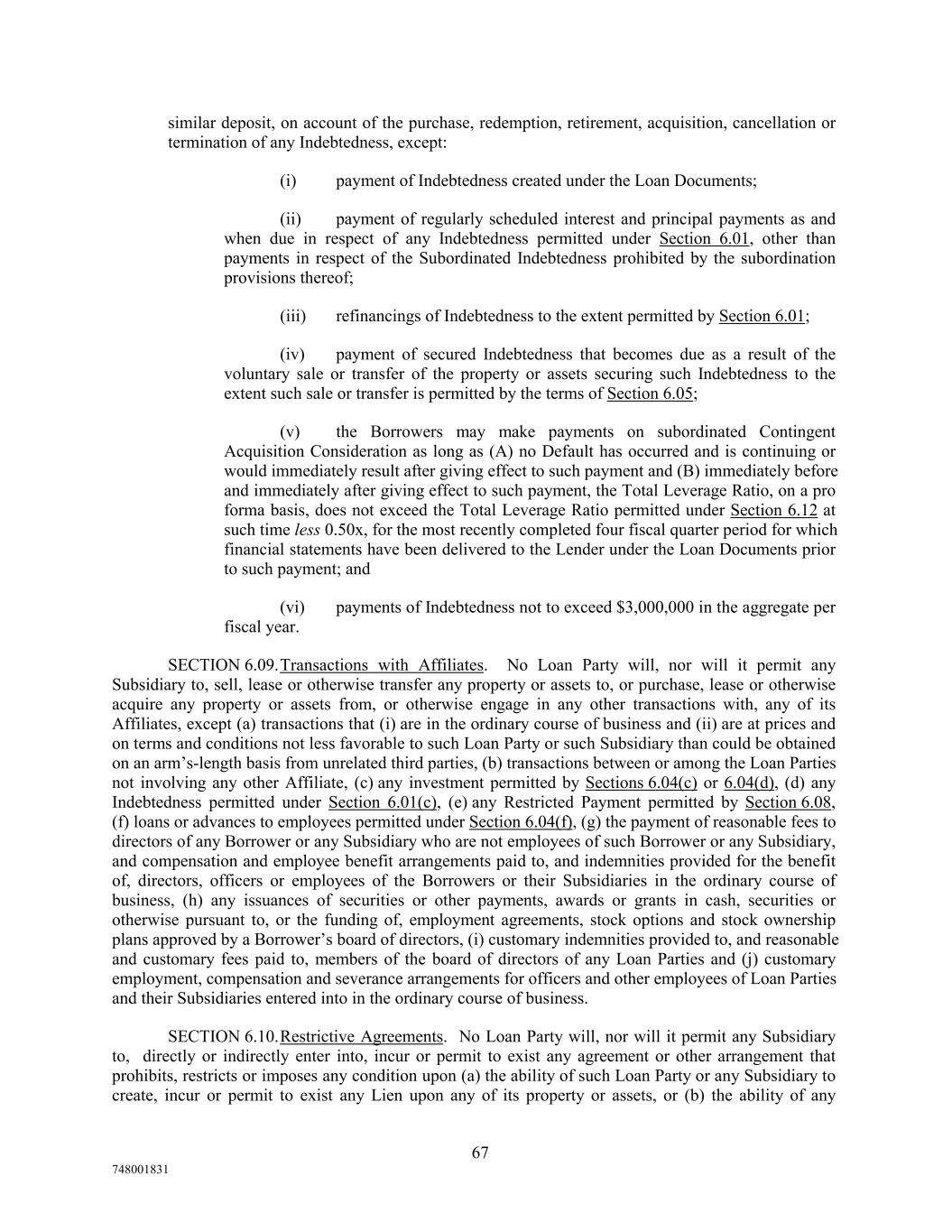 similar deposit, on account of the purchase, redemption, retirement, acquisition, cancellation or termination of any Indebtedness, except: (i) payment of Indebtedness created under the Loan Documents; (ii) payment of regularly scheduled interest and principal payments as and when due in respect of any Indebtedness permitted under Section 6.01, other than payments in respect of the Subordinated Indebtedness prohibited by the subordination provisions thereof; (iii) refinancings of Indebtedness to the extent permitted by Section 6.01; (iv) payment of secured Indebtedness that becomes due as a result of the voluntary sale or transfer of the property or assets securing such Indebtedness to the extent such sale or transfer is permitted by the terms of Section 6.05; (v) the Borrowers may make payments on subordinated Contingent Acquisition Consideration as long as (A) no Default has occurred and is continuing or would immediately result after giving effect to such payment and (B) immediately before and immediately after giving effect to such payment, the Total Leverage Ratio, on a pro forma basis, does not exceed the Total Leverage Ratio permitted under Section 6.12 at such time less 0.50x, for the most recently completed four fiscal quarter period for which financial statements have been delivered to the Lender under the Loan Documents prior to such payment; and (vi) payments of Indebtedness not to exceed $3,000,000 in the aggregate per fiscal year. SECTION 6.09.Transactions with Affiliates. No Loan Party will, nor will it permit any Subsidiary to, sell, lease or otherwise transfer any property or assets to, or purchase, lease or otherwise acquire any property or assets from, or otherwise engage in any other transactions with, any of its Affiliates, except (a) transactions that (i) are in the ordinary course of business and (ii) are at prices and on terms and conditions not less favorable to such Loan Party or such Subsidiary than could be obtained on an arm’s-length basis from unrelated third parties, (b) transactions between or among the Loan Parties not involving any other Affiliate, (c) any investment permitted by Sections 6.04(c) or 6.04(d), (d) any Indebtedness permitted under Section 6.01(c), (e) any Restricted Payment permitted by Section 6.08, (f) loans or advances to employees permitted under Section 6.04(f), (g) the payment of reasonable fees to directors of any Borrower or any Subsidiary who are not employees of such Borrower or any Subsidiary, and compensation and employee benefit arrangements paid to, and indemnities provided for the benefit of, directors, officers or employees of the Borrowers or their Subsidiaries in the ordinary course of business, (h) any issuances of securities or other payments, awards or grants in cash, securities or otherwise pursuant to, or the funding of, employment agreements, stock options and stock ownership plans approved by a Borrower’s board of directors, (i) customary indemnities provided to, and reasonable and customary fees paid to, members of the board of directors of any Loan Parties and (j) customary employment, compensation and severance arrangements for officers and other employees of Loan Parties and their Subsidiaries entered into in the ordinary course of business. SECTION 6.10.Restrictive Agreements. No Loan Party will, nor will it permit any Subsidiary to, directly or indirectly enter into, incur or permit to exist any agreement or other arrangement that prohibits, restricts or imposes any condition upon (a) the ability of such Loan Party or any Subsidiary to create, incur or permit to exist any Lien upon any of its property or assets, or (b) the ability of any 67 748001831