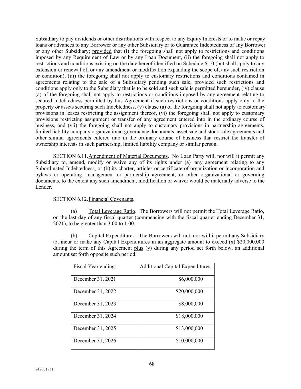68 748001831 December 31, 2023 $8,000,000 December 31, 2021 December 31, 2024 $6,000,000 $18,000,000 Fiscal Year ending: December 31, 2025 $13,000,000 December 31, 2022 Additional Capital Expenditures: December 31, 2026 $20,000,000 $10,000,000 Subsidiary to pay dividends or other distributions with respect to any Equity Interests or to make or repay loans or advances to any Borrower or any other Subsidiary or to Guarantee Indebtedness of any Borrower or any other Subsidiary; provided that (i) the foregoing shall not apply to restrictions and conditions imposed by any Requirement of Law or by any Loan Document, (ii) the foregoing shall not apply to restrictions and conditions existing on the date hereof identified on Schedule 6.10 (but shall apply to any extension or renewal of, or any amendment or modification expanding the scope of, any such restriction or condition), (iii) the foregoing shall not apply to customary restrictions and conditions contained in agreements relating to the sale of a Subsidiary pending such sale, provided such restrictions and conditions apply only to the Subsidiary that is to be sold and such sale is permitted hereunder, (iv) clause (a) of the foregoing shall not apply to restrictions or conditions imposed by any agreement relating to secured Indebtedness permitted by this Agreement if such restrictions or conditions apply only to the property or assets securing such Indebtedness, (v) clause (a) of the foregoing shall not apply to customary provisions in leases restricting the assignment thereof, (vi) the foregoing shall not apply to customary provisions restricting assignment or transfer of any agreement entered into in the ordinary course of business, and (vii) the foregoing shall not apply to customary provisions in partnership agreements, limited liability company organizational governance documents, asset sale and stock sale agreements and other similar agreements entered into in the ordinary course of business that restrict the transfer of ownership interests in such partnership, limited liability company or similar person. SECTION 6.11.Amendment of Material Documents. No Loan Party will, nor will it permit any Subsidiary to, amend, modify or waive any of its rights under (a) any agreement relating to any Subordinated Indebtedness, or (b) its charter, articles or certificate of organization or incorporation and bylaws or operating, management or partnership agreement, or other organizational or governing documents, to the extent any such amendment, modification or waiver would be materially adverse to the Lender. SECTION 6.12.Financial Covenants. (a) Total Leverage Ratio. The Borrowers will not permit the Total Leverage Ratio, on the last day of any fiscal quarter (commencing with the fiscal quarter ending December 31, 2021), to be greater than 3.00 to 1.00. (b) Capital Expenditures. The Borrowers will not, nor will it permit any Subsidiary to, incur or make any Capital Expenditures in an aggregate amount to exceed (x) $20,000,000 during the term of this Agreement plus (y) during any period set forth below, an additional amount set forth opposite such period:
