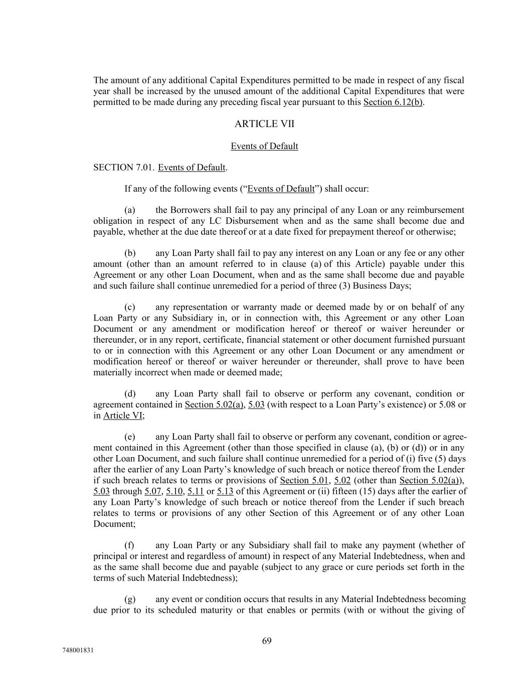 The amount of any additional Capital Expenditures permitted to be made in respect of any fiscal year shall be increased by the unused amount of the additional Capital Expenditures that were permitted to be made during any preceding fiscal year pursuant to this Section 6.12(b). ARTICLE VII Events of Default SECTION 7.01. Events of Default. If any of the following events (“Events of Default”) shall occur: (a) the Borrowers shall fail to pay any principal of any Loan or any reimbursement obligation in respect of any LC Disbursement when and as the same shall become due and payable, whether at the due date thereof or at a date fixed for prepayment thereof or otherwise; (b) any Loan Party shall fail to pay any interest on any Loan or any fee or any other amount (other than an amount referred to in clause (a) of this Article) payable under this Agreement or any other Loan Document, when and as the same shall become due and payable and such failure shall continue unremedied for a period of three (3) Business Days; (c) any representation or warranty made or deemed made by or on behalf of any Loan Party or any Subsidiary in, or in connection with, this Agreement or any other Loan Document or any amendment or modification hereof or thereof or waiver hereunder or thereunder, or in any report, certificate, financial statement or other document furnished pursuant to or in connection with this Agreement or any other Loan Document or any amendment or modification hereof or thereof or waiver hereunder or thereunder, shall prove to have been materially incorrect when made or deemed made; (d) any Loan Party shall fail to observe or perform any covenant, condition or agreement contained in Section 5.02(a), 5.03 (with respect to a Loan Party’s existence) or 5.08 or in Article VI; (e) any Loan Party shall fail to observe or perform any covenant, condition or agree- ment contained in this Agreement (other than those specified in clause (a), (b) or (d)) or in any other Loan Document, and such failure shall continue unremedied for a period of (i) five (5) days after the earlier of any Loan Party’s knowledge of such breach or notice thereof from the Lender if such breach relates to terms or provisions of Section 5.01, 5.02 (other than Section 5.02(a)), 5.03 through 5.07, 5.10, 5.11 or 5.13 of this Agreement or (ii) fifteen (15) days after the earlier of any Loan Party’s knowledge of such breach or notice thereof from the Lender if such breach relates to terms or provisions of any other Section of this Agreement or of any other Loan Document; (f) any Loan Party or any Subsidiary shall fail to make any payment (whether of principal or interest and regardless of amount) in respect of any Material Indebtedness, when and as the same shall become due and payable (subject to any grace or cure periods set forth in the terms of such Material Indebtedness); (g) any event or condition occurs that results in any Material Indebtedness becoming due prior to its scheduled maturity or that enables or permits (with or without the giving of 69 748001831
