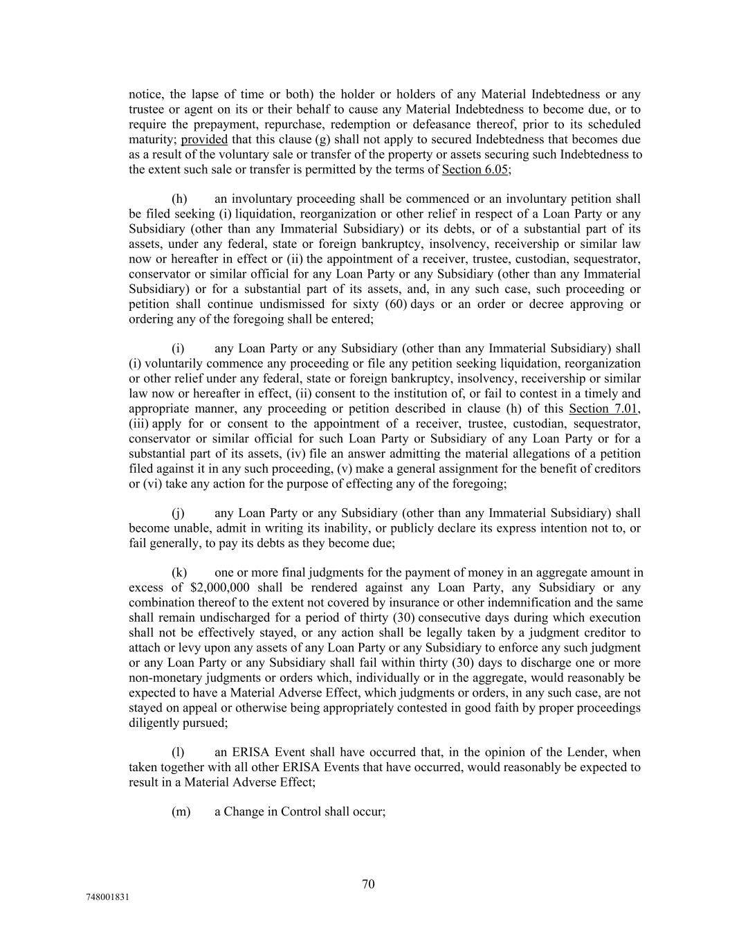 notice, the lapse of time or both) the holder or holders of any Material Indebtedness or any trustee or agent on its or their behalf to cause any Material Indebtedness to become due, or to require the prepayment, repurchase, redemption or defeasance thereof, prior to its scheduled maturity; provided that this clause (g) shall not apply to secured Indebtedness that becomes due as a result of the voluntary sale or transfer of the property or assets securing such Indebtedness to the extent such sale or transfer is permitted by the terms of Section 6.05; (h) an involuntary proceeding shall be commenced or an involuntary petition shall be filed seeking (i) liquidation, reorganization or other relief in respect of a Loan Party or any Subsidiary (other than any Immaterial Subsidiary) or its debts, or of a substantial part of its assets, under any federal, state or foreign bankruptcy, insolvency, receivership or similar law now or hereafter in effect or (ii) the appointment of a receiver, trustee, custodian, sequestrator, conservator or similar official for any Loan Party or any Subsidiary (other than any Immaterial Subsidiary) or for a substantial part of its assets, and, in any such case, such proceeding or petition shall continue undismissed for sixty (60) days or an order or decree approving or ordering any of the foregoing shall be entered; (i) any Loan Party or any Subsidiary (other than any Immaterial Subsidiary) shall (i) voluntarily commence any proceeding or file any petition seeking liquidation, reorganization or other relief under any federal, state or foreign bankruptcy, insolvency, receivership or similar law now or hereafter in effect, (ii) consent to the institution of, or fail to contest in a timely and appropriate manner, any proceeding or petition described in clause (h) of this Section 7.01, (iii) apply for or consent to the appointment of a receiver, trustee, custodian, sequestrator, conservator or similar official for such Loan Party or Subsidiary of any Loan Party or for a substantial part of its assets, (iv) file an answer admitting the material allegations of a petition filed against it in any such proceeding, (v) make a general assignment for the benefit of creditors or (vi) take any action for the purpose of effecting any of the foregoing; (j) any Loan Party or any Subsidiary (other than any Immaterial Subsidiary) shall become unable, admit in writing its inability, or publicly declare its express intention not to, or fail generally, to pay its debts as they become due; (k) one or more final judgments for the payment of money in an aggregate amount in excess of $2,000,000 shall be rendered against any Loan Party, any Subsidiary or any combination thereof to the extent not covered by insurance or other indemnification and the same shall remain undischarged for a period of thirty (30) consecutive days during which execution shall not be effectively stayed, or any action shall be legally taken by a judgment creditor to attach or levy upon any assets of any Loan Party or any Subsidiary to enforce any such judgment or any Loan Party or any Subsidiary shall fail within thirty (30) days to discharge one or more non-monetary judgments or orders which, individually or in the aggregate, would reasonably be expected to have a Material Adverse Effect, which judgments or orders, in any such case, are not stayed on appeal or otherwise being appropriately contested in good faith by proper proceedings diligently pursued; (l) an ERISA Event shall have occurred that, in the opinion of the Lender, when taken together with all other ERISA Events that have occurred, would reasonably be expected to result in a Material Adverse Effect; (m) a Change in Control shall occur; 70 748001831