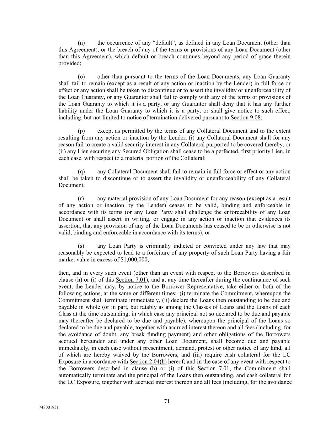 (n) the occurrence of any “default”, as defined in any Loan Document (other than this Agreement), or the breach of any of the terms or provisions of any Loan Document (other than this Agreement), which default or breach continues beyond any period of grace therein provided; (o) other than pursuant to the terms of the Loan Documents, any Loan Guaranty shall fail to remain (except as a result of any action or inaction by the Lender) in full force or effect or any action shall be taken to discontinue or to assert the invalidity or unenforceability of the Loan Guaranty, or any Guarantor shall fail to comply with any of the terms or provisions of the Loan Guaranty to which it is a party, or any Guarantor shall deny that it has any further liability under the Loan Guaranty to which it is a party, or shall give notice to such effect, including, but not limited to notice of termination delivered pursuant to Section 9.08; (p) except as permitted by the terms of any Collateral Document and to the extent resulting from any action or inaction by the Lender, (i) any Collateral Document shall for any reason fail to create a valid security interest in any Collateral purported to be covered thereby, or (ii) any Lien securing any Secured Obligation shall cease to be a perfected, first priority Lien, in each case, with respect to a material portion of the Collateral; (q) any Collateral Document shall fail to remain in full force or effect or any action shall be taken to discontinue or to assert the invalidity or unenforceability of any Collateral Document; (r) any material provision of any Loan Document for any reason (except as a result of any action or inaction by the Lender) ceases to be valid, binding and enforceable in accordance with its terms (or any Loan Party shall challenge the enforceability of any Loan Document or shall assert in writing, or engage in any action or inaction that evidences its assertion, that any provision of any of the Loan Documents has ceased to be or otherwise is not valid, binding and enforceable in accordance with its terms); or (s) any Loan Party is criminally indicted or convicted under any law that may reasonably be expected to lead to a forfeiture of any property of such Loan Party having a fair market value in excess of $1,000,000; then, and in every such event (other than an event with respect to the Borrowers described in clause (h) or (i) of this Section 7.01), and at any time thereafter during the continuance of such event, the Lender may, by notice to the Borrower Representative, take either or both of the following actions, at the same or different times: (i) terminate the Commitment, whereupon the Commitment shall terminate immediately, (ii) declare the Loans then outstanding to be due and payable in whole (or in part, but ratably as among the Classes of Loans and the Loans of each Class at the time outstanding, in which case any principal not so declared to be due and payable may thereafter be declared to be due and payable), whereupon the principal of the Loans so declared to be due and payable, together with accrued interest thereon and all fees (including, for the avoidance of doubt, any break funding payment) and other obligations of the Borrowers accrued hereunder and under any other Loan Document, shall become due and payable immediately, in each case without presentment, demand, protest or other notice of any kind, all of which are hereby waived by the Borrowers, and (iii) require cash collateral for the LC Exposure in accordance with Section 2.04(h) hereof; and in the case of any event with respect to the Borrowers described in clause (h) or (i) of this Section 7.01, the Commitment shall automatically terminate and the principal of the Loans then outstanding, and cash collateral for the LC Exposure, together with accrued interest thereon and all fees (including, for the avoidance 71 748001831