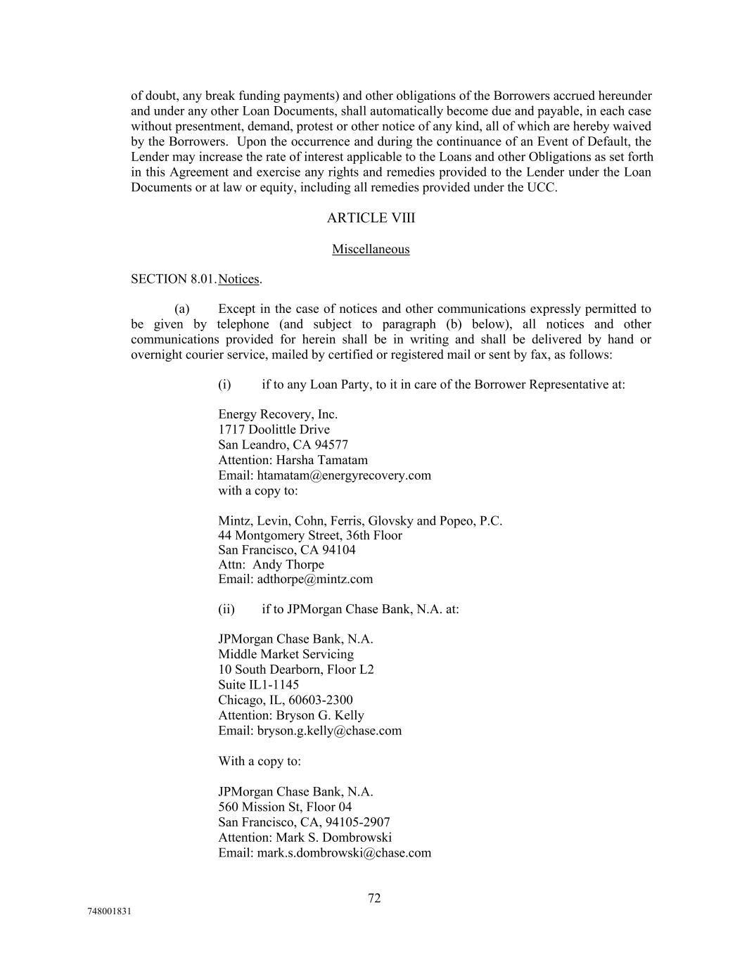 of doubt, any break funding payments) and other obligations of the Borrowers accrued hereunder and under any other Loan Documents, shall automatically become due and payable, in each case without presentment, demand, protest or other notice of any kind, all of which are hereby waived by the Borrowers. Upon the occurrence and during the continuance of an Event of Default, the Lender may increase the rate of interest applicable to the Loans and other Obligations as set forth in this Agreement and exercise any rights and remedies provided to the Lender under the Loan Documents or at law or equity, including all remedies provided under the UCC. ARTICLE VIII Miscellaneous SECTION 8.01.Notices. (a) Except in the case of notices and other communications expressly permitted to be given by telephone (and subject to paragraph (b) below), all notices and other communications provided for herein shall be in writing and shall be delivered by hand or overnight courier service, mailed by certified or registered mail or sent by fax, as follows: (i) if to any Loan Party, to it in care of the Borrower Representative at: Energy Recovery, Inc. 1717 Doolittle Drive San Leandro, CA 94577 Attention: Harsha Tamatam Email: htamatam@energyrecovery.com with a copy to: Mintz, Levin, Cohn, Ferris, Glovsky and Popeo, P.C. 44 Montgomery Street, 36th Floor San Francisco, CA 94104 Attn: Andy Thorpe Email: adthorpe@mintz.com (ii) if to JPMorgan Chase Bank, N.A. at: JPMorgan Chase Bank, N.A. Middle Market Servicing 10 South Dearborn, Floor L2 Suite IL1-1145 Chicago, IL, 60603-2300 Attention: Bryson G. Kelly Email: bryson.g.kelly@chase.com With a copy to: JPMorgan Chase Bank, N.A. 560 Mission St, Floor 04 San Francisco, CA, 94105-2907 Attention: Mark S. Dombrowski Email: mark.s.dombrowski@chase.com 72 748001831