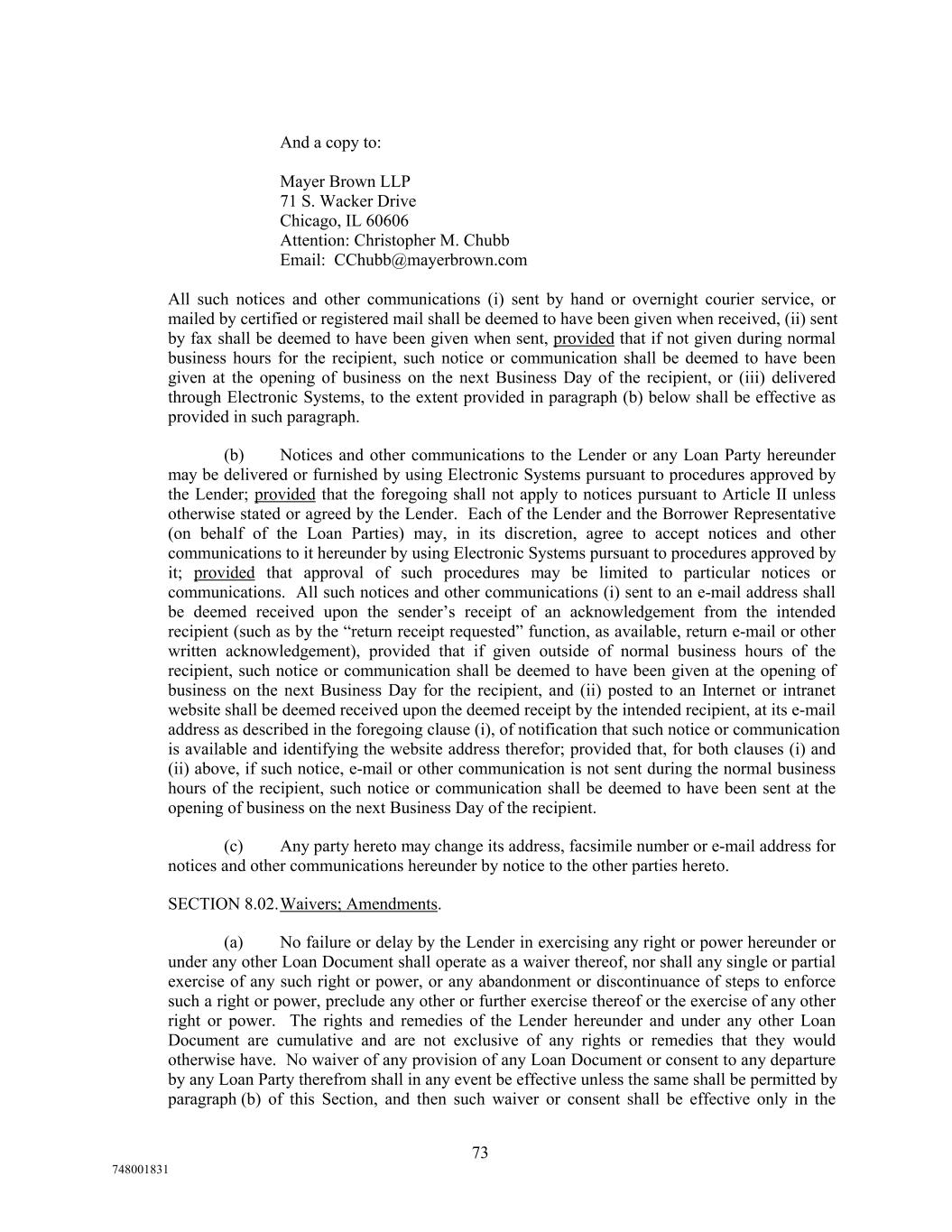 And a copy to: Mayer Brown LLP 71 S. Wacker Drive Chicago, IL 60606 Attention: Christopher M. Chubb Email: CChubb@mayerbrown.com All such notices and other communications (i) sent by hand or overnight courier service, or mailed by certified or registered mail shall be deemed to have been given when received, (ii) sent by fax shall be deemed to have been given when sent, provided that if not given during normal business hours for the recipient, such notice or communication shall be deemed to have been given at the opening of business on the next Business Day of the recipient, or (iii) delivered through Electronic Systems, to the extent provided in paragraph (b) below shall be effective as provided in such paragraph. (b) Notices and other communications to the Lender or any Loan Party hereunder may be delivered or furnished by using Electronic Systems pursuant to procedures approved by the Lender; provided that the foregoing shall not apply to notices pursuant to Article II unless otherwise stated or agreed by the Lender. Each of the Lender and the Borrower Representative (on behalf of the Loan Parties) may, in its discretion, agree to accept notices and other communications to it hereunder by using Electronic Systems pursuant to procedures approved by it; provided that approval of such procedures may be limited to particular notices or communications. All such notices and other communications (i) sent to an e-mail address shall be deemed received upon the sender’s receipt of an acknowledgement from the intended recipient (such as by the “return receipt requested” function, as available, return e-mail or other written acknowledgement), provided that if given outside of normal business hours of the recipient, such notice or communication shall be deemed to have been given at the opening of business on the next Business Day for the recipient, and (ii) posted to an Internet or intranet website shall be deemed received upon the deemed receipt by the intended recipient, at its e-mail address as described in the foregoing clause (i), of notification that such notice or communication is available and identifying the website address therefor; provided that, for both clauses (i) and (ii) above, if such notice, e-mail or other communication is not sent during the normal business hours of the recipient, such notice or communication shall be deemed to have been sent at the opening of business on the next Business Day of the recipient. (c) Any party hereto may change its address, facsimile number or e-mail address for notices and other communications hereunder by notice to the other parties hereto. SECTION 8.02.Waivers; Amendments. (a) No failure or delay by the Lender in exercising any right or power hereunder or under any other Loan Document shall operate as a waiver thereof, nor shall any single or partial exercise of any such right or power, or any abandonment or discontinuance of steps to enforce such a right or power, preclude any other or further exercise thereof or the exercise of any other right or power. The rights and remedies of the Lender hereunder and under any other Loan Document are cumulative and are not exclusive of any rights or remedies that they would otherwise have. No waiver of any provision of any Loan Document or consent to any departure by any Loan Party therefrom shall in any event be effective unless the same shall be permitted by paragraph (b) of this Section, and then such waiver or consent shall be effective only in the 73 748001831