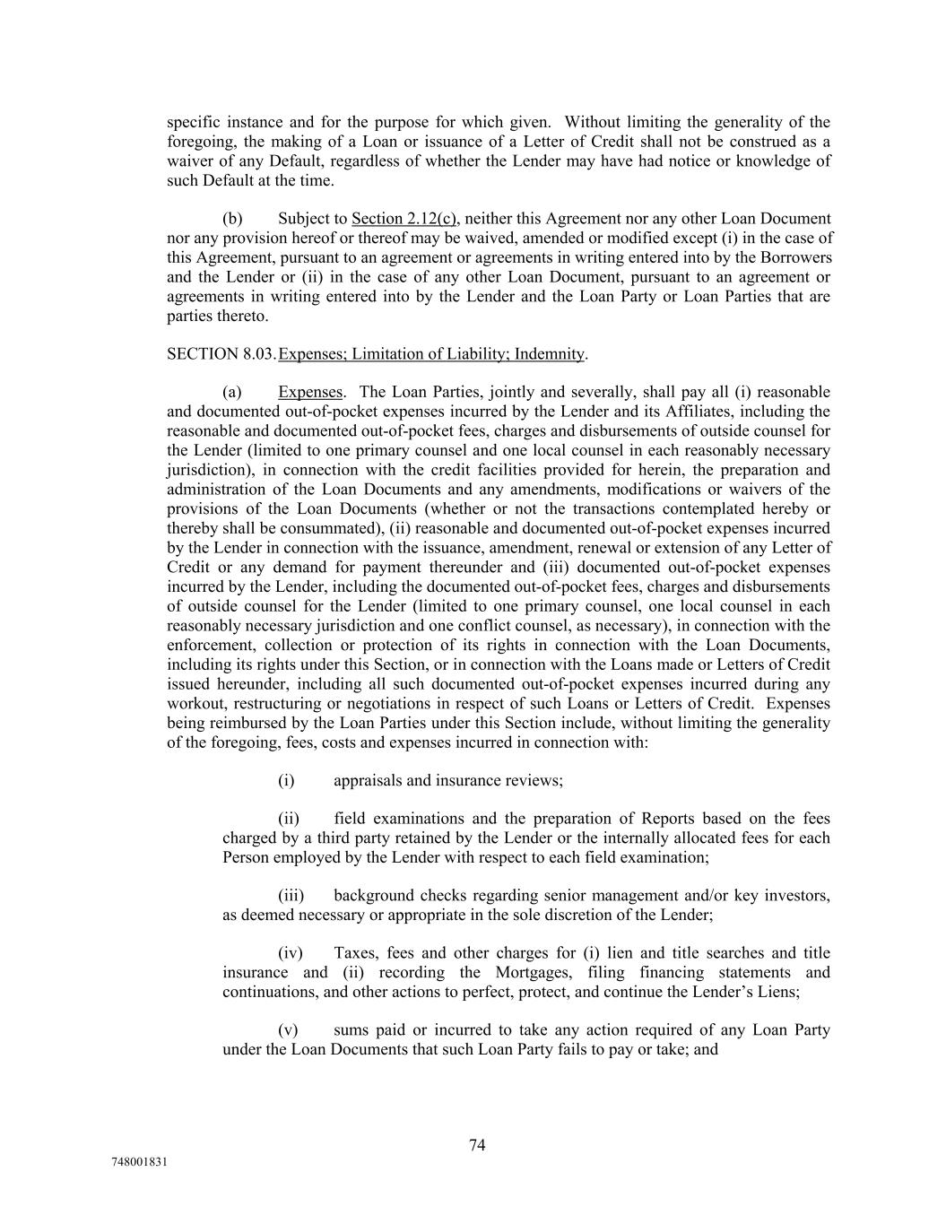 specific instance and for the purpose for which given. Without limiting the generality of the foregoing, the making of a Loan or issuance of a Letter of Credit shall not be construed as a waiver of any Default, regardless of whether the Lender may have had notice or knowledge of such Default at the time. (b) Subject to Section 2.12(c), neither this Agreement nor any other Loan Document nor any provision hereof or thereof may be waived, amended or modified except (i) in the case of this Agreement, pursuant to an agreement or agreements in writing entered into by the Borrowers and the Lender or (ii) in the case of any other Loan Document, pursuant to an agreement or agreements in writing entered into by the Lender and the Loan Party or Loan Parties that are parties thereto. SECTION 8.03.Expenses; Limitation of Liability; Indemnity. (a) Expenses. The Loan Parties, jointly and severally, shall pay all (i) reasonable and documented out-of-pocket expenses incurred by the Lender and its Affiliates, including the reasonable and documented out-of-pocket fees, charges and disbursements of outside counsel for the Lender (limited to one primary counsel and one local counsel in each reasonably necessary jurisdiction), in connection with the credit facilities provided for herein, the preparation and administration of the Loan Documents and any amendments, modifications or waivers of the provisions of the Loan Documents (whether or not the transactions contemplated hereby or thereby shall be consummated), (ii) reasonable and documented out-of-pocket expenses incurred by the Lender in connection with the issuance, amendment, renewal or extension of any Letter of Credit or any demand for payment thereunder and (iii) documented out-of-pocket expenses incurred by the Lender, including the documented out-of-pocket fees, charges and disbursements of outside counsel for the Lender (limited to one primary counsel, one local counsel in each reasonably necessary jurisdiction and one conflict counsel, as necessary), in connection with the enforcement, collection or protection of its rights in connection with the Loan Documents, including its rights under this Section, or in connection with the Loans made or Letters of Credit issued hereunder, including all such documented out-of-pocket expenses incurred during any workout, restructuring or negotiations in respect of such Loans or Letters of Credit. Expenses being reimbursed by the Loan Parties under this Section include, without limiting the generality of the foregoing, fees, costs and expenses incurred in connection with: (i) appraisals and insurance reviews; (ii) field examinations and the preparation of Reports based on the fees charged by a third party retained by the Lender or the internally allocated fees for each Person employed by the Lender with respect to each field examination; (iii) background checks regarding senior management and/or key investors, as deemed necessary or appropriate in the sole discretion of the Lender; (iv) Taxes, fees and other charges for (i) lien and title searches and title insurance and (ii) recording the Mortgages, filing financing statements and continuations, and other actions to perfect, protect, and continue the Lender’s Liens; (v) sums paid or incurred to take any action required of any Loan Party under the Loan Documents that such Loan Party fails to pay or take; and 74 748001831