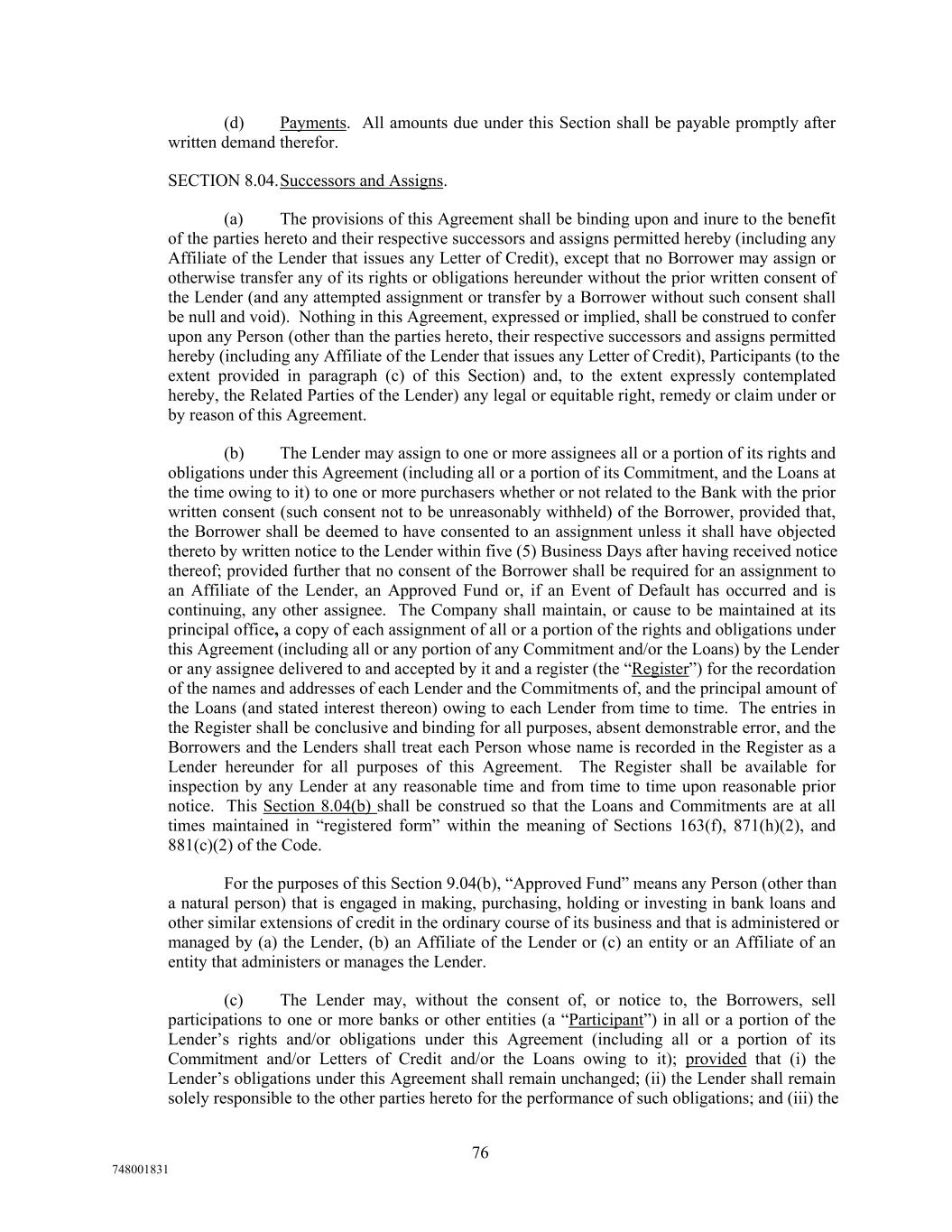 (d) Payments. All amounts due under this Section shall be payable promptly after written demand therefor. SECTION 8.04.Successors and Assigns. (a) The provisions of this Agreement shall be binding upon and inure to the benefit of the parties hereto and their respective successors and assigns permitted hereby (including any Affiliate of the Lender that issues any Letter of Credit), except that no Borrower may assign or otherwise transfer any of its rights or obligations hereunder without the prior written consent of the Lender (and any attempted assignment or transfer by a Borrower without such consent shall be null and void). Nothing in this Agreement, expressed or implied, shall be construed to confer upon any Person (other than the parties hereto, their respective successors and assigns permitted hereby (including any Affiliate of the Lender that issues any Letter of Credit), Participants (to the extent provided in paragraph (c) of this Section) and, to the extent expressly contemplated hereby, the Related Parties of the Lender) any legal or equitable right, remedy or claim under or by reason of this Agreement. (b) The Lender may assign to one or more assignees all or a portion of its rights and obligations under this Agreement (including all or a portion of its Commitment, and the Loans at the time owing to it) to one or more purchasers whether or not related to the Bank with the prior written consent (such consent not to be unreasonably withheld) of the Borrower, provided that, the Borrower shall be deemed to have consented to an assignment unless it shall have objected thereto by written notice to the Lender within five (5) Business Days after having received notice thereof; provided further that no consent of the Borrower shall be required for an assignment to an Affiliate of the Lender, an Approved Fund or, if an Event of Default has occurred and is continuing, any other assignee. The Company shall maintain, or cause to be maintained at its principal office, a copy of each assignment of all or a portion of the rights and obligations under this Agreement (including all or any portion of any Commitment and/or the Loans) by the Lender or any assignee delivered to and accepted by it and a register (the “Register”) for the recordation of the names and addresses of each Lender and the Commitments of, and the principal amount of the Loans (and stated interest thereon) owing to each Lender from time to time. The entries in the Register shall be conclusive and binding for all purposes, absent demonstrable error, and the Borrowers and the Lenders shall treat each Person whose name is recorded in the Register as a Lender hereunder for all purposes of this Agreement. The Register shall be available for inspection by any Lender at any reasonable time and from time to time upon reasonable prior notice. This Section 8.04(b) shall be construed so that the Loans and Commitments are at all times maintained in “registered form” within the meaning of Sections 163(f), 871(h)(2), and 881(c)(2) of the Code. For the purposes of this Section 9.04(b), “Approved Fund” means any Person (other than a natural person) that is engaged in making, purchasing, holding or investing in bank loans and other similar extensions of credit in the ordinary course of its business and that is administered or managed by (a) the Lender, (b) an Affiliate of the Lender or (c) an entity or an Affiliate of an entity that administers or manages the Lender. (c) The Lender may, without the consent of, or notice to, the Borrowers, sell participations to one or more banks or other entities (a “Participant”) in all or a portion of the Lender’s rights and/or obligations under this Agreement (including all or a portion of its Commitment and/or Letters of Credit and/or the Loans owing to it); provided that (i) the Lender’s obligations under this Agreement shall remain unchanged; (ii) the Lender shall remain solely responsible to the other parties hereto for the performance of such obligations; and (iii) the 76 748001831