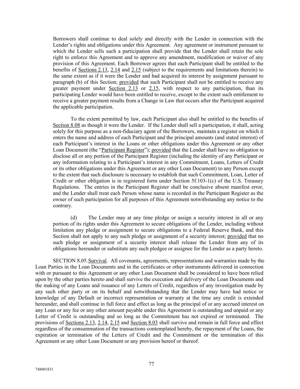 Borrowers shall continue to deal solely and directly with the Lender in connection with the Lender’s rights and obligations under this Agreement. Any agreement or instrument pursuant to which the Lender sells such a participation shall provide that the Lender shall retain the sole right to enforce this Agreement and to approve any amendment, modification or waiver of any provision of this Agreement. Each Borrower agrees that each Participant shall be entitled to the benefits of Sections 2.13, 2.14 and 2.15 (subject to the requirements and limitations therein) to the same extent as if it were the Lender and had acquired its interest by assignment pursuant to paragraph (b) of this Section; provided that such Participant shall not be entitled to receive any greater payment under Section 2.13 or 2.15, with respect to any participation, than its participating Lender would have been entitled to receive, except to the extent such entitlement to receive a greater payment results from a Change in Law that occurs after the Participant acquired the applicable participation. To the extent permitted by law, each Participant also shall be entitled to the benefits of Section 8.08 as though it were the Lender. If the Lender shall sell a participation, it shall, acting solely for this purpose as a non-fiduciary agent of the Borrowers, maintain a register on which it enters the name and address of each Participant and the principal amounts (and stated interest) of each Participant’s interest in the Loans or other obligations under this Agreement or any other Loan Document (the “Participant Register”); provided that the Lender shall have no obligation to disclose all or any portion of the Participant Register (including the identity of any Participant or any information relating to a Participant’s interest in any Commitment, Loans, Letters of Credit or its other obligations under this Agreement or any other Loan Document) to any Person except to the extent that such disclosure is necessary to establish that such Commitment, Loan, Letter of Credit or other obligation is in registered form under Section 5f.103-1(c) of the U.S. Treasury Regulations. The entries in the Participant Register shall be conclusive absent manifest error, and the Lender shall treat each Person whose name is recorded in the Participant Register as the owner of such participation for all purposes of this Agreement notwithstanding any notice to the contrary. (d) The Lender may at any time pledge or assign a security interest in all or any portion of its rights under this Agreement to secure obligations of the Lender, including without limitation any pledge or assignment to secure obligations to a Federal Reserve Bank, and this Section shall not apply to any such pledge or assignment of a security interest; provided that no such pledge or assignment of a security interest shall release the Lender from any of its obligations hereunder or substitute any such pledgee or assignee for the Lender as a party hereto. SECTION 8.05.Survival. All covenants, agreements, representations and warranties made by the Loan Parties in the Loan Documents and in the certificates or other instruments delivered in connection with or pursuant to this Agreement or any other Loan Document shall be considered to have been relied upon by the other parties hereto and shall survive the execution and delivery of the Loan Documents and the making of any Loans and issuance of any Letters of Credit, regardless of any investigation made by any such other party or on its behalf and notwithstanding that the Lender may have had notice or knowledge of any Default or incorrect representation or warranty at the time any credit is extended hereunder, and shall continue in full force and effect as long as the principal of or any accrued interest on any Loan or any fee or any other amount payable under this Agreement is outstanding and unpaid or any Letter of Credit is outstanding and so long as the Commitment has not expired or terminated. The provisions of Sections 2.13, 2.14, 2.15 and Section 8.03 shall survive and remain in full force and effect regardless of the consummation of the transactions contemplated hereby, the repayment of the Loans, the expiration or termination of the Letters of Credit and the Commitment or the termination of this Agreement or any other Loan Document or any provision hereof or thereof. 77 748001831