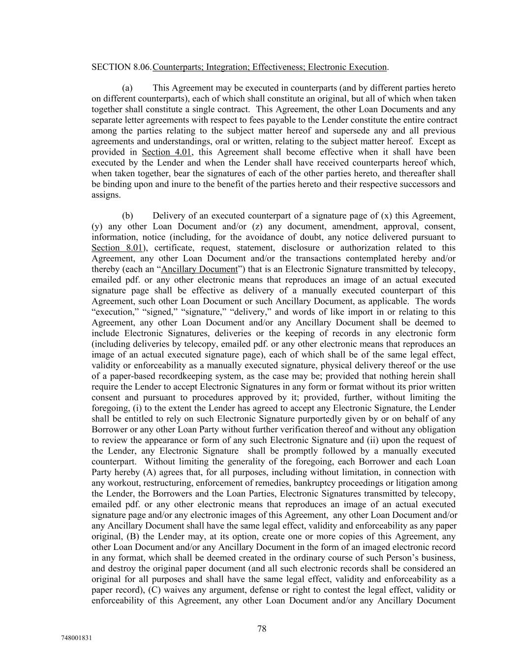 SECTION 8.06.Counterparts; Integration; Effectiveness; Electronic Execution. (a) This Agreement may be executed in counterparts (and by different parties hereto on different counterparts), each of which shall constitute an original, but all of which when taken together shall constitute a single contract. This Agreement, the other Loan Documents and any separate letter agreements with respect to fees payable to the Lender constitute the entire contract among the parties relating to the subject matter hereof and supersede any and all previous agreements and understandings, oral or written, relating to the subject matter hereof. Except as provided in Section 4.01, this Agreement shall become effective when it shall have been executed by the Lender and when the Lender shall have received counterparts hereof which, when taken together, bear the signatures of each of the other parties hereto, and thereafter shall be binding upon and inure to the benefit of the parties hereto and their respective successors and assigns. (b) Delivery of an executed counterpart of a signature page of (x) this Agreement, (y) any other Loan Document and/or (z) any document, amendment, approval, consent, information, notice (including, for the avoidance of doubt, any notice delivered pursuant to Section 8.01), certificate, request, statement, disclosure or authorization related to this Agreement, any other Loan Document and/or the transactions contemplated hereby and/or thereby (each an “Ancillary Document”) that is an Electronic Signature transmitted by telecopy, emailed pdf. or any other electronic means that reproduces an image of an actual executed signature page shall be effective as delivery of a manually executed counterpart of this Agreement, such other Loan Document or such Ancillary Document, as applicable. The words “execution,” “signed,” “signature,” “delivery,” and words of like import in or relating to this Agreement, any other Loan Document and/or any Ancillary Document shall be deemed to include Electronic Signatures, deliveries or the keeping of records in any electronic form (including deliveries by telecopy, emailed pdf. or any other electronic means that reproduces an image of an actual executed signature page), each of which shall be of the same legal effect, validity or enforceability as a manually executed signature, physical delivery thereof or the use of a paper-based recordkeeping system, as the case may be; provided that nothing herein shall require the Lender to accept Electronic Signatures in any form or format without its prior written consent and pursuant to procedures approved by it; provided, further, without limiting the foregoing, (i) to the extent the Lender has agreed to accept any Electronic Signature, the Lender shall be entitled to rely on such Electronic Signature purportedly given by or on behalf of any Borrower or any other Loan Party without further verification thereof and without any obligation to review the appearance or form of any such Electronic Signature and (ii) upon the request of the Lender, any Electronic Signature shall be promptly followed by a manually executed counterpart. Without limiting the generality of the foregoing, each Borrower and each Loan Party hereby (A) agrees that, for all purposes, including without limitation, in connection with any workout, restructuring, enforcement of remedies, bankruptcy proceedings or litigation among the Lender, the Borrowers and the Loan Parties, Electronic Signatures transmitted by telecopy, emailed pdf. or any other electronic means that reproduces an image of an actual executed signature page and/or any electronic images of this Agreement, any other Loan Document and/or any Ancillary Document shall have the same legal effect, validity and enforceability as any paper original, (B) the Lender may, at its option, create one or more copies of this Agreement, any other Loan Document and/or any Ancillary Document in the form of an imaged electronic record in any format, which shall be deemed created in the ordinary course of such Person’s business, and destroy the original paper document (and all such electronic records shall be considered an original for all purposes and shall have the same legal effect, validity and enforceability as a paper record), (C) waives any argument, defense or right to contest the legal effect, validity or enforceability of this Agreement, any other Loan Document and/or any Ancillary Document 78 748001831