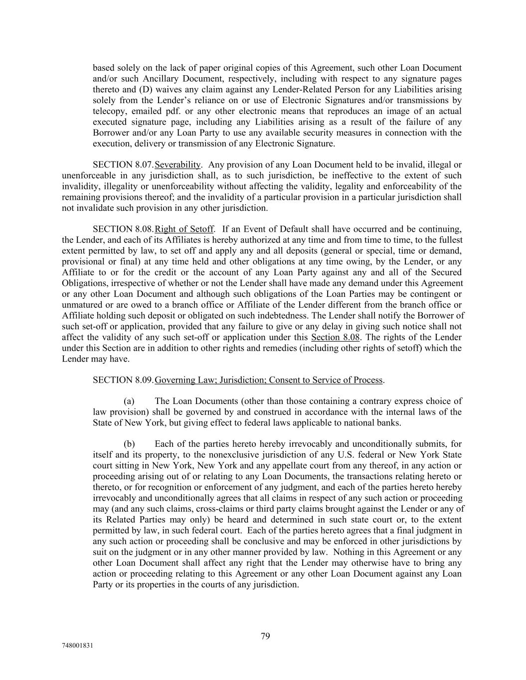 based solely on the lack of paper original copies of this Agreement, such other Loan Document and/or such Ancillary Document, respectively, including with respect to any signature pages thereto and (D) waives any claim against any Lender-Related Person for any Liabilities arising solely from the Lender’s reliance on or use of Electronic Signatures and/or transmissions by telecopy, emailed pdf. or any other electronic means that reproduces an image of an actual executed signature page, including any Liabilities arising as a result of the failure of any Borrower and/or any Loan Party to use any available security measures in connection with the execution, delivery or transmission of any Electronic Signature. SECTION 8.07.Severability. Any provision of any Loan Document held to be invalid, illegal or unenforceable in any jurisdiction shall, as to such jurisdiction, be ineffective to the extent of such invalidity, illegality or unenforceability without affecting the validity, legality and enforceability of the remaining provisions thereof; and the invalidity of a particular provision in a particular jurisdiction shall not invalidate such provision in any other jurisdiction. SECTION 8.08.Right of Setoff. If an Event of Default shall have occurred and be continuing, the Lender, and each of its Affiliates is hereby authorized at any time and from time to time, to the fullest extent permitted by law, to set off and apply any and all deposits (general or special, time or demand, provisional or final) at any time held and other obligations at any time owing, by the Lender, or any Affiliate to or for the credit or the account of any Loan Party against any and all of the Secured Obligations, irrespective of whether or not the Lender shall have made any demand under this Agreement or any other Loan Document and although such obligations of the Loan Parties may be contingent or unmatured or are owed to a branch office or Affiliate of the Lender different from the branch office or Affiliate holding such deposit or obligated on such indebtedness. The Lender shall notify the Borrower of such set-off or application, provided that any failure to give or any delay in giving such notice shall not affect the validity of any such set-off or application under this Section 8.08. The rights of the Lender under this Section are in addition to other rights and remedies (including other rights of setoff) which the Lender may have. SECTION 8.09.Governing Law; Jurisdiction; Consent to Service of Process. (a) The Loan Documents (other than those containing a contrary express choice of law provision) shall be governed by and construed in accordance with the internal laws of the State of New York, but giving effect to federal laws applicable to national banks. (b) Each of the parties hereto hereby irrevocably and unconditionally submits, for itself and its property, to the nonexclusive jurisdiction of any U.S. federal or New York State court sitting in New York, New York and any appellate court from any thereof, in any action or proceeding arising out of or relating to any Loan Documents, the transactions relating hereto or thereto, or for recognition or enforcement of any judgment, and each of the parties hereto hereby irrevocably and unconditionally agrees that all claims in respect of any such action or proceeding may (and any such claims, cross-claims or third party claims brought against the Lender or any of its Related Parties may only) be heard and determined in such state court or, to the extent permitted by law, in such federal court. Each of the parties hereto agrees that a final judgment in any such action or proceeding shall be conclusive and may be enforced in other jurisdictions by suit on the judgment or in any other manner provided by law. Nothing in this Agreement or any other Loan Document shall affect any right that the Lender may otherwise have to bring any action or proceeding relating to this Agreement or any other Loan Document against any Loan Party or its properties in the courts of any jurisdiction. 79 748001831