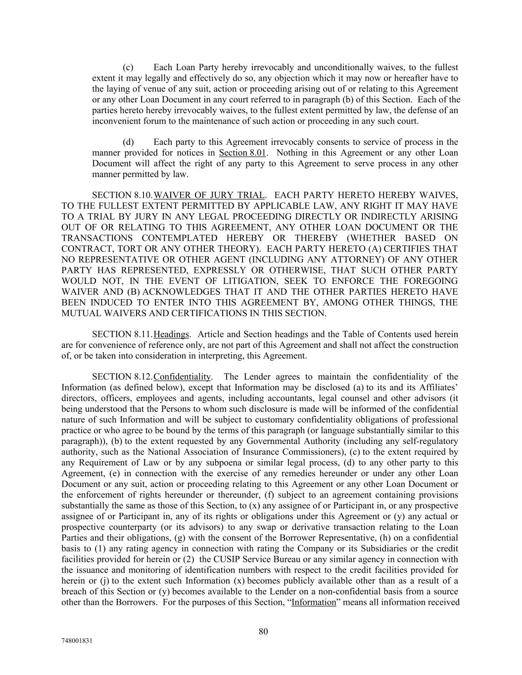 (c) Each Loan Party hereby irrevocably and unconditionally waives, to the fullest extent it may legally and effectively do so, any objection which it may now or hereafter have to the laying of venue of any suit, action or proceeding arising out of or relating to this Agreement or any other Loan Document in any court referred to in paragraph (b) of this Section. Each of the parties hereto hereby irrevocably waives, to the fullest extent permitted by law, the defense of an inconvenient forum to the maintenance of such action or proceeding in any such court. (d) Each party to this Agreement irrevocably consents to service of process in the manner provided for notices in Section 8.01. Nothing in this Agreement or any other Loan Document will affect the right of any party to this Agreement to serve process in any other manner permitted by law. SECTION 8.10.WAIVER OF JURY TRIAL. EACH PARTY HERETO HEREBY WAIVES, TO THE FULLEST EXTENT PERMITTED BY APPLICABLE LAW, ANY RIGHT IT MAY HAVE TO A TRIAL BY JURY IN ANY LEGAL PROCEEDING DIRECTLY OR INDIRECTLY ARISING OUT OF OR RELATING TO THIS AGREEMENT, ANY OTHER LOAN DOCUMENT OR THE TRANSACTIONS CONTEMPLATED HEREBY OR THEREBY (WHETHER BASED ON CONTRACT, TORT OR ANY OTHER THEORY). EACH PARTY HERETO (A) CERTIFIES THAT NO REPRESENTATIVE OR OTHER AGENT (INCLUDING ANY ATTORNEY) OF ANY OTHER PARTY HAS REPRESENTED, EXPRESSLY OR OTHERWISE, THAT SUCH OTHER PARTY WOULD NOT, IN THE EVENT OF LITIGATION, SEEK TO ENFORCE THE FOREGOING WAIVER AND (B) ACKNOWLEDGES THAT IT AND THE OTHER PARTIES HERETO HAVE BEEN INDUCED TO ENTER INTO THIS AGREEMENT BY, AMONG OTHER THINGS, THE MUTUAL WAIVERS AND CERTIFICATIONS IN THIS SECTION. SECTION 8.11.Headings. Article and Section headings and the Table of Contents used herein are for convenience of reference only, are not part of this Agreement and shall not affect the construction of, or be taken into consideration in interpreting, this Agreement. SECTION 8.12.Confidentiality. The Lender agrees to maintain the confidentiality of the Information (as defined below), except that Information may be disclosed (a) to its and its Affiliates’ directors, officers, employees and agents, including accountants, legal counsel and other advisors (it being understood that the Persons to whom such disclosure is made will be informed of the confidential nature of such Information and will be subject to customary confidentiality obligations of professional practice or who agree to be bound by the terms of this paragraph (or language substantially similar to this paragraph)), (b) to the extent requested by any Governmental Authority (including any self-regulatory authority, such as the National Association of Insurance Commissioners), (c) to the extent required by any Requirement of Law or by any subpoena or similar legal process, (d) to any other party to this Agreement, (e) in connection with the exercise of any remedies hereunder or under any other Loan Document or any suit, action or proceeding relating to this Agreement or any other Loan Document or the enforcement of rights hereunder or thereunder, (f) subject to an agreement containing provisions substantially the same as those of this Section, to (x) any assignee of or Participant in, or any prospective assignee of or Participant in, any of its rights or obligations under this Agreement or (y) any actual or prospective counterparty (or its advisors) to any swap or derivative transaction relating to the Loan Parties and their obligations, (g) with the consent of the Borrower Representative, (h) on a confidential basis to (1) any rating agency in connection with rating the Company or its Subsidiaries or the credit facilities provided for herein or (2) the CUSIP Service Bureau or any similar agency in connection with the issuance and monitoring of identification numbers with respect to the credit facilities provided for herein or (j) to the extent such Information (x) becomes publicly available other than as a result of a breach of this Section or (y) becomes available to the Lender on a non-confidential basis from a source other than the Borrowers. For the purposes of this Section, “Information” means all information received 80 748001831