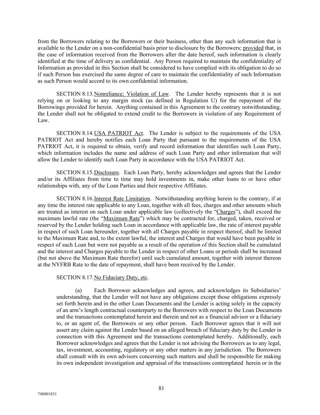 from the Borrowers relating to the Borrowers or their business, other than any such information that is available to the Lender on a non-confidential basis prior to disclosure by the Borrowers; provided that, in the case of information received from the Borrowers after the date hereof, such information is clearly identified at the time of delivery as confidential. Any Person required to maintain the confidentiality of Information as provided in this Section shall be considered to have complied with its obligation to do so if such Person has exercised the same degree of care to maintain the confidentiality of such Information as such Person would accord to its own confidential information. SECTION 8.13.Nonreliance; Violation of Law. The Lender hereby represents that it is not relying on or looking to any margin stock (as defined in Regulation U) for the repayment of the Borrowings provided for herein. Anything contained in this Agreement to the contrary notwithstanding, the Lender shall not be obligated to extend credit to the Borrowers in violation of any Requirement of Law. SECTION 8.14.USA PATRIOT Act. The Lender is subject to the requirements of the USA PATRIOT Act and hereby notifies each Loan Party that pursuant to the requirements of the USA PATRIOT Act, it is required to obtain, verify and record information that identifies such Loan Party, which information includes the name and address of such Loan Party and other information that will allow the Lender to identify such Loan Party in accordance with the USA PATRIOT Act. SECTION 8.15.Disclosure. Each Loan Party, hereby acknowledges and agrees that the Lender and/or its Affiliates from time to time may hold investments in, make other loans to or have other relationships with, any of the Loan Parties and their respective Affiliates. SECTION 8.16.Interest Rate Limitation. Notwithstanding anything herein to the contrary, if at any time the interest rate applicable to any Loan, together with all fees, charges and other amounts which are treated as interest on such Loan under applicable law (collectively the “Charges”), shall exceed the maximum lawful rate (the “Maximum Rate”) which may be contracted for, charged, taken, received or reserved by the Lender holding such Loan in accordance with applicable law, the rate of interest payable in respect of such Loan hereunder, together with all Charges payable in respect thereof, shall be limited to the Maximum Rate and, to the extent lawful, the interest and Charges that would have been payable in respect of such Loan but were not payable as a result of the operation of this Section shall be cumulated and the interest and Charges payable to the Lender in respect of other Loans or periods shall be increased (but not above the Maximum Rate therefor) until such cumulated amount, together with interest thereon at the NYFRB Rate to the date of repayment, shall have been received by the Lender. SECTION 8.17.No Fiduciary Duty, etc. (a) Each Borrower acknowledges and agrees, and acknowledges its Subsidiaries’ understanding, that the Lender will not have any obligations except those obligations expressly set forth herein and in the other Loan Documents and the Lender is acting solely in the capacity of an arm’s length contractual counterparty to the Borrowers with respect to the Loan Documents and the transactions contemplated herein and therein and not as a financial advisor or a fiduciary to, or an agent of, the Borrowers or any other person. Each Borrower agrees that it will not assert any claim against the Lender based on an alleged breach of fiduciary duty by the Lender in connection with this Agreement and the transactions contemplated hereby. Additionally, each Borrower acknowledges and agrees that the Lender is not advising the Borrowers as to any legal, tax, investment, accounting, regulatory or any other matters in any jurisdiction. The Borrowers shall consult with its own advisors concerning such matters and shall be responsible for making its own independent investigation and appraisal of the transactions contemplated herein or in the 81 748001831