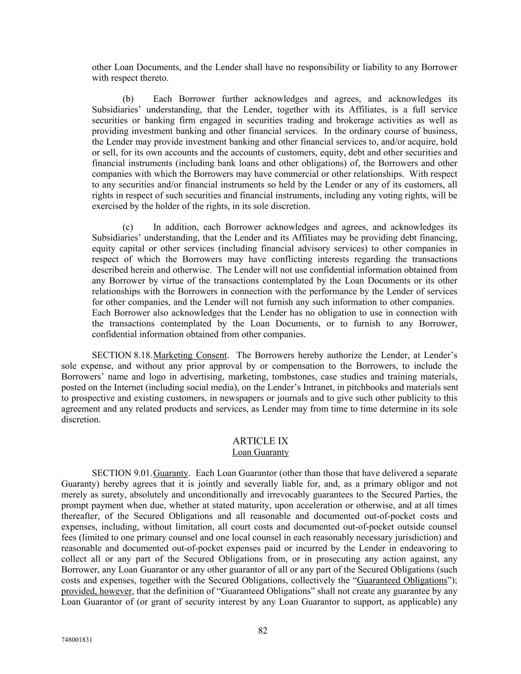 other Loan Documents, and the Lender shall have no responsibility or liability to any Borrower with respect thereto. (b) Each Borrower further acknowledges and agrees, and acknowledges its Subsidiaries’ understanding, that the Lender, together with its Affiliates, is a full service securities or banking firm engaged in securities trading and brokerage activities as well as providing investment banking and other financial services. In the ordinary course of business, the Lender may provide investment banking and other financial services to, and/or acquire, hold or sell, for its own accounts and the accounts of customers, equity, debt and other securities and financial instruments (including bank loans and other obligations) of, the Borrowers and other companies with which the Borrowers may have commercial or other relationships. With respect to any securities and/or financial instruments so held by the Lender or any of its customers, all rights in respect of such securities and financial instruments, including any voting rights, will be exercised by the holder of the rights, in its sole discretion. (c) In addition, each Borrower acknowledges and agrees, and acknowledges its Subsidiaries’ understanding, that the Lender and its Affiliates may be providing debt financing, equity capital or other services (including financial advisory services) to other companies in respect of which the Borrowers may have conflicting interests regarding the transactions described herein and otherwise. The Lender will not use confidential information obtained from any Borrower by virtue of the transactions contemplated by the Loan Documents or its other relationships with the Borrowers in connection with the performance by the Lender of services for other companies, and the Lender will not furnish any such information to other companies. Each Borrower also acknowledges that the Lender has no obligation to use in connection with the transactions contemplated by the Loan Documents, or to furnish to any Borrower, confidential information obtained from other companies. SECTION 8.18.Marketing Consent. The Borrowers hereby authorize the Lender, at Lender’s sole expense, and without any prior approval by or compensation to the Borrowers, to include the Borrowers’ name and logo in advertising, marketing, tombstones, case studies and training materials, posted on the Internet (including social media), on the Lender’s Intranet, in pitchbooks and materials sent to prospective and existing customers, in newspapers or journals and to give such other publicity to this agreement and any related products and services, as Lender may from time to time determine in its sole discretion. ARTICLE IX Loan Guaranty SECTION 9.01.Guaranty. Each Loan Guarantor (other than those that have delivered a separate Guaranty) hereby agrees that it is jointly and severally liable for, and, as a primary obligor and not merely as surety, absolutely and unconditionally and irrevocably guarantees to the Secured Parties, the prompt payment when due, whether at stated maturity, upon acceleration or otherwise, and at all times thereafter, of the Secured Obligations and all reasonable and documented out-of-pocket costs and expenses, including, without limitation, all court costs and documented out-of-pocket outside counsel fees (limited to one primary counsel and one local counsel in each reasonably necessary jurisdiction) and reasonable and documented out-of-pocket expenses paid or incurred by the Lender in endeavoring to collect all or any part of the Secured Obligations from, or in prosecuting any action against, any Borrower, any Loan Guarantor or any other guarantor of all or any part of the Secured Obligations (such costs and expenses, together with the Secured Obligations, collectively the “Guaranteed Obligations”); provided, however, that the definition of “Guaranteed Obligations” shall not create any guarantee by any Loan Guarantor of (or grant of security interest by any Loan Guarantor to support, as applicable) any 82 748001831