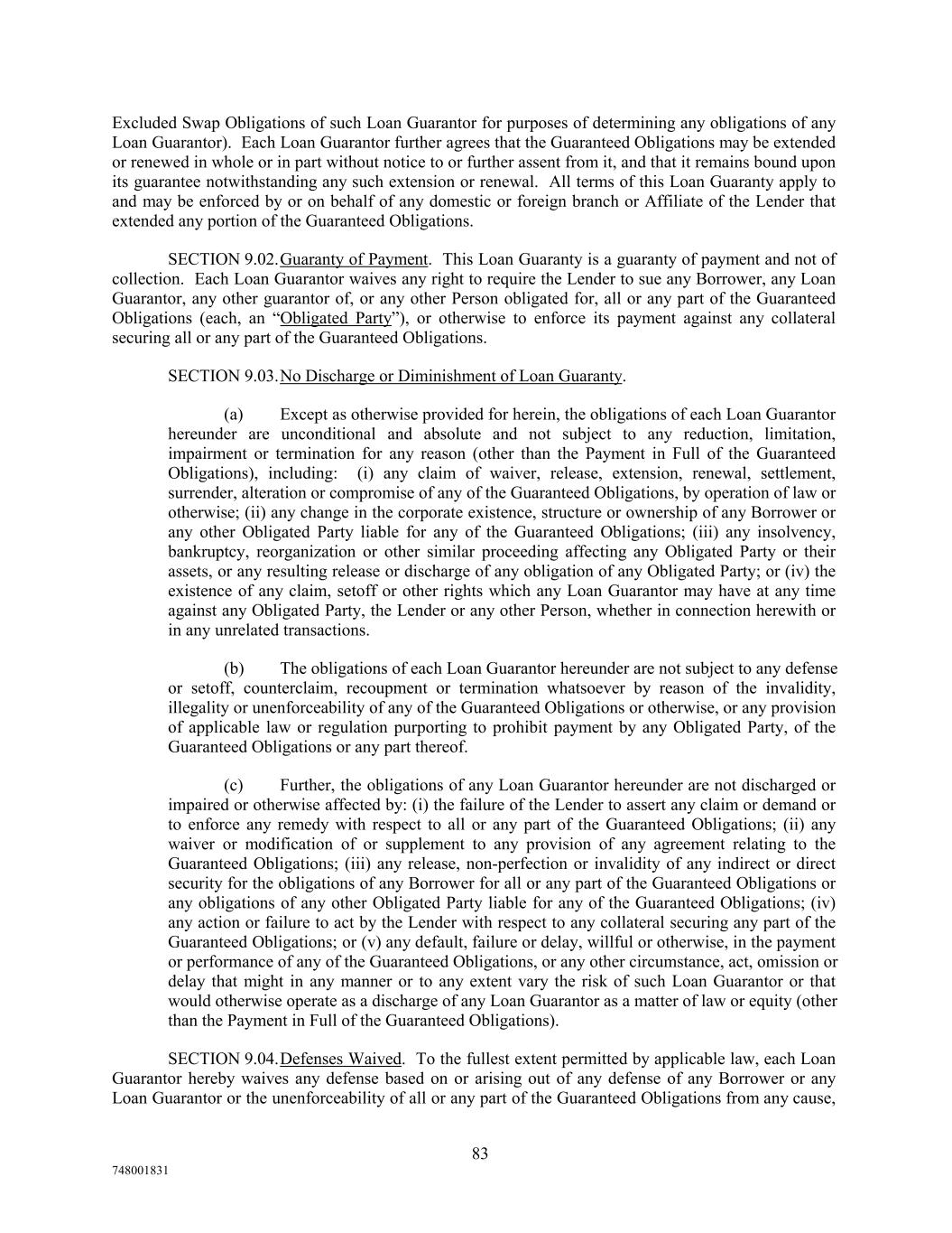 Excluded Swap Obligations of such Loan Guarantor for purposes of determining any obligations of any Loan Guarantor). Each Loan Guarantor further agrees that the Guaranteed Obligations may be extended or renewed in whole or in part without notice to or further assent from it, and that it remains bound upon its guarantee notwithstanding any such extension or renewal. All terms of this Loan Guaranty apply to and may be enforced by or on behalf of any domestic or foreign branch or Affiliate of the Lender that extended any portion of the Guaranteed Obligations. SECTION 9.02.Guaranty of Payment. This Loan Guaranty is a guaranty of payment and not of collection. Each Loan Guarantor waives any right to require the Lender to sue any Borrower, any Loan Guarantor, any other guarantor of, or any other Person obligated for, all or any part of the Guaranteed Obligations (each, an “Obligated Party”), or otherwise to enforce its payment against any collateral securing all or any part of the Guaranteed Obligations. SECTION 9.03.No Discharge or Diminishment of Loan Guaranty. (a) Except as otherwise provided for herein, the obligations of each Loan Guarantor hereunder are unconditional and absolute and not subject to any reduction, limitation, impairment or termination for any reason (other than the Payment in Full of the Guaranteed Obligations), including: (i) any claim of waiver, release, extension, renewal, settlement, surrender, alteration or compromise of any of the Guaranteed Obligations, by operation of law or otherwise; (ii) any change in the corporate existence, structure or ownership of any Borrower or any other Obligated Party liable for any of the Guaranteed Obligations; (iii) any insolvency, bankruptcy, reorganization or other similar proceeding affecting any Obligated Party or their assets, or any resulting release or discharge of any obligation of any Obligated Party; or (iv) the existence of any claim, setoff or other rights which any Loan Guarantor may have at any time against any Obligated Party, the Lender or any other Person, whether in connection herewith or in any unrelated transactions. (b) The obligations of each Loan Guarantor hereunder are not subject to any defense or setoff, counterclaim, recoupment or termination whatsoever by reason of the invalidity, illegality or unenforceability of any of the Guaranteed Obligations or otherwise, or any provision of applicable law or regulation purporting to prohibit payment by any Obligated Party, of the Guaranteed Obligations or any part thereof. (c) Further, the obligations of any Loan Guarantor hereunder are not discharged or impaired or otherwise affected by: (i) the failure of the Lender to assert any claim or demand or to enforce any remedy with respect to all or any part of the Guaranteed Obligations; (ii) any waiver or modification of or supplement to any provision of any agreement relating to the Guaranteed Obligations; (iii) any release, non-perfection or invalidity of any indirect or direct security for the obligations of any Borrower for all or any part of the Guaranteed Obligations or any obligations of any other Obligated Party liable for any of the Guaranteed Obligations; (iv) any action or failure to act by the Lender with respect to any collateral securing any part of the Guaranteed Obligations; or (v) any default, failure or delay, willful or otherwise, in the payment or performance of any of the Guaranteed Obligations, or any other circumstance, act, omission or delay that might in any manner or to any extent vary the risk of such Loan Guarantor or that would otherwise operate as a discharge of any Loan Guarantor as a matter of law or equity (other than the Payment in Full of the Guaranteed Obligations). SECTION 9.04.Defenses Waived. To the fullest extent permitted by applicable law, each Loan Guarantor hereby waives any defense based on or arising out of any defense of any Borrower or any Loan Guarantor or the unenforceability of all or any part of the Guaranteed Obligations from any cause, 83 748001831