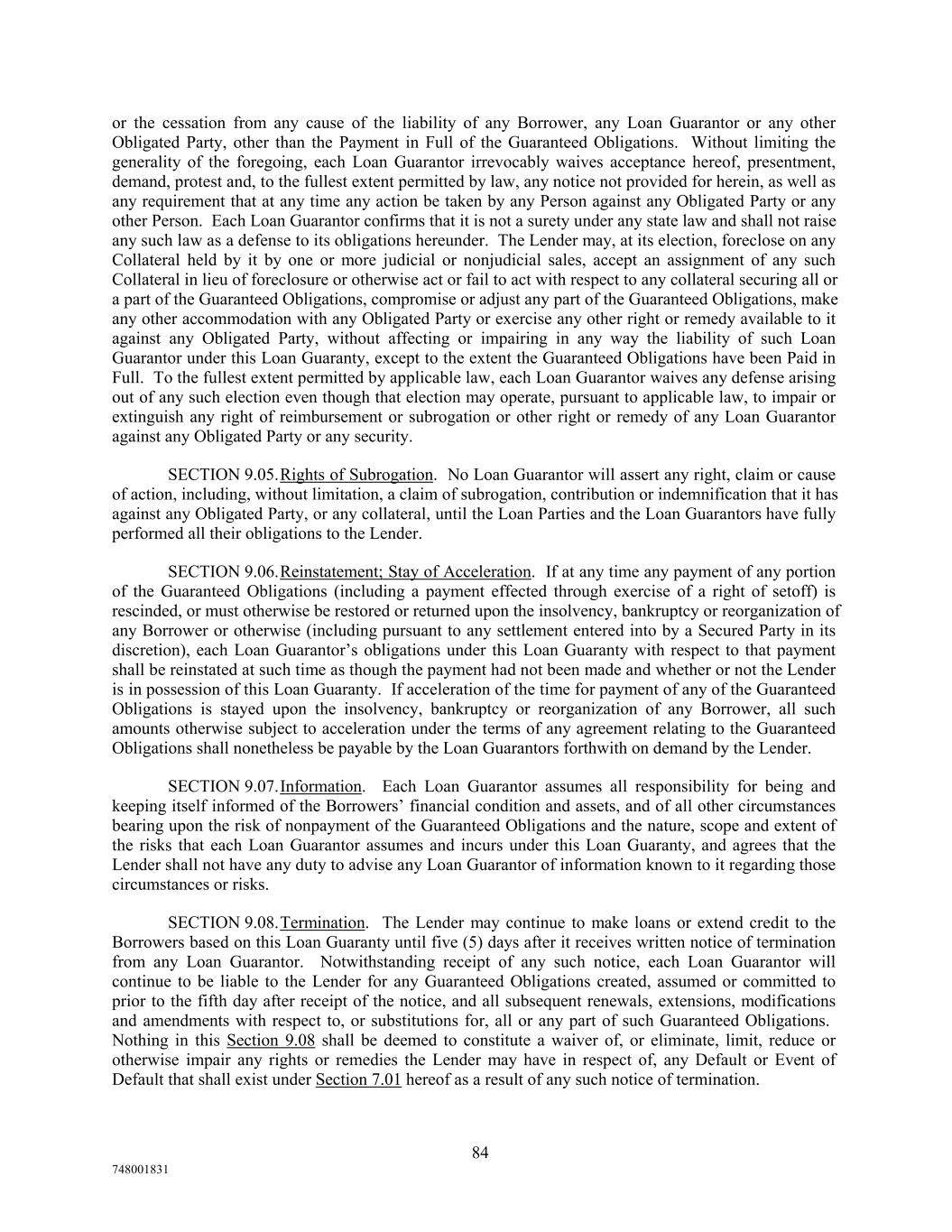 or the cessation from any cause of the liability of any Borrower, any Loan Guarantor or any other Obligated Party, other than the Payment in Full of the Guaranteed Obligations. Without limiting the generality of the foregoing, each Loan Guarantor irrevocably waives acceptance hereof, presentment, demand, protest and, to the fullest extent permitted by law, any notice not provided for herein, as well as any requirement that at any time any action be taken by any Person against any Obligated Party or any other Person. Each Loan Guarantor confirms that it is not a surety under any state law and shall not raise any such law as a defense to its obligations hereunder. The Lender may, at its election, foreclose on any Collateral held by it by one or more judicial or nonjudicial sales, accept an assignment of any such Collateral in lieu of foreclosure or otherwise act or fail to act with respect to any collateral securing all or a part of the Guaranteed Obligations, compromise or adjust any part of the Guaranteed Obligations, make any other accommodation with any Obligated Party or exercise any other right or remedy available to it against any Obligated Party, without affecting or impairing in any way the liability of such Loan Guarantor under this Loan Guaranty, except to the extent the Guaranteed Obligations have been Paid in Full. To the fullest extent permitted by applicable law, each Loan Guarantor waives any defense arising out of any such election even though that election may operate, pursuant to applicable law, to impair or extinguish any right of reimbursement or subrogation or other right or remedy of any Loan Guarantor against any Obligated Party or any security. SECTION 9.05.Rights of Subrogation. No Loan Guarantor will assert any right, claim or cause of action, including, without limitation, a claim of subrogation, contribution or indemnification that it has against any Obligated Party, or any collateral, until the Loan Parties and the Loan Guarantors have fully performed all their obligations to the Lender. SECTION 9.06.Reinstatement; Stay of Acceleration. If at any time any payment of any portion of the Guaranteed Obligations (including a payment effected through exercise of a right of setoff) is rescinded, or must otherwise be restored or returned upon the insolvency, bankruptcy or reorganization of any Borrower or otherwise (including pursuant to any settlement entered into by a Secured Party in its discretion), each Loan Guarantor’s obligations under this Loan Guaranty with respect to that payment shall be reinstated at such time as though the payment had not been made and whether or not the Lender is in possession of this Loan Guaranty. If acceleration of the time for payment of any of the Guaranteed Obligations is stayed upon the insolvency, bankruptcy or reorganization of any Borrower, all such amounts otherwise subject to acceleration under the terms of any agreement relating to the Guaranteed Obligations shall nonetheless be payable by the Loan Guarantors forthwith on demand by the Lender. SECTION 9.07.Information. Each Loan Guarantor assumes all responsibility for being and keeping itself informed of the Borrowers’ financial condition and assets, and of all other circumstances bearing upon the risk of nonpayment of the Guaranteed Obligations and the nature, scope and extent of the risks that each Loan Guarantor assumes and incurs under this Loan Guaranty, and agrees that the Lender shall not have any duty to advise any Loan Guarantor of information known to it regarding those circumstances or risks. SECTION 9.08.Termination. The Lender may continue to make loans or extend credit to the Borrowers based on this Loan Guaranty until five (5) days after it receives written notice of termination from any Loan Guarantor. Notwithstanding receipt of any such notice, each Loan Guarantor will continue to be liable to the Lender for any Guaranteed Obligations created, assumed or committed to prior to the fifth day after receipt of the notice, and all subsequent renewals, extensions, modifications and amendments with respect to, or substitutions for, all or any part of such Guaranteed Obligations. Nothing in this Section 9.08 shall be deemed to constitute a waiver of, or eliminate, limit, reduce or otherwise impair any rights or remedies the Lender may have in respect of, any Default or Event of Default that shall exist under Section 7.01 hereof as a result of any such notice of termination. 84 748001831