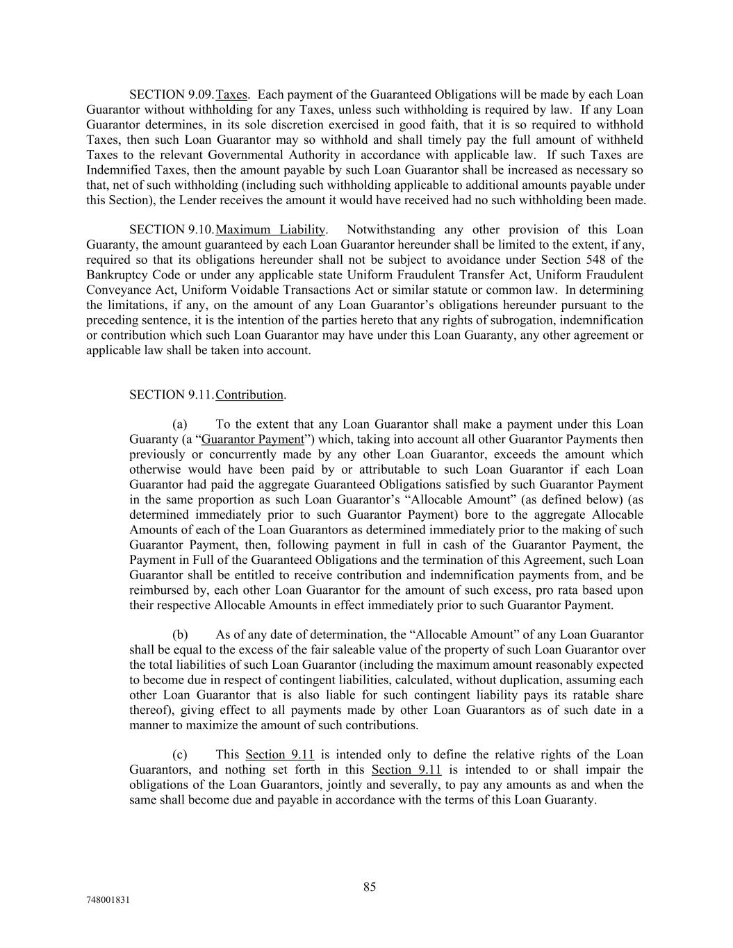 SECTION 9.09.Taxes. Each payment of the Guaranteed Obligations will be made by each Loan Guarantor without withholding for any Taxes, unless such withholding is required by law. If any Loan Guarantor determines, in its sole discretion exercised in good faith, that it is so required to withhold Taxes, then such Loan Guarantor may so withhold and shall timely pay the full amount of withheld Taxes to the relevant Governmental Authority in accordance with applicable law. If such Taxes are Indemnified Taxes, then the amount payable by such Loan Guarantor shall be increased as necessary so that, net of such withholding (including such withholding applicable to additional amounts payable under this Section), the Lender receives the amount it would have received had no such withholding been made. SECTION 9.10.Maximum Liability. Notwithstanding any other provision of this Loan Guaranty, the amount guaranteed by each Loan Guarantor hereunder shall be limited to the extent, if any, required so that its obligations hereunder shall not be subject to avoidance under Section 548 of the Bankruptcy Code or under any applicable state Uniform Fraudulent Transfer Act, Uniform Fraudulent Conveyance Act, Uniform Voidable Transactions Act or similar statute or common law. In determining the limitations, if any, on the amount of any Loan Guarantor’s obligations hereunder pursuant to the preceding sentence, it is the intention of the parties hereto that any rights of subrogation, indemnification or contribution which such Loan Guarantor may have under this Loan Guaranty, any other agreement or applicable law shall be taken into account. SECTION 9.11.Contribution. (a) To the extent that any Loan Guarantor shall make a payment under this Loan Guaranty (a “Guarantor Payment”) which, taking into account all other Guarantor Payments then previously or concurrently made by any other Loan Guarantor, exceeds the amount which otherwise would have been paid by or attributable to such Loan Guarantor if each Loan Guarantor had paid the aggregate Guaranteed Obligations satisfied by such Guarantor Payment in the same proportion as such Loan Guarantor’s “Allocable Amount” (as defined below) (as determined immediately prior to such Guarantor Payment) bore to the aggregate Allocable Amounts of each of the Loan Guarantors as determined immediately prior to the making of such Guarantor Payment, then, following payment in full in cash of the Guarantor Payment, the Payment in Full of the Guaranteed Obligations and the termination of this Agreement, such Loan Guarantor shall be entitled to receive contribution and indemnification payments from, and be reimbursed by, each other Loan Guarantor for the amount of such excess, pro rata based upon their respective Allocable Amounts in effect immediately prior to such Guarantor Payment. (b) As of any date of determination, the “Allocable Amount” of any Loan Guarantor shall be equal to the excess of the fair saleable value of the property of such Loan Guarantor over the total liabilities of such Loan Guarantor (including the maximum amount reasonably expected to become due in respect of contingent liabilities, calculated, without duplication, assuming each other Loan Guarantor that is also liable for such contingent liability pays its ratable share thereof), giving effect to all payments made by other Loan Guarantors as of such date in a manner to maximize the amount of such contributions. (c) This Section 9.11 is intended only to define the relative rights of the Loan Guarantors, and nothing set forth in this Section 9.11 is intended to or shall impair the obligations of the Loan Guarantors, jointly and severally, to pay any amounts as and when the same shall become due and payable in accordance with the terms of this Loan Guaranty. 85 748001831