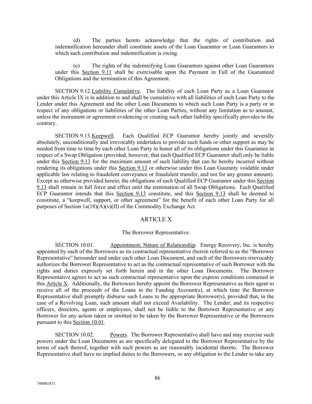(d) The parties hereto acknowledge that the rights of contribution and indemnification hereunder shall constitute assets of the Loan Guarantor or Loan Guarantors to which such contribution and indemnification is owing. (e) The rights of the indemnifying Loan Guarantors against other Loan Guarantors under this Section 9.11 shall be exercisable upon the Payment in Full of the Guaranteed Obligations and the termination of this Agreement. SECTION 9.12.Liability Cumulative. The liability of each Loan Party as a Loan Guarantor under this Article IX is in addition to and shall be cumulative with all liabilities of each Loan Party to the Lender under this Agreement and the other Loan Documents to which such Loan Party is a party or in respect of any obligations or liabilities of the other Loan Parties, without any limitation as to amount, unless the instrument or agreement evidencing or creating such other liability specifically provides to the contrary. SECTION 9.13.Keepwell. Each Qualified ECP Guarantor hereby jointly and severally absolutely, unconditionally and irrevocably undertakes to provide such funds or other support as may be needed from time to time by each other Loan Party to honor all of its obligations under this Guarantee in respect of a Swap Obligation (provided, however, that each Qualified ECP Guarantor shall only be liable under this Section 9.13 for the maximum amount of such liability that can be hereby incurred without rendering its obligations under this Section 9.13 or otherwise under this Loan Guaranty voidable under applicable law relating to fraudulent conveyance or fraudulent transfer, and not for any greater amount). Except as otherwise provided herein, the obligations of each Qualified ECP Guarantor under this Section 9.13 shall remain in full force and effect until the termination of all Swap Obligations. Each Qualified ECP Guarantor intends that this Section 9.13 constitute, and this Section 9.13 shall be deemed to constitute, a “keepwell, support, or other agreement” for the benefit of each other Loan Party for all purposes of Section 1a(18)(A)(v)(II) of the Commodity Exchange Act. ARTICLE X The Borrower Representative. SECTION 10.01. Appointment; Nature of Relationship. Energy Recovery, Inc. is hereby appointed by each of the Borrowers as its contractual representative (herein referred to as the “Borrower Representative” hereunder and under each other Loan Document, and each of the Borrowers irrevocably authorizes the Borrower Representative to act as the contractual representative of such Borrower with the rights and duties expressly set forth herein and in the other Loan Documents. The Borrower Representative agrees to act as such contractual representative upon the express conditions contained in this Article X. Additionally, the Borrowers hereby appoint the Borrower Representative as their agent to receive all of the proceeds of the Loans in the Funding Account(s), at which time the Borrower Representative shall promptly disburse such Loans to the appropriate Borrower(s), provided that, in the case of a Revolving Loan, such amount shall not exceed Availability. The Lender, and its respective officers, directors, agents or employees, shall not be liable to the Borrower Representative or any Borrower for any action taken or omitted to be taken by the Borrower Representative or the Borrowers pursuant to this Section 10.01. SECTION 10.02. Powers. The Borrower Representative shall have and may exercise such powers under the Loan Documents as are specifically delegated to the Borrower Representative by the terms of each thereof, together with such powers as are reasonably incidental thereto. The Borrower Representative shall have no implied duties to the Borrowers, or any obligation to the Lender to take any 86 748001831