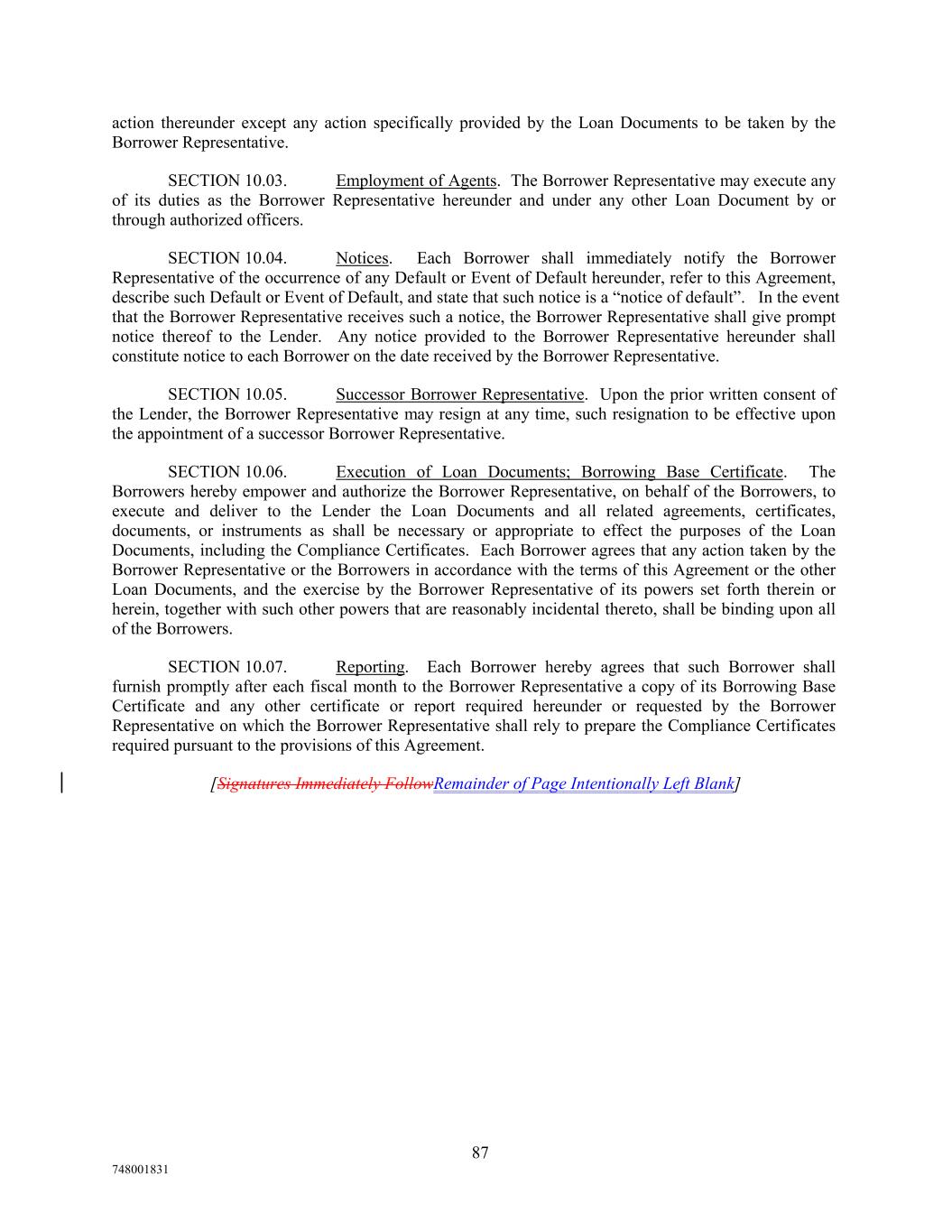 action thereunder except any action specifically provided by the Loan Documents to be taken by the Borrower Representative. SECTION 10.03. Employment of Agents. The Borrower Representative may execute any of its duties as the Borrower Representative hereunder and under any other Loan Document by or through authorized officers. SECTION 10.04. Notices. Each Borrower shall immediately notify the Borrower Representative of the occurrence of any Default or Event of Default hereunder, refer to this Agreement, describe such Default or Event of Default, and state that such notice is a “notice of default”. In the event that the Borrower Representative receives such a notice, the Borrower Representative shall give prompt notice thereof to the Lender. Any notice provided to the Borrower Representative hereunder shall constitute notice to each Borrower on the date received by the Borrower Representative. SECTION 10.05. Successor Borrower Representative. Upon the prior written consent of the Lender, the Borrower Representative may resign at any time, such resignation to be effective upon the appointment of a successor Borrower Representative. SECTION 10.06. Execution of Loan Documents; Borrowing Base Certificate. The Borrowers hereby empower and authorize the Borrower Representative, on behalf of the Borrowers, to execute and deliver to the Lender the Loan Documents and all related agreements, certificates, documents, or instruments as shall be necessary or appropriate to effect the purposes of the Loan Documents, including the Compliance Certificates. Each Borrower agrees that any action taken by the Borrower Representative or the Borrowers in accordance with the terms of this Agreement or the other Loan Documents, and the exercise by the Borrower Representative of its powers set forth therein or herein, together with such other powers that are reasonably incidental thereto, shall be binding upon all of the Borrowers. SECTION 10.07. Reporting. Each Borrower hereby agrees that such Borrower shall furnish promptly after each fiscal month to the Borrower Representative a copy of its Borrowing Base Certificate and any other certificate or report required hereunder or requested by the Borrower Representative on which the Borrower Representative shall rely to prepare the Compliance Certificates required pursuant to the provisions of this Agreement. [Signatures Immediately FollowRemainder of Page Intentionally Left Blank] 87 748001831