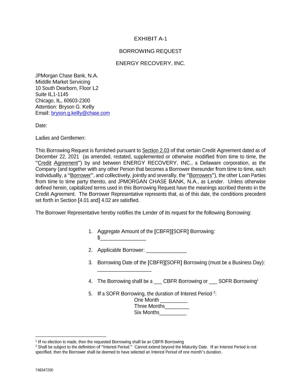 748347200 EXHIBIT A-1 BORROWING REQUEST ENERGY RECOVERY, INC. JPMorgan Chase Bank, N.A. Middle Market Servicing 10 South Dearborn, Floor L2 Suite IL1-1145 Chicago, IL, 60603-2300 Attention: Bryson G. Kelly Email: bryson.g.kelly@chase.com Date: Ladies and Gentlemen: This Borrowing Request is furnished pursuant to Section 2.03 of that certain Credit Agreement dated as of December 22, 2021 (as amended, restated, supplemented or otherwise modified from time to time, the “Credit Agreement”) by and between ENERGY RECOVERY, INC., a Delaware corporation, as the Company (and together with any other Person that becomes a Borrower thereunder from time to time, each individually, a “Borrower”, and collectively, jointly and severally, the “Borrowers”), the other Loan Parties from time to time party thereto, and JPMORGAN CHASE BANK, N.A., as Lender. Unless otherwise defined herein, capitalized terms used in this Borrowing Request have the meanings ascribed thereto in the Credit Agreement. The Borrower Representative represents that, as of this date, the conditions precedent set forth in Section [4.01 and] 4.02 are satisfied. The Borrower Representative hereby notifies the Lender of its request for the following Borrowing: 1. Aggregate Amount of the [CBFR][SOFR] Borrowing: $_________________ 2. Applicable Borrower: _______________ 3. Borrowing Date of the [CBFR][SOFR] Borrowing (must be a Business Day): ____________________ 4. The Borrowing shall be a ___ CBFR Borrowing or ___ SOFR Borrowing1 5. If a SOFR Borrowing, the duration of Interest Period 2: One Month __________ Three Months_________ Six Months__________ 1 If no election is made, then the requested Borrowing shall be an CBFR Borrowing 2 Shall be subject to the definition of “Interest Period.” Cannot extend beyond the Maturity Date. If an Interest Period is not specified, then the Borrower shall be deemed to have selected an Interest Period of one month’s duration.