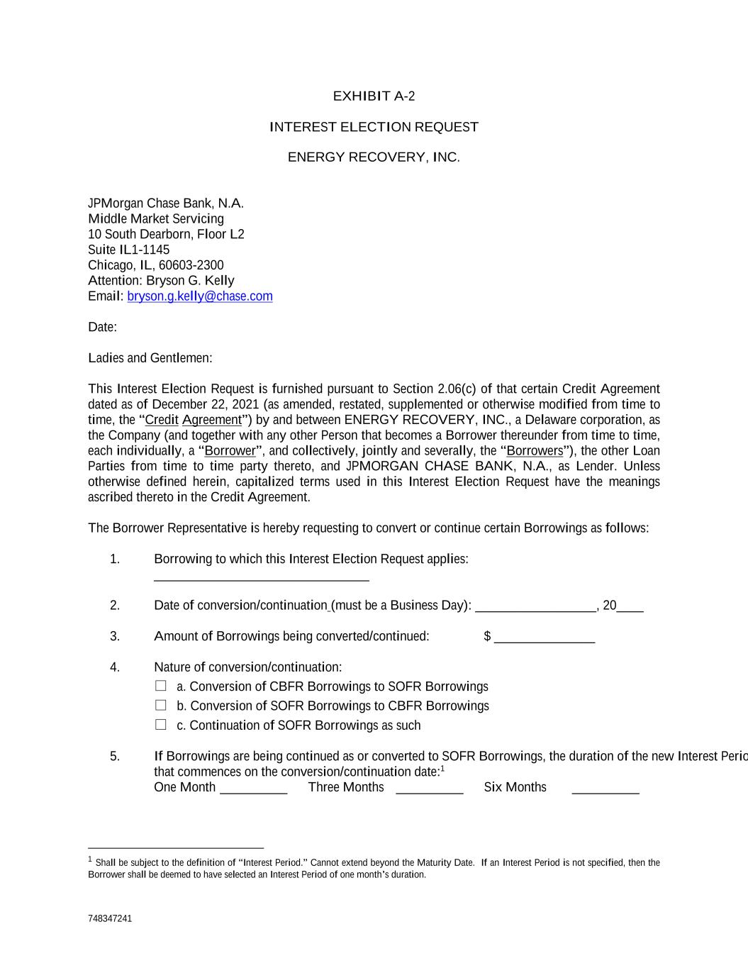 748347241 EXHIBIT A-2 INTEREST ELECTION REQUEST ENERGY RECOVERY, INC. JPMorgan Chase Bank, N.A. Middle Market Servicing 10 South Dearborn, Floor L2 Suite IL1-1145 Chicago, IL, 60603-2300 Attention: Bryson G. Kelly Email: bryson.g.kelly@chase.com Date: Ladies and Gentlemen: This Interest Election Request is furnished pursuant to Section 2.06(c) of that certain Credit Agreement dated as of December 22, 2021 (as amended, restated, supplemented or otherwise modified from time to time, the “Credit Agreement”) by and between ENERGY RECOVERY, INC., a Delaware corporation, as the Company (and together with any other Person that becomes a Borrower thereunder from time to time, each individually, a “Borrower”, and collectively, jointly and severally, the “Borrowers”), the other Loan Parties from time to time party thereto, and JPMORGAN CHASE BANK, N.A., as Lender. Unless otherwise defined herein, capitalized terms used in this Interest Election Request have the meanings ascribed thereto in the Credit Agreement. The Borrower Representative is hereby requesting to convert or continue certain Borrowings as follows: 1. Borrowing to which this Interest Election Request applies: ________________________________ 2. Date of conversion/continuation (must be a Business Day): __________________, 20____ 3. Amount of Borrowings being converted/continued: $ _______________ 4. Nature of conversion/continuation:  a. Conversion of CBFR Borrowings to SOFR Borrowings  b. Conversion of SOFR Borrowings to CBFR Borrowings  c. Continuation of SOFR Borrowings as such 5. If Borrowings are being continued as or converted to SOFR Borrowings, the duration of the new Interest Period that commences on the conversion/continuation date:1 One Month __________ Three Months __________ Six Months __________ 1 Shall be subject to the definition of “Interest Period.” Cannot extend beyond the Maturity Date. If an Interest Period is not specified, then the Borrower shall be deemed to have selected an Interest Period of one month’s duration.