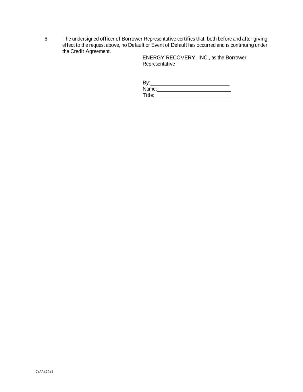 748347241 6. The undersigned officer of Borrower Representative certifies that, both before and after giving effect to the request above, no Default or Event of Default has occurred and is continuing under the Credit Agreement. ENERGY RECOVERY, INC., as the Borrower Representative By:_____________________________ Name:___________________________ Title:____________________________