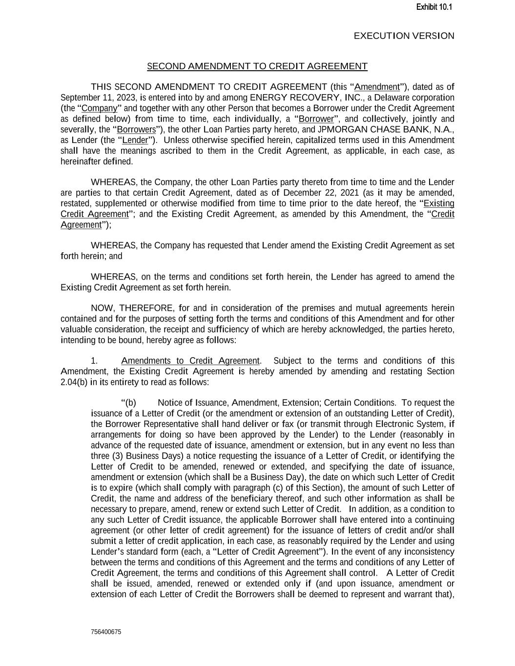 EXECUTION VERSION 756400675 SECOND AMENDMENT TO CREDIT AGREEMENT THIS SECOND AMENDMENT TO CREDIT AGREEMENT (this “Amendment”), dated as of September 11, 2023, is entered into by and among ENERGY RECOVERY, INC., a Delaware corporation (the “Company” and together with any other Person that becomes a Borrower under the Credit Agreement as defined below) from time to time, each individually, a “Borrower”, and collectively, jointly and severally, the “Borrowers”), the other Loan Parties party hereto, and JPMORGAN CHASE BANK, N.A., as Lender (the “Lender”). Unless otherwise specified herein, capitalized terms used in this Amendment shall have the meanings ascribed to them in the Credit Agreement, as applicable, in each case, as hereinafter defined. WHEREAS, the Company, the other Loan Parties party thereto from time to time and the Lender are parties to that certain Credit Agreement, dated as of December 22, 2021 (as it may be amended, restated, supplemented or otherwise modified from time to time prior to the date hereof, the “Existing Credit Agreement”; and the Existing Credit Agreement, as amended by this Amendment, the “Credit Agreement”); WHEREAS, the Company has requested that Lender amend the Existing Credit Agreement as set forth herein; and WHEREAS, on the terms and conditions set forth herein, the Lender has agreed to amend the Existing Credit Agreement as set forth herein. NOW, THEREFORE, for and in consideration of the premises and mutual agreements herein contained and for the purposes of setting forth the terms and conditions of this Amendment and for other valuable consideration, the receipt and sufficiency of which are hereby acknowledged, the parties hereto, intending to be bound, hereby agree as follows: 1. Amendments to Credit Agreement. Subject to the terms and conditions of this Amendment, the Existing Credit Agreement is hereby amended by amending and restating Section 2.04(b) in its entirety to read as follows: “(b) Notice of Issuance, Amendment, Extension; Certain Conditions. To request the issuance of a Letter of Credit (or the amendment or extension of an outstanding Letter of Credit), the Borrower Representative shall hand deliver or fax (or transmit through Electronic System, if arrangements for doing so have been approved by the Lender) to the Lender (reasonably in advance of the requested date of issuance, amendment or extension, but in any event no less than three (3) Business Days) a notice requesting the issuance of a Letter of Credit, or identifying the Letter of Credit to be amended, renewed or extended, and specifying the date of issuance, amendment or extension (which shall be a Business Day), the date on which such Letter of Credit is to expire (which shall comply with paragraph (c) of this Section), the amount of such Letter of Credit, the name and address of the beneficiary thereof, and such other information as shall be necessary to prepare, amend, renew or extend such Letter of Credit. In addition, as a condition to any such Letter of Credit issuance, the applicable Borrower shall have entered into a continuing agreement (or other letter of credit agreement) for the issuance of letters of credit and/or shall submit a letter of credit application, in each case, as reasonably required by the Lender and using Lender’s standard form (each, a “Letter of Credit Agreement”). In the event of any inconsistency between the terms and conditions of this Agreement and the terms and conditions of any Letter of Credit Agreement, the terms and conditions of this Agreement shall control. A Letter of Credit shall be issued, amended, renewed or extended only if (and upon issuance, amendment or extension of each Letter of Credit the Borrowers shall be deemed to represent and warrant that), Exhibit 10.1