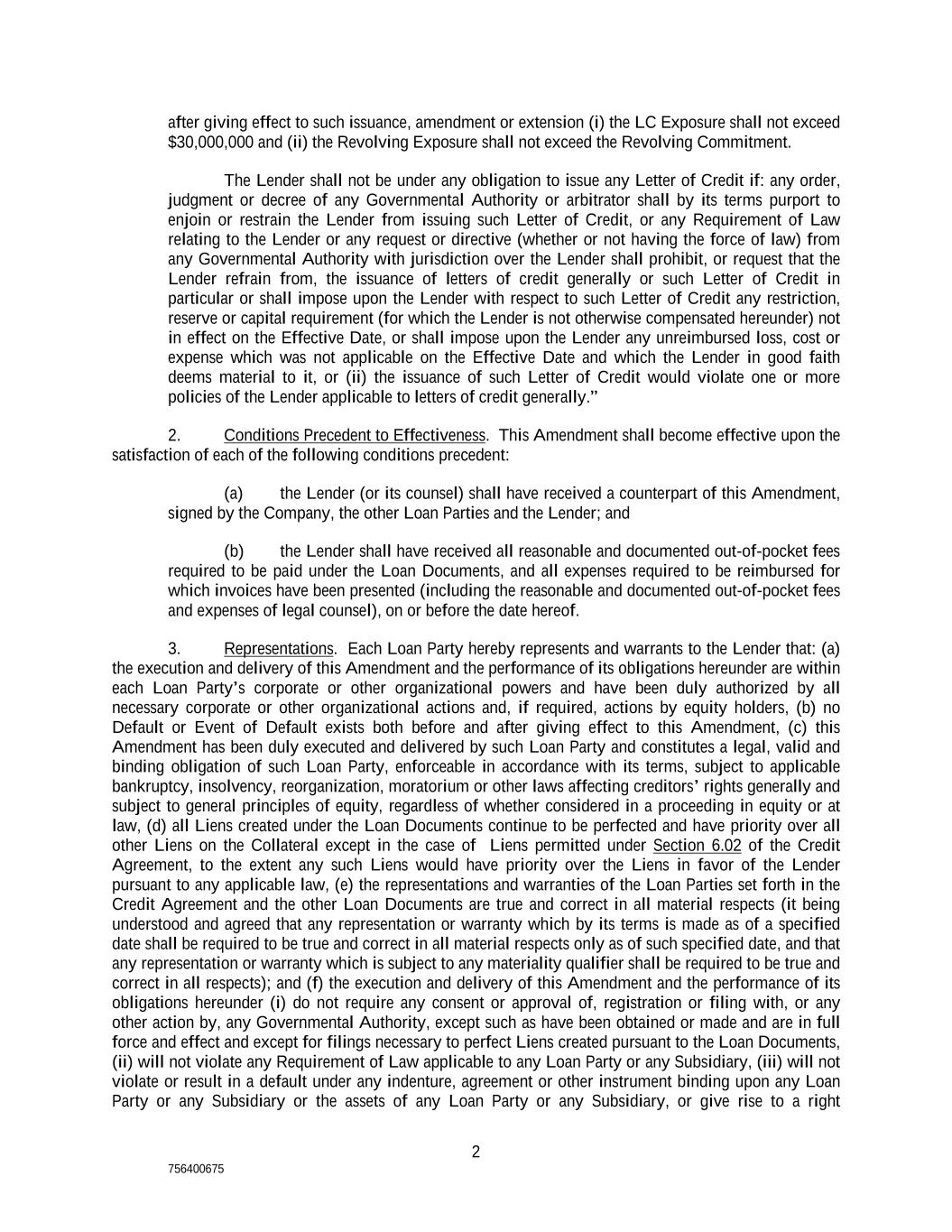 2 756400675 after giving effect to such issuance, amendment or extension (i) the LC Exposure shall not exceed $30,000,000 and (ii) the Revolving Exposure shall not exceed the Revolving Commitment. The Lender shall not be under any obligation to issue any Letter of Credit if: any order, judgment or decree of any Governmental Authority or arbitrator shall by its terms purport to enjoin or restrain the Lender from issuing such Letter of Credit, or any Requirement of Law relating to the Lender or any request or directive (whether or not having the force of law) from any Governmental Authority with jurisdiction over the Lender shall prohibit, or request that the Lender refrain from, the issuance of letters of credit generally or such Letter of Credit in particular or shall impose upon the Lender with respect to such Letter of Credit any restriction, reserve or capital requirement (for which the Lender is not otherwise compensated hereunder) not in effect on the Effective Date, or shall impose upon the Lender any unreimbursed loss, cost or expense which was not applicable on the Effective Date and which the Lender in good faith deems material to it, or (ii) the issuance of such Letter of Credit would violate one or more policies of the Lender applicable to letters of credit generally.” 2. Conditions Precedent to Effectiveness. This Amendment shall become effective upon the satisfaction of each of the following conditions precedent: (a) the Lender (or its counsel) shall have received a counterpart of this Amendment, signed by the Company, the other Loan Parties and the Lender; and (b) the Lender shall have received all reasonable and documented out-of-pocket fees required to be paid under the Loan Documents, and all expenses required to be reimbursed for which invoices have been presented (including the reasonable and documented out-of-pocket fees and expenses of legal counsel), on or before the date hereof. 3. Representations. Each Loan Party hereby represents and warrants to the Lender that: (a) the execution and delivery of this Amendment and the performance of its obligations hereunder are within each Loan Party’s corporate or other organizational powers and have been duly authorized by all necessary corporate or other organizational actions and, if required, actions by equity holders, (b) no Default or Event of Default exists both before and after giving effect to this Amendment, (c) this Amendment has been duly executed and delivered by such Loan Party and constitutes a legal, valid and binding obligation of such Loan Party, enforceable in accordance with its terms, subject to applicable bankruptcy, insolvency, reorganization, moratorium or other laws affecting creditors’ rights generally and subject to general principles of equity, regardless of whether considered in a proceeding in equity or at law, (d) all Liens created under the Loan Documents continue to be perfected and have priority over all other Liens on the Collateral except in the case of Liens permitted under Section 6.02 of the Credit Agreement, to the extent any such Liens would have priority over the Liens in favor of the Lender pursuant to any applicable law, (e) the representations and warranties of the Loan Parties set forth in the Credit Agreement and the other Loan Documents are true and correct in all material respects (it being understood and agreed that any representation or warranty which by its terms is made as of a specified date shall be required to be true and correct in all material respects only as of such specified date, and that any representation or warranty which is subject to any materiality qualifier shall be required to be true and correct in all respects); and (f) the execution and delivery of this Amendment and the performance of its obligations hereunder (i) do not require any consent or approval of, registration or filing with, or any other action by, any Governmental Authority, except such as have been obtained or made and are in full force and effect and except for filings necessary to perfect Liens created pursuant to the Loan Documents, (ii) will not violate any Requirement of Law applicable to any Loan Party or any Subsidiary, (iii) will not violate or result in a default under any indenture, agreement or other instrument binding upon any Loan Party or any Subsidiary or the assets of any Loan Party or any Subsidiary, or give rise to a right