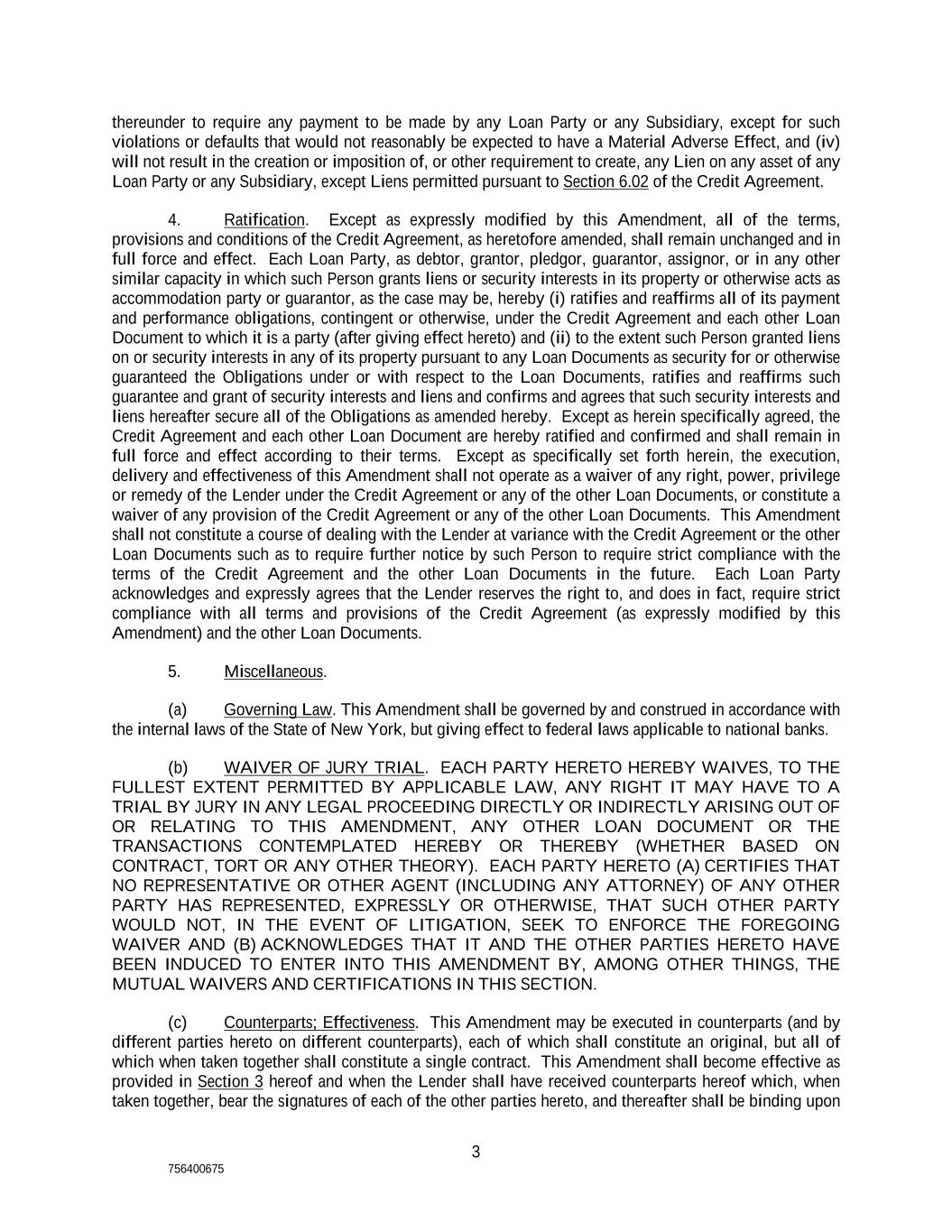 3 756400675 thereunder to require any payment to be made by any Loan Party or any Subsidiary, except for such violations or defaults that would not reasonably be expected to have a Material Adverse Effect, and (iv) will not result in the creation or imposition of, or other requirement to create, any Lien on any asset of any Loan Party or any Subsidiary, except Liens permitted pursuant to Section 6.02 of the Credit Agreement. 4. Ratification. Except as expressly modified by this Amendment, all of the terms, provisions and conditions of the Credit Agreement, as heretofore amended, shall remain unchanged and in full force and effect. Each Loan Party, as debtor, grantor, pledgor, guarantor, assignor, or in any other similar capacity in which such Person grants liens or security interests in its property or otherwise acts as accommodation party or guarantor, as the case may be, hereby (i) ratifies and reaffirms all of its payment and performance obligations, contingent or otherwise, under the Credit Agreement and each other Loan Document to which it is a party (after giving effect hereto) and (ii) to the extent such Person granted liens on or security interests in any of its property pursuant to any Loan Documents as security for or otherwise guaranteed the Obligations under or with respect to the Loan Documents, ratifies and reaffirms such guarantee and grant of security interests and liens and confirms and agrees that such security interests and liens hereafter secure all of the Obligations as amended hereby. Except as herein specifically agreed, the Credit Agreement and each other Loan Document are hereby ratified and confirmed and shall remain in full force and effect according to their terms. Except as specifically set forth herein, the execution, delivery and effectiveness of this Amendment shall not operate as a waiver of any right, power, privilege or remedy of the Lender under the Credit Agreement or any of the other Loan Documents, or constitute a waiver of any provision of the Credit Agreement or any of the other Loan Documents. This Amendment shall not constitute a course of dealing with the Lender at variance with the Credit Agreement or the other Loan Documents such as to require further notice by such Person to require strict compliance with the terms of the Credit Agreement and the other Loan Documents in the future. Each Loan Party acknowledges and expressly agrees that the Lender reserves the right to, and does in fact, require strict compliance with all terms and provisions of the Credit Agreement (as expressly modified by this Amendment) and the other Loan Documents. 5. Miscellaneous. (a) Governing Law. This Amendment shall be governed by and construed in accordance with the internal laws of the State of New York, but giving effect to federal laws applicable to national banks. (b) WAIVER OF JURY TRIAL. EACH PARTY HERETO HEREBY WAIVES, TO THE FULLEST EXTENT PERMITTED BY APPLICABLE LAW, ANY RIGHT IT MAY HAVE TO A TRIAL BY JURY IN ANY LEGAL PROCEEDING DIRECTLY OR INDIRECTLY ARISING OUT OF OR RELATING TO THIS AMENDMENT, ANY OTHER LOAN DOCUMENT OR THE TRANSACTIONS CONTEMPLATED HEREBY OR THEREBY (WHETHER BASED ON CONTRACT, TORT OR ANY OTHER THEORY). EACH PARTY HERETO (A) CERTIFIES THAT NO REPRESENTATIVE OR OTHER AGENT (INCLUDING ANY ATTORNEY) OF ANY OTHER PARTY HAS REPRESENTED, EXPRESSLY OR OTHERWISE, THAT SUCH OTHER PARTY WOULD NOT, IN THE EVENT OF LITIGATION, SEEK TO ENFORCE THE FOREGOING WAIVER AND (B) ACKNOWLEDGES THAT IT AND THE OTHER PARTIES HERETO HAVE BEEN INDUCED TO ENTER INTO THIS AMENDMENT BY, AMONG OTHER THINGS, THE MUTUAL WAIVERS AND CERTIFICATIONS IN THIS SECTION. (c) Counterparts; Effectiveness. This Amendment may be executed in counterparts (and by different parties hereto on different counterparts), each of which shall constitute an original, but all of which when taken together shall constitute a single contract. This Amendment shall become effective as provided in Section 3 hereof and when the Lender shall have received counterparts hereof which, when taken together, bear the signatures of each of the other parties hereto, and thereafter shall be binding upon