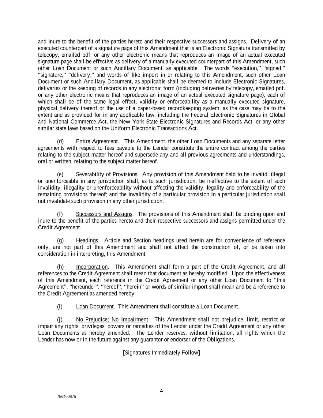 4 756400675 and inure to the benefit of the parties hereto and their respective successors and assigns. Delivery of an executed counterpart of a signature page of this Amendment that is an Electronic Signature transmitted by telecopy, emailed pdf. or any other electronic means that reproduces an image of an actual executed signature page shall be effective as delivery of a manually executed counterpart of this Amendment, such other Loan Document or such Ancillary Document, as applicable. The words “execution,” “signed,” “signature,” “delivery,” and words of like import in or relating to this Amendment, such other Loan Document or such Ancillary Document, as applicable shall be deemed to include Electronic Signatures, deliveries or the keeping of records in any electronic form (including deliveries by telecopy, emailed pdf. or any other electronic means that reproduces an image of an actual executed signature page), each of which shall be of the same legal effect, validity or enforceability as a manually executed signature, physical delivery thereof or the use of a paper-based recordkeeping system, as the case may be to the extent and as provided for in any applicable law, including the Federal Electronic Signatures in Global and National Commerce Act, the New York State Electronic Signatures and Records Act, or any other similar state laws based on the Uniform Electronic Transactions Act. (d) Entire Agreement. This Amendment, the other Loan Documents and any separate letter agreements with respect to fees payable to the Lender constitute the entire contract among the parties relating to the subject matter hereof and supersede any and all previous agreements and understandings, oral or written, relating to the subject matter hereof. (e) Severability of Provisions. Any provision of this Amendment held to be invalid, illegal or unenforceable in any jurisdiction shall, as to such jurisdiction, be ineffective to the extent of such invalidity, illegality or unenforceability without affecting the validity, legality and enforceability of the remaining provisions thereof; and the invalidity of a particular provision in a particular jurisdiction shall not invalidate such provision in any other jurisdiction. (f) Successors and Assigns. The provisions of this Amendment shall be binding upon and inure to the benefit of the parties hereto and their respective successors and assigns permitted under the Credit Agreement. (g) Headings. Article and Section headings used herein are for convenience of reference only, are not part of this Amendment and shall not affect the construction of, or be taken into consideration in interpreting, this Amendment. (h) Incorporation. This Amendment shall form a part of the Credit Agreement, and all references to the Credit Agreement shall mean that document as hereby modified. Upon the effectiveness of this Amendment, each reference in the Credit Agreement or any other Loan Document to “this Agreement”, “hereunder”, “hereof”, “herein” or words of similar import shall mean and be a reference to the Credit Agreement as amended hereby. (i) Loan Document. This Amendment shall constitute a Loan Document. (j) No Prejudice; No Impairment. This Amendment shall not prejudice, limit, restrict or impair any rights, privileges, powers or remedies of the Lender under the Credit Agreement or any other Loan Documents as hereby amended. The Lender reserves, without limitation, all rights which the Lender has now or in the future against any guarantor or endorser of the Obligations. [Signatures Immediately Follow]