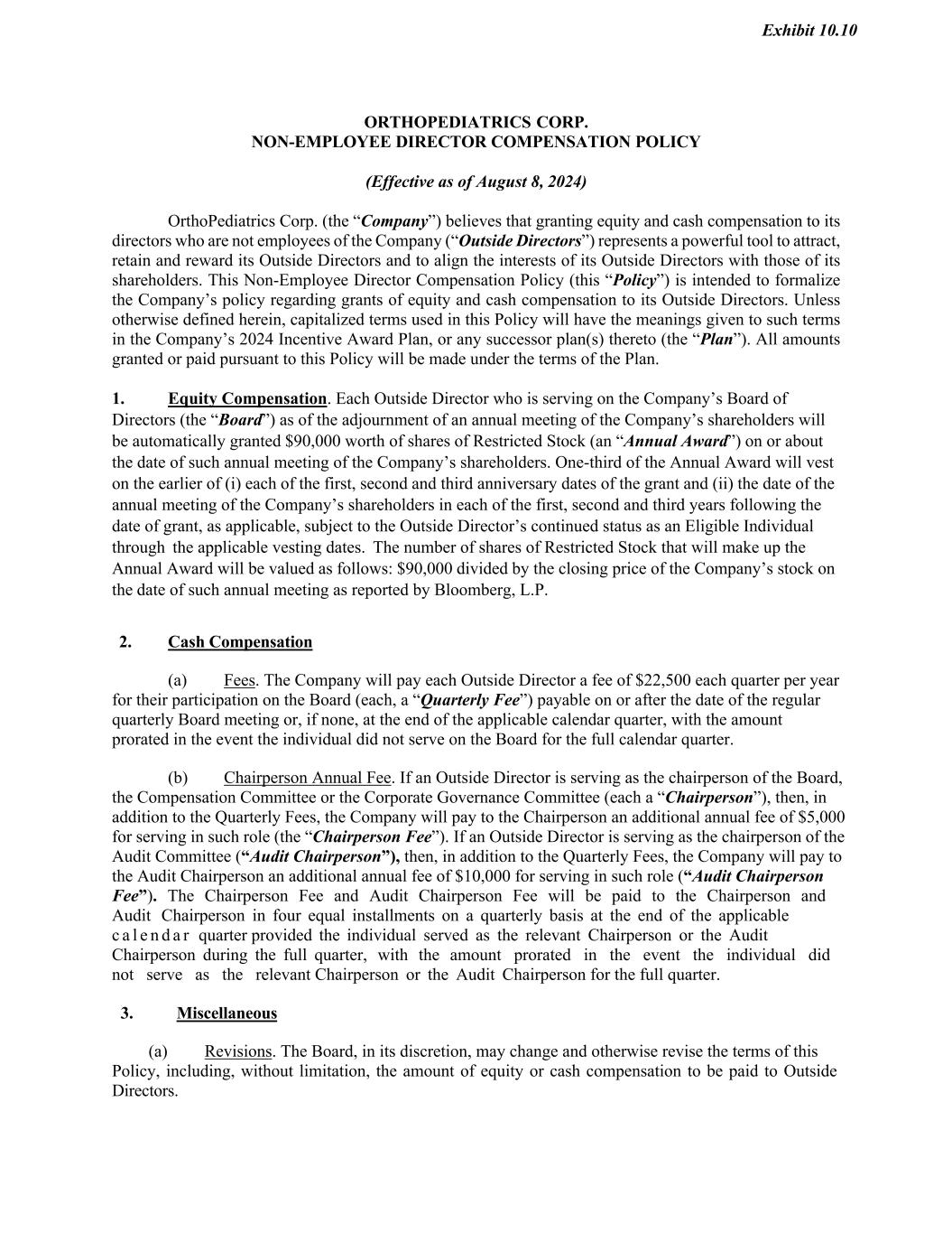 Exhibit 10.10 ORTHOPEDIATRICS CORP. NON-EMPLOYEE DIRECTOR COMPENSATION POLICY (Effective as of August 8, 2024) OrthoPediatrics Corp. (the “Company”) believes that granting equity and cash compensation to its directors who are not employees of the Company (“Outside Directors”) represents a powerful tool to attract, retain and reward its Outside Directors and to align the interests of its Outside Directors with those of its shareholders. This Non-Employee Director Compensation Policy (this “Policy”) is intended to formalize the Company’s policy regarding grants of equity and cash compensation to its Outside Directors. Unless otherwise defined herein, capitalized terms used in this Policy will have the meanings given to such terms in the Company’s 2024 Incentive Award Plan, or any successor plan(s) thereto (the “Plan”). All amounts granted or paid pursuant to this Policy will be made under the terms of the Plan. 1. Equity Compensation. Each Outside Director who is serving on the Company’s Board of Directors (the “Board”) as of the adjournment of an annual meeting of the Company’s shareholders will be automatically granted $90,000 worth of shares of Restricted Stock (an “Annual Award”) on or about the date of such annual meeting of the Company’s shareholders. One-third of the Annual Award will vest on the earlier of (i) each of the first, second and third anniversary dates of the grant and (ii) the date of the annual meeting of the Company’s shareholders in each of the first, second and third years following the date of grant, as applicable, subject to the Outside Director’s continued status as an Eligible Individual through the applicable vesting dates. The number of shares of Restricted Stock that will make up the Annual Award will be valued as follows: $90,000 divided by the closing price of the Company’s stock on the date of such annual meeting as reported by Bloomberg, L.P. 2. Cash Compensation (a) Fees. The Company will pay each Outside Director a fee of $22,500 each quarter per year for their participation on the Board (each, a “Quarterly Fee”) payable on or after the date of the regular quarterly Board meeting or, if none, at the end of the applicable calendar quarter, with the amount prorated in the event the individual did not serve on the Board for the full calendar quarter. (b) Chairperson Annual Fee. If an Outside Director is serving as the chairperson of the Board, the Compensation Committee or the Corporate Governance Committee (each a “Chairperson”), then, in addition to the Quarterly Fees, the Company will pay to the Chairperson an additional annual fee of $5,000 for serving in such role (the “Chairperson Fee”). If an Outside Director is serving as the chairperson of the Audit Committee (“Audit Chairperson”), then, in addition to the Quarterly Fees, the Company will pay to the Audit Chairperson an additional annual fee of $10,000 for serving in such role (“Audit Chairperson Fee”). The Chairperson Fee and Audit Chairperson Fee will be paid to the Chairperson and Audit Chairperson in four equal installments on a quarterly basis at the end of the applicable c a l e n d a r quarter provided the individual served as the relevant Chairperson or the Audit Chairperson during the full quarter, with the amount prorated in the event the individual did not serve as the relevant Chairperson or the Audit Chairperson for the full quarter. 3. Miscellaneous (a) Revisions. The Board, in its discretion, may change and otherwise revise the terms of this Policy, including, without limitation, the amount of equity or cash compensation to be paid to Outside Directors.