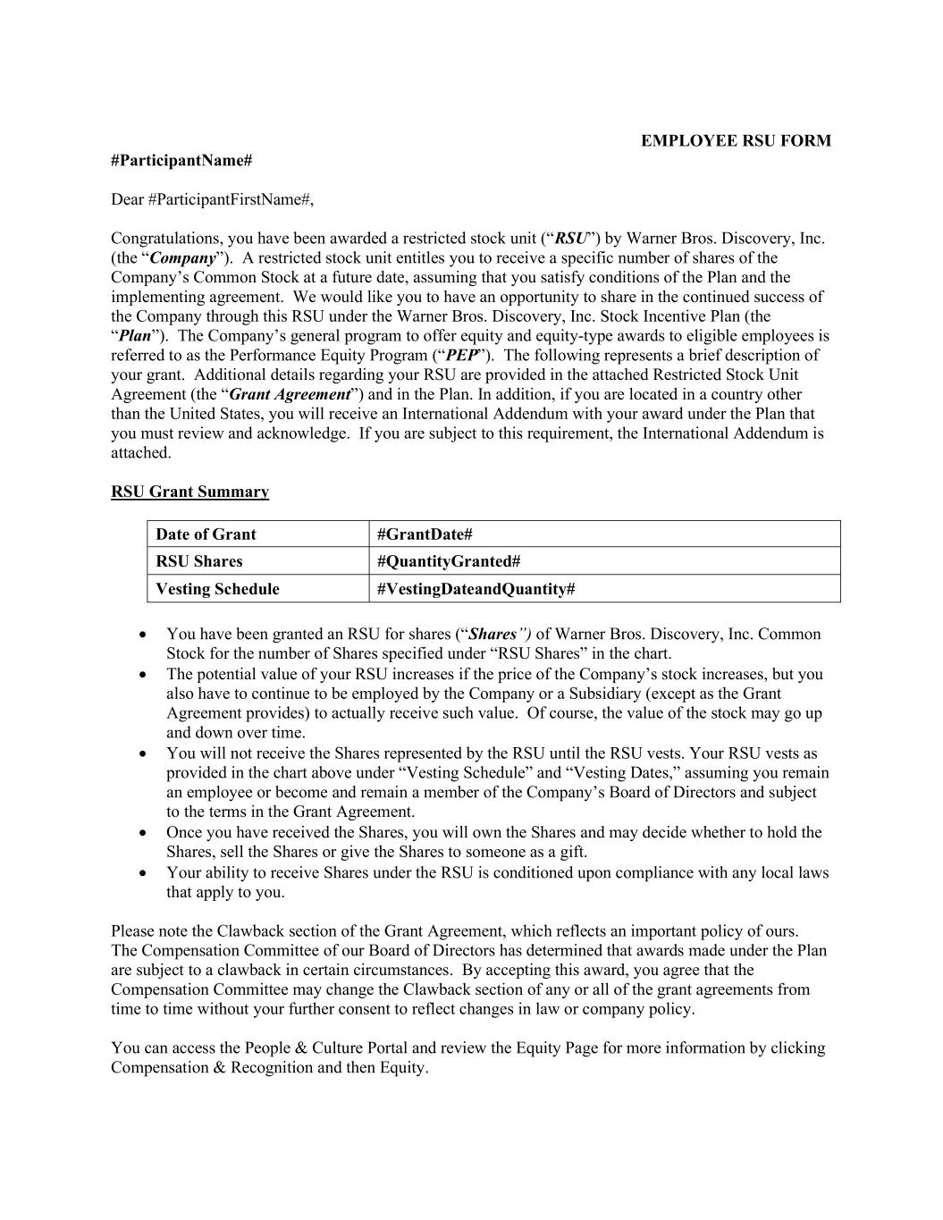 EMPLOYEE RSU FORM #ParticipantName# Dear #ParticipantFirstName#, Congratulations, you have been awarded a restricted stock unit (“RSU”) by Warner Bros. Discovery, Inc. (the “Company”). A restricted stock unit entitles you to receive a specific number of shares of the Company’s Common Stock at a future date, assuming that you satisfy conditions of the Plan and the implementing agreement. We would like you to have an opportunity to share in the continued success of the Company through this RSU under the Warner Bros. Discovery, Inc. Stock Incentive Plan (the “Plan”). The Company’s general program to offer equity and equity-type awards to eligible employees is referred to as the Performance Equity Program (“PEP”). The following represents a brief description of your grant. Additional details regarding your RSU are provided in the attached Restricted Stock Unit Agreement (the “Grant Agreement”) and in the Plan. In addition, if you are located in a country other than the United States, you will receive an International Addendum with your award under the Plan that you must review and acknowledge. If you are subject to this requirement, the International Addendum is attached. RSU Grant Summary Date of Grant #GrantDate# RSU Shares #QuantityGranted# Vesting Schedule #VestingDateandQuantity#  You have been granted an RSU for shares (“Shares”) of Warner Bros. Discovery, Inc. Common Stock for the number of Shares specified under “RSU Shares” in the chart.  The potential value of your RSU increases if the price of the Company’s stock increases, but you also have to continue to be employed by the Company or a Subsidiary (except as the Grant Agreement provides) to actually receive such value. Of course, the value of the stock may go up and down over time.  You will not receive the Shares represented by the RSU until the RSU vests. Your RSU vests as provided in the chart above under “Vesting Schedule” and “Vesting Dates,” assuming you remain an employee or become and remain a member of the Company’s Board of Directors and subject to the terms in the Grant Agreement.  Once you have received the Shares, you will own the Shares and may decide whether to hold the Shares, sell the Shares or give the Shares to someone as a gift.  Your ability to receive Shares under the RSU is conditioned upon compliance with any local laws that apply to you. Please note the Clawback section of the Grant Agreement, which reflects an important policy of ours. The Compensation Committee of our Board of Directors has determined that awards made under the Plan are subject to a clawback in certain circumstances. By accepting this award, you agree that the Compensation Committee may change the Clawback section of any or all of the grant agreements from time to time without your further consent to reflect changes in law or company policy. You can access the People & Culture Portal and review the Equity Page for more information by clicking Compensation & Recognition and then Equity.