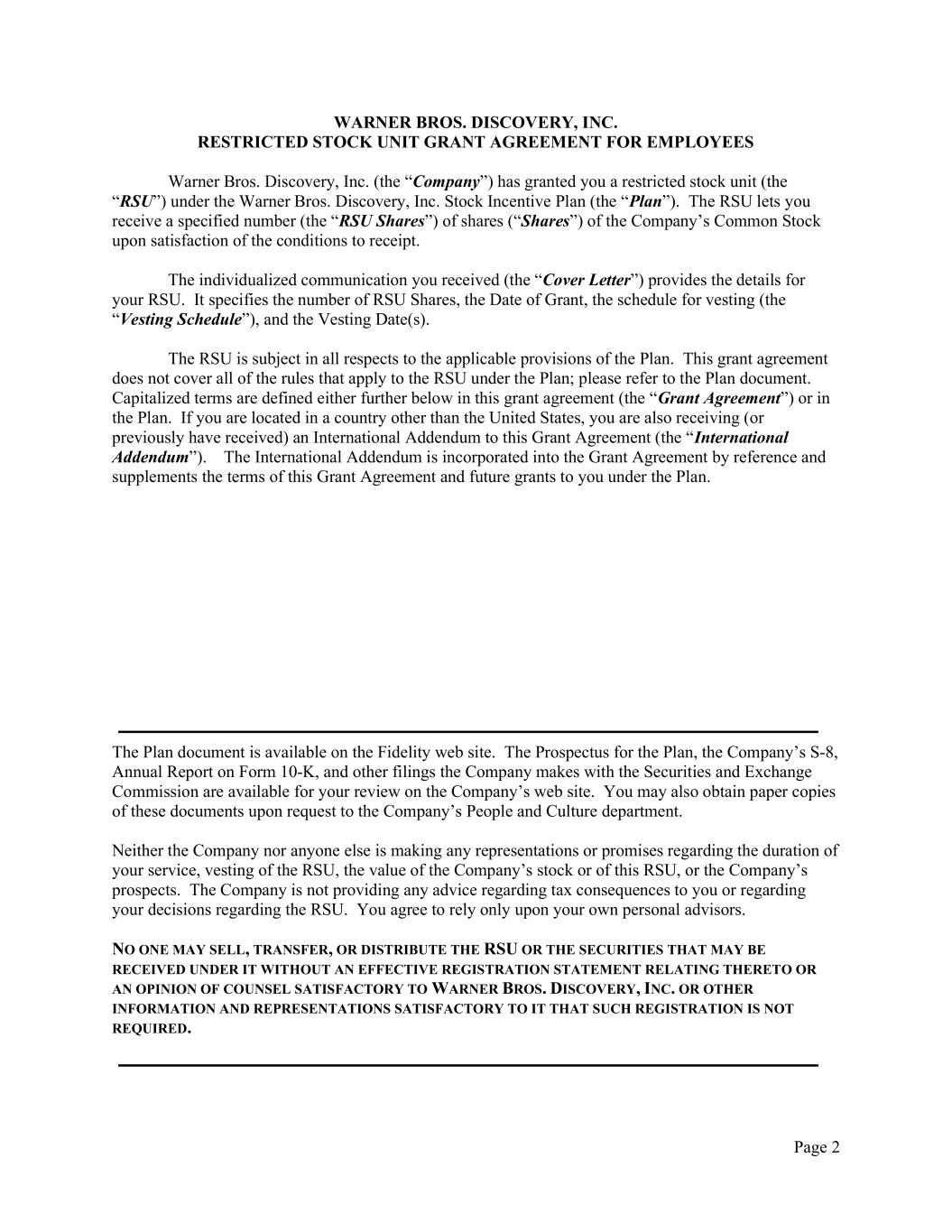 Page 2 WARNER BROS. DISCOVERY, INC. RESTRICTED STOCK UNIT GRANT AGREEMENT FOR EMPLOYEES Warner Bros. Discovery, Inc. (the “Company”) has granted you a restricted stock unit (the “RSU”) under the Warner Bros. Discovery, Inc. Stock Incentive Plan (the “Plan”). The RSU lets you receive a specified number (the “RSU Shares”) of shares (“Shares”) of the Company’s Common Stock upon satisfaction of the conditions to receipt. The individualized communication you received (the “Cover Letter”) provides the details for your RSU. It specifies the number of RSU Shares, the Date of Grant, the schedule for vesting (the “Vesting Schedule”), and the Vesting Date(s). The RSU is subject in all respects to the applicable provisions of the Plan. This grant agreement does not cover all of the rules that apply to the RSU under the Plan; please refer to the Plan document. Capitalized terms are defined either further below in this grant agreement (the “Grant Agreement”) or in the Plan. If you are located in a country other than the United States, you are also receiving (or previously have received) an International Addendum to this Grant Agreement (the “International Addendum”). The International Addendum is incorporated into the Grant Agreement by reference and supplements the terms of this Grant Agreement and future grants to you under the Plan. The Plan document is available on the Fidelity web site. The Prospectus for the Plan, the Company’s S-8, Annual Report on Form 10-K, and other filings the Company makes with the Securities and Exchange Commission are available for your review on the Company’s web site. You may also obtain paper copies of these documents upon request to the Company’s People and Culture department. Neither the Company nor anyone else is making any representations or promises regarding the duration of your service, vesting of the RSU, the value of the Company’s stock or of this RSU, or the Company’s prospects. The Company is not providing any advice regarding tax consequences to you or regarding your decisions regarding the RSU. You agree to rely only upon your own personal advisors. NO ONE MAY SELL, TRANSFER, OR DISTRIBUTE THE RSU OR THE SECURITIES THAT MAY BE RECEIVED UNDER IT WITHOUT AN EFFECTIVE REGISTRATION STATEMENT RELATING THERETO OR AN OPINION OF COUNSEL SATISFACTORY TO WARNER BROS. DISCOVERY, INC. OR OTHER INFORMATION AND REPRESENTATIONS SATISFACTORY TO IT THAT SUCH REGISTRATION IS NOT REQUIRED.