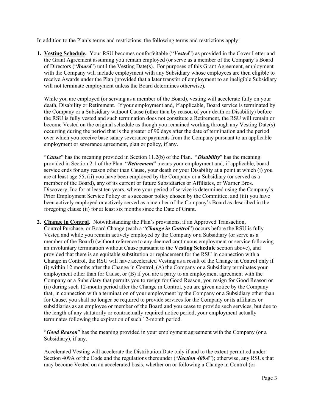 Page 3 In addition to the Plan’s terms and restrictions, the following terms and restrictions apply: 1. Vesting Schedule. Your RSU becomes nonforfeitable (“Vested”) as provided in the Cover Letter and the Grant Agreement assuming you remain employed (or serve as a member of the Company’s Board of Directors (“Board”) until the Vesting Date(s). For purposes of this Grant Agreement, employment with the Company will include employment with any Subsidiary whose employees are then eligible to receive Awards under the Plan (provided that a later transfer of employment to an ineligible Subsidiary will not terminate employment unless the Board determines otherwise). While you are employed (or serving as a member of the Board), vesting will accelerate fully on your death, Disability or Retirement. If your employment and, if applicable, Board service is terminated by the Company or a Subsidiary without Cause (other than by reason of your death or Disability) before the RSU is fully vested and such termination does not constitute a Retirement, the RSU will remain or become Vested on the original schedule as though you remained working through any Vesting Date(s) occurring during the period that is the greater of 90 days after the date of termination and the period over which you receive base salary severance payments from the Company pursuant to an applicable employment or severance agreement, plan or policy, if any. “Cause” has the meaning provided in Section 11.2(b) of the Plan. “Disability” has the meaning provided in Section 2.1 of the Plan. “Retirement” means your employment and, if applicable, board service ends for any reason other than Cause, your death or your Disability at a point at which (i) you are at least age 55, (ii) you have been employed by the Company or a Subsidiary (or served as a member of the Board), any of its current or future Subsidiaries or Affiliates, or Warner Bros. Discovery, Inc for at least ten years, where your period of service is determined using the Company’s Prior Employment Service Policy or a successor policy chosen by the Committee, and (iii) you have been actively employed or actively served as a member of the Company’s Board as described in the foregoing clause (ii) for at least six months since the Date of Grant. 2. Change in Control. Notwithstanding the Plan’s provisions, if an Approved Transaction, Control Purchase, or Board Change (each a “Change in Control”) occurs before the RSU is fully Vested and while you remain actively employed by the Company or a Subsidiary (or serve as a member of the Board) (without reference to any deemed continuous employment or service following an involuntary termination without Cause pursuant to the Vesting Schedule section above), and provided that there is an equitable substitution or replacement for the RSU in connection with a Change in Control, the RSU will have accelerated Vesting as a result of the Change in Control only if (i) within 12 months after the Change in Control, (A) the Company or a Subsidiary terminates your employment other than for Cause, or (B) if you are a party to an employment agreement with the Company or a Subsidiary that permits you to resign for Good Reason, you resign for Good Reason or (ii) during such 12-month period after the Change in Control, you are given notice by the Company that, in connection with a termination of your employment by the Company or a Subsidiary other than for Cause, you shall no longer be required to provide services for the Company or its affiliates or subsidiaries as an employee or member of the Board and you cease to provide such services, but due to the length of any statutorily or contractually required notice period, your employment actually terminates following the expiration of such 12-month period. “Good Reason” has the meaning provided in your employment agreement with the Company (or a Subsidiary), if any. Accelerated Vesting will accelerate the Distribution Date only if and to the extent permitted under Section 409A of the Code and the regulations thereunder (“Section 409A”); otherwise, any RSUs that may become Vested on an accelerated basis, whether on or following a Change in Control (or