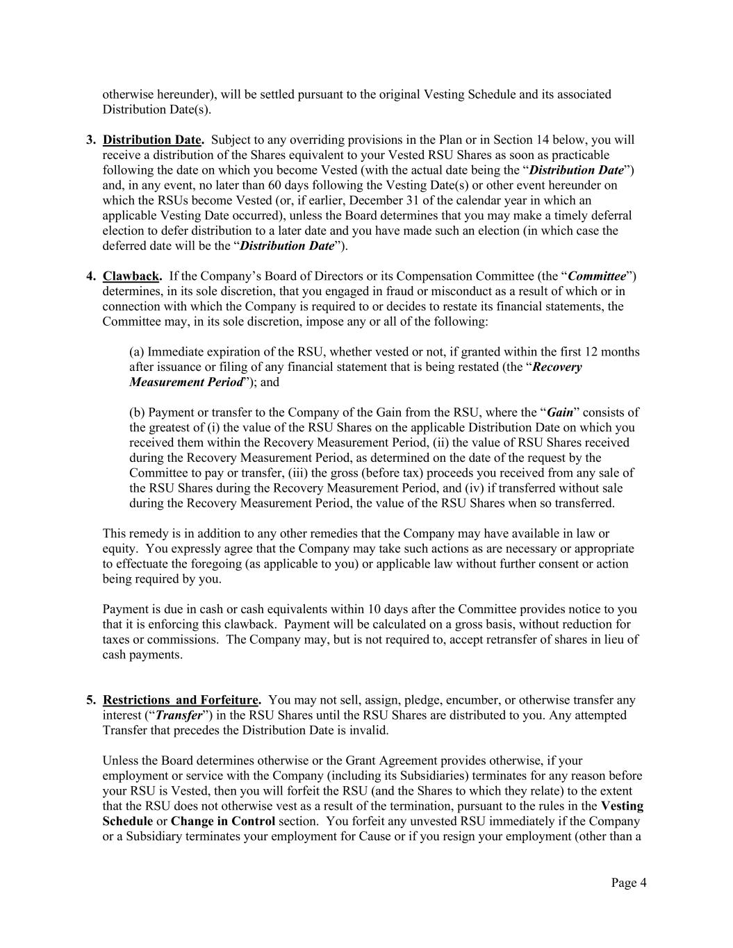 Page 4 otherwise hereunder), will be settled pursuant to the original Vesting Schedule and its associated Distribution Date(s). 3. Distribution Date. Subject to any overriding provisions in the Plan or in Section 14 below, you will receive a distribution of the Shares equivalent to your Vested RSU Shares as soon as practicable following the date on which you become Vested (with the actual date being the “Distribution Date”) and, in any event, no later than 60 days following the Vesting Date(s) or other event hereunder on which the RSUs become Vested (or, if earlier, December 31 of the calendar year in which an applicable Vesting Date occurred), unless the Board determines that you may make a timely deferral election to defer distribution to a later date and you have made such an election (in which case the deferred date will be the “Distribution Date”). 4. Clawback. If the Company’s Board of Directors or its Compensation Committee (the “Committee”) determines, in its sole discretion, that you engaged in fraud or misconduct as a result of which or in connection with which the Company is required to or decides to restate its financial statements, the Committee may, in its sole discretion, impose any or all of the following: (a) Immediate expiration of the RSU, whether vested or not, if granted within the first 12 months after issuance or filing of any financial statement that is being restated (the “Recovery Measurement Period”); and (b) Payment or transfer to the Company of the Gain from the RSU, where the “Gain” consists of the greatest of (i) the value of the RSU Shares on the applicable Distribution Date on which you received them within the Recovery Measurement Period, (ii) the value of RSU Shares received during the Recovery Measurement Period, as determined on the date of the request by the Committee to pay or transfer, (iii) the gross (before tax) proceeds you received from any sale of the RSU Shares during the Recovery Measurement Period, and (iv) if transferred without sale during the Recovery Measurement Period, the value of the RSU Shares when so transferred. This remedy is in addition to any other remedies that the Company may have available in law or equity. You expressly agree that the Company may take such actions as are necessary or appropriate to effectuate the foregoing (as applicable to you) or applicable law without further consent or action being required by you. Payment is due in cash or cash equivalents within 10 days after the Committee provides notice to you that it is enforcing this clawback. Payment will be calculated on a gross basis, without reduction for taxes or commissions. The Company may, but is not required to, accept retransfer of shares in lieu of cash payments. 5. Restrictions and Forfeiture. You may not sell, assign, pledge, encumber, or otherwise transfer any interest (“Transfer”) in the RSU Shares until the RSU Shares are distributed to you. Any attempted Transfer that precedes the Distribution Date is invalid. Unless the Board determines otherwise or the Grant Agreement provides otherwise, if your employment or service with the Company (including its Subsidiaries) terminates for any reason before your RSU is Vested, then you will forfeit the RSU (and the Shares to which they relate) to the extent that the RSU does not otherwise vest as a result of the termination, pursuant to the rules in the Vesting Schedule or Change in Control section. You forfeit any unvested RSU immediately if the Company or a Subsidiary terminates your employment for Cause or if you resign your employment (other than a