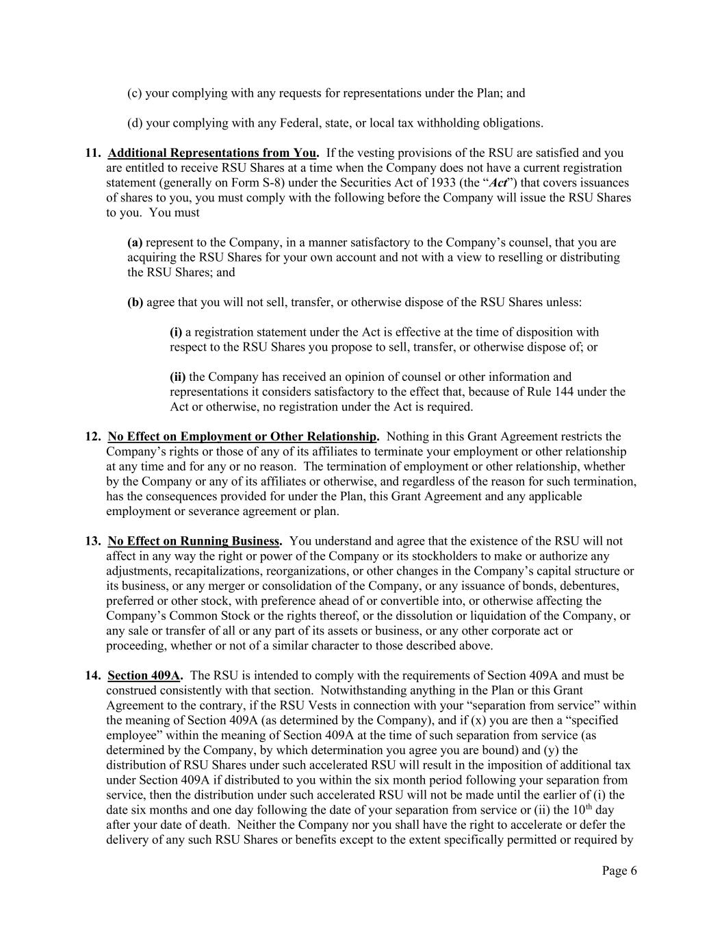 Page 6 (c) your complying with any requests for representations under the Plan; and (d) your complying with any Federal, state, or local tax withholding obligations. 11. Additional Representations from You. If the vesting provisions of the RSU are satisfied and you are entitled to receive RSU Shares at a time when the Company does not have a current registration statement (generally on Form S-8) under the Securities Act of 1933 (the “Act”) that covers issuances of shares to you, you must comply with the following before the Company will issue the RSU Shares to you. You must (a) represent to the Company, in a manner satisfactory to the Company’s counsel, that you are acquiring the RSU Shares for your own account and not with a view to reselling or distributing the RSU Shares; and (b) agree that you will not sell, transfer, or otherwise dispose of the RSU Shares unless: (i) a registration statement under the Act is effective at the time of disposition with respect to the RSU Shares you propose to sell, transfer, or otherwise dispose of; or (ii) the Company has received an opinion of counsel or other information and representations it considers satisfactory to the effect that, because of Rule 144 under the Act or otherwise, no registration under the Act is required. 12. No Effect on Employment or Other Relationship. Nothing in this Grant Agreement restricts the Company’s rights or those of any of its affiliates to terminate your employment or other relationship at any time and for any or no reason. The termination of employment or other relationship, whether by the Company or any of its affiliates or otherwise, and regardless of the reason for such termination, has the consequences provided for under the Plan, this Grant Agreement and any applicable employment or severance agreement or plan. 13. No Effect on Running Business. You understand and agree that the existence of the RSU will not affect in any way the right or power of the Company or its stockholders to make or authorize any adjustments, recapitalizations, reorganizations, or other changes in the Company’s capital structure or its business, or any merger or consolidation of the Company, or any issuance of bonds, debentures, preferred or other stock, with preference ahead of or convertible into, or otherwise affecting the Company’s Common Stock or the rights thereof, or the dissolution or liquidation of the Company, or any sale or transfer of all or any part of its assets or business, or any other corporate act or proceeding, whether or not of a similar character to those described above. 14. Section 409A. The RSU is intended to comply with the requirements of Section 409A and must be construed consistently with that section. Notwithstanding anything in the Plan or this Grant Agreement to the contrary, if the RSU Vests in connection with your “separation from service” within the meaning of Section 409A (as determined by the Company), and if (x) you are then a “specified employee” within the meaning of Section 409A at the time of such separation from service (as determined by the Company, by which determination you agree you are bound) and (y) the distribution of RSU Shares under such accelerated RSU will result in the imposition of additional tax under Section 409A if distributed to you within the six month period following your separation from service, then the distribution under such accelerated RSU will not be made until the earlier of (i) the date six months and one day following the date of your separation from service or (ii) the 10th day after your date of death. Neither the Company nor you shall have the right to accelerate or defer the delivery of any such RSU Shares or benefits except to the extent specifically permitted or required by