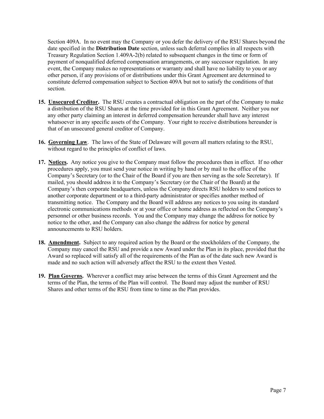 Page 7 Section 409A. In no event may the Company or you defer the delivery of the RSU Shares beyond the date specified in the Distribution Date section, unless such deferral complies in all respects with Treasury Regulation Section 1.409A-2(b) related to subsequent changes in the time or form of payment of nonqualified deferred compensation arrangements, or any successor regulation. In any event, the Company makes no representations or warranty and shall have no liability to you or any other person, if any provisions of or distributions under this Grant Agreement are determined to constitute deferred compensation subject to Section 409A but not to satisfy the conditions of that section. 15. Unsecured Creditor. The RSU creates a contractual obligation on the part of the Company to make a distribution of the RSU Shares at the time provided for in this Grant Agreement. Neither you nor any other party claiming an interest in deferred compensation hereunder shall have any interest whatsoever in any specific assets of the Company. Your right to receive distributions hereunder is that of an unsecured general creditor of Company. 16. Governing Law. The laws of the State of Delaware will govern all matters relating to the RSU, without regard to the principles of conflict of laws. 17. Notices. Any notice you give to the Company must follow the procedures then in effect. If no other procedures apply, you must send your notice in writing by hand or by mail to the office of the Company’s Secretary (or to the Chair of the Board if you are then serving as the sole Secretary). If mailed, you should address it to the Company’s Secretary (or the Chair of the Board) at the Company’s then corporate headquarters, unless the Company directs RSU holders to send notices to another corporate department or to a third-party administrator or specifies another method of transmitting notice. The Company and the Board will address any notices to you using its standard electronic communications methods or at your office or home address as reflected on the Company’s personnel or other business records. You and the Company may change the address for notice by notice to the other, and the Company can also change the address for notice by general announcements to RSU holders. 18. Amendment. Subject to any required action by the Board or the stockholders of the Company, the Company may cancel the RSU and provide a new Award under the Plan in its place, provided that the Award so replaced will satisfy all of the requirements of the Plan as of the date such new Award is made and no such action will adversely affect the RSU to the extent then Vested. 19. Plan Governs. Wherever a conflict may arise between the terms of this Grant Agreement and the terms of the Plan, the terms of the Plan will control. The Board may adjust the number of RSU Shares and other terms of the RSU from time to time as the Plan provides.