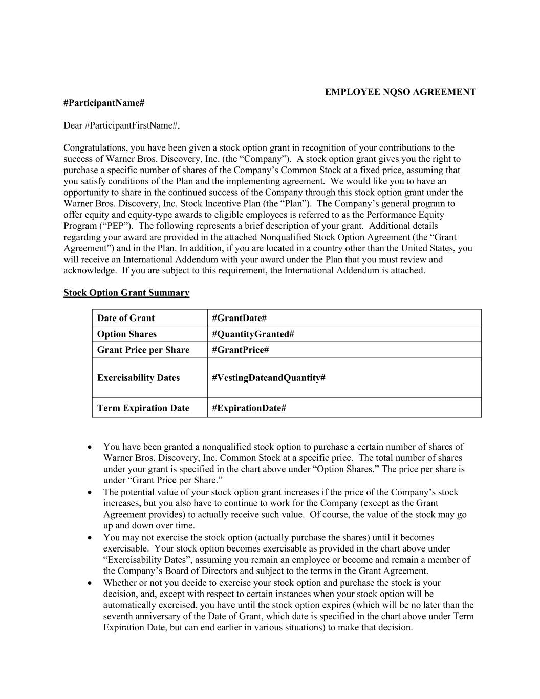 EMPLOYEE NQSO AGREEMENT #ParticipantName# Dear #ParticipantFirstName#, Congratulations, you have been given a stock option grant in recognition of your contributions to the success of Warner Bros. Discovery, Inc. (the “Company”). A stock option grant gives you the right to purchase a specific number of shares of the Company’s Common Stock at a fixed price, assuming that you satisfy conditions of the Plan and the implementing agreement. We would like you to have an opportunity to share in the continued success of the Company through this stock option grant under the Warner Bros. Discovery, Inc. Stock Incentive Plan (the “Plan”). The Company’s general program to offer equity and equity-type awards to eligible employees is referred to as the Performance Equity Program (“PEP”). The following represents a brief description of your grant. Additional details regarding your award are provided in the attached Nonqualified Stock Option Agreement (the “Grant Agreement”) and in the Plan. In addition, if you are located in a country other than the United States, you will receive an International Addendum with your award under the Plan that you must review and acknowledge. If you are subject to this requirement, the International Addendum is attached. Stock Option Grant Summary Date of Grant #GrantDate# Option Shares #QuantityGranted# Grant Price per Share #GrantPrice# Exercisability Dates #VestingDateandQuantity# Term Expiration Date #ExpirationDate#  You have been granted a nonqualified stock option to purchase a certain number of shares of Warner Bros. Discovery, Inc. Common Stock at a specific price. The total number of shares under your grant is specified in the chart above under “Option Shares.” The price per share is under “Grant Price per Share.”  The potential value of your stock option grant increases if the price of the Company’s stock increases, but you also have to continue to work for the Company (except as the Grant Agreement provides) to actually receive such value. Of course, the value of the stock may go up and down over time.  You may not exercise the stock option (actually purchase the shares) until it becomes exercisable. Your stock option becomes exercisable as provided in the chart above under “Exercisability Dates”, assuming you remain an employee or become and remain a member of the Company’s Board of Directors and subject to the terms in the Grant Agreement.  Whether or not you decide to exercise your stock option and purchase the stock is your decision, and, except with respect to certain instances when your stock option will be automatically exercised, you have until the stock option expires (which will be no later than the seventh anniversary of the Date of Grant, which date is specified in the chart above under Term Expiration Date, but can end earlier in various situations) to make that decision.