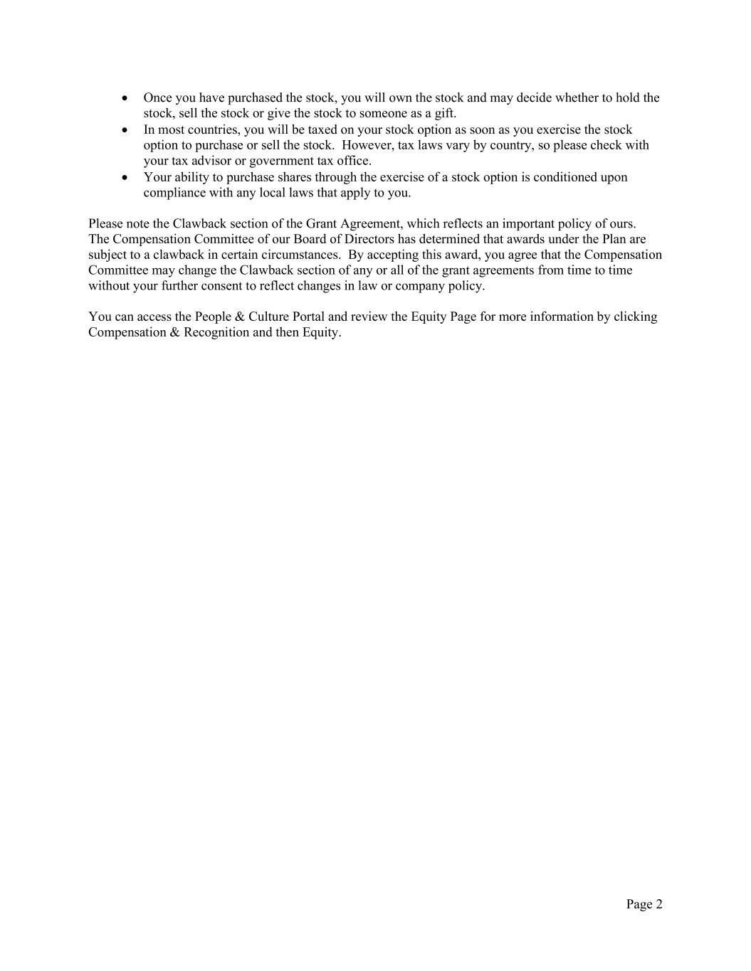 Page 2  Once you have purchased the stock, you will own the stock and may decide whether to hold the stock, sell the stock or give the stock to someone as a gift.  In most countries, you will be taxed on your stock option as soon as you exercise the stock option to purchase or sell the stock. However, tax laws vary by country, so please check with your tax advisor or government tax office.  Your ability to purchase shares through the exercise of a stock option is conditioned upon compliance with any local laws that apply to you. Please note the Clawback section of the Grant Agreement, which reflects an important policy of ours. The Compensation Committee of our Board of Directors has determined that awards under the Plan are subject to a clawback in certain circumstances. By accepting this award, you agree that the Compensation Committee may change the Clawback section of any or all of the grant agreements from time to time without your further consent to reflect changes in law or company policy. You can access the People & Culture Portal and review the Equity Page for more information by clicking Compensation & Recognition and then Equity.