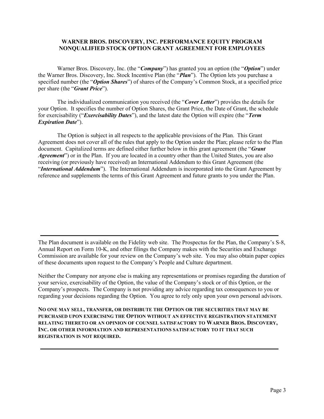 Page 3 WARNER BROS. DISCOVERY, INC. PERFORMANCE EQUITY PROGRAM NONQUALIFIED STOCK OPTION GRANT AGREEMENT FOR EMPLOYEES Warner Bros. Discovery, Inc. (the “Company”) has granted you an option (the “Option”) under the Warner Bros. Discovery, Inc. Stock Incentive Plan (the “Plan”). The Option lets you purchase a specified number (the “Option Shares”) of shares of the Company’s Common Stock, at a specified price per share (the “Grant Price”). The individualized communication you received (the “Cover Letter”) provides the details for your Option. It specifies the number of Option Shares, the Grant Price, the Date of Grant, the schedule for exercisability (“Exercisability Dates”), and the latest date the Option will expire (the “Term Expiration Date”). The Option is subject in all respects to the applicable provisions of the Plan. This Grant Agreement does not cover all of the rules that apply to the Option under the Plan; please refer to the Plan document. Capitalized terms are defined either further below in this grant agreement (the “Grant Agreement”) or in the Plan. If you are located in a country other than the United States, you are also receiving (or previously have received) an International Addendum to this Grant Agreement (the “International Addendum”). The International Addendum is incorporated into the Grant Agreement by reference and supplements the terms of this Grant Agreement and future grants to you under the Plan. The Plan document is available on the Fidelity web site. The Prospectus for the Plan, the Company’s S-8, Annual Report on Form 10-K, and other filings the Company makes with the Securities and Exchange Commission are available for your review on the Company’s web site. You may also obtain paper copies of these documents upon request to the Company’s People and Culture department. Neither the Company nor anyone else is making any representations or promises regarding the duration of your service, exercisability of the Option, the value of the Company’s stock or of this Option, or the Company’s prospects. The Company is not providing any advice regarding tax consequences to you or regarding your decisions regarding the Option. You agree to rely only upon your own personal advisors. NO ONE MAY SELL, TRANSFER, OR DISTRIBUTE THE OPTION OR THE SECURITIES THAT MAY BE PURCHASED UPON EXERCISING THE OPTION WITHOUT AN EFFECTIVE REGISTRATION STATEMENT RELATING THERETO OR AN OPINION OF COUNSEL SATISFACTORY TO WARNER BROS. DISCOVERY, INC. OR OTHER INFORMATION AND REPRESENTATIONS SATISFACTORY TO IT THAT SUCH REGISTRATION IS NOT REQUIRED.