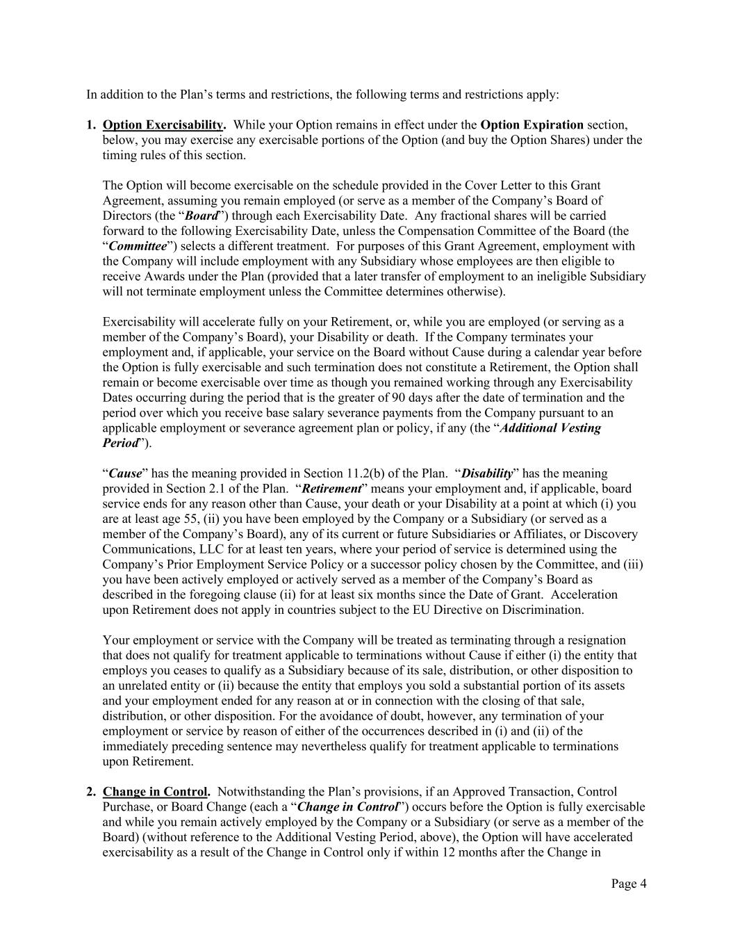 Page 4 In addition to the Plan’s terms and restrictions, the following terms and restrictions apply: 1. Option Exercisability. While your Option remains in effect under the Option Expiration section, below, you may exercise any exercisable portions of the Option (and buy the Option Shares) under the timing rules of this section. The Option will become exercisable on the schedule provided in the Cover Letter to this Grant Agreement, assuming you remain employed (or serve as a member of the Company’s Board of Directors (the “Board”) through each Exercisability Date. Any fractional shares will be carried forward to the following Exercisability Date, unless the Compensation Committee of the Board (the “Committee”) selects a different treatment. For purposes of this Grant Agreement, employment with the Company will include employment with any Subsidiary whose employees are then eligible to receive Awards under the Plan (provided that a later transfer of employment to an ineligible Subsidiary will not terminate employment unless the Committee determines otherwise). Exercisability will accelerate fully on your Retirement, or, while you are employed (or serving as a member of the Company’s Board), your Disability or death. If the Company terminates your employment and, if applicable, your service on the Board without Cause during a calendar year before the Option is fully exercisable and such termination does not constitute a Retirement, the Option shall remain or become exercisable over time as though you remained working through any Exercisability Dates occurring during the period that is the greater of 90 days after the date of termination and the period over which you receive base salary severance payments from the Company pursuant to an applicable employment or severance agreement plan or policy, if any (the “Additional Vesting Period”). “Cause” has the meaning provided in Section 11.2(b) of the Plan. “Disability” has the meaning provided in Section 2.1 of the Plan. “Retirement” means your employment and, if applicable, board service ends for any reason other than Cause, your death or your Disability at a point at which (i) you are at least age 55, (ii) you have been employed by the Company or a Subsidiary (or served as a member of the Company’s Board), any of its current or future Subsidiaries or Affiliates, or Discovery Communications, LLC for at least ten years, where your period of service is determined using the Company’s Prior Employment Service Policy or a successor policy chosen by the Committee, and (iii) you have been actively employed or actively served as a member of the Company’s Board as described in the foregoing clause (ii) for at least six months since the Date of Grant. Acceleration upon Retirement does not apply in countries subject to the EU Directive on Discrimination. Your employment or service with the Company will be treated as terminating through a resignation that does not qualify for treatment applicable to terminations without Cause if either (i) the entity that employs you ceases to qualify as a Subsidiary because of its sale, distribution, or other disposition to an unrelated entity or (ii) because the entity that employs you sold a substantial portion of its assets and your employment ended for any reason at or in connection with the closing of that sale, distribution, or other disposition. For the avoidance of doubt, however, any termination of your employment or service by reason of either of the occurrences described in (i) and (ii) of the immediately preceding sentence may nevertheless qualify for treatment applicable to terminations upon Retirement. 2. Change in Control. Notwithstanding the Plan’s provisions, if an Approved Transaction, Control Purchase, or Board Change (each a “Change in Control”) occurs before the Option is fully exercisable and while you remain actively employed by the Company or a Subsidiary (or serve as a member of the Board) (without reference to the Additional Vesting Period, above), the Option will have accelerated exercisability as a result of the Change in Control only if within 12 months after the Change in