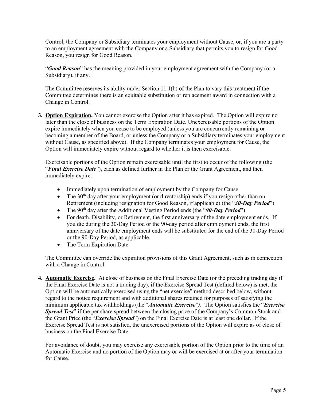 Page 5 Control, the Company or Subsidiary terminates your employment without Cause, or, if you are a party to an employment agreement with the Company or a Subsidiary that permits you to resign for Good Reason, you resign for Good Reason. “Good Reason” has the meaning provided in your employment agreement with the Company (or a Subsidiary), if any. The Committee reserves its ability under Section 11.1(b) of the Plan to vary this treatment if the Committee determines there is an equitable substitution or replacement award in connection with a Change in Control. 3. Option Expiration. You cannot exercise the Option after it has expired. The Option will expire no later than the close of business on the Term Expiration Date. Unexercisable portions of the Option expire immediately when you cease to be employed (unless you are concurrently remaining or becoming a member of the Board, or unless the Company or a Subsidiary terminates your employment without Cause, as specified above). If the Company terminates your employment for Cause, the Option will immediately expire without regard to whether it is then exercisable. Exercisable portions of the Option remain exercisable until the first to occur of the following (the “Final Exercise Date”), each as defined further in the Plan or the Grant Agreement, and then immediately expire:  Immediately upon termination of employment by the Company for Cause  The 30th day after your employment (or directorship) ends if you resign other than on Retirement (including resignation for Good Reason, if applicable) (the “30-Day Period”)  The 90th day after the Additional Vesting Period ends (the “90-Day Period”)  For death, Disability, or Retirement, the first anniversary of the date employment ends. If you die during the 30-Day Period or the 90-day period after employment ends, the first anniversary of the date employment ends will be substituted for the end of the 30-Day Period or the 90-Day Period, as applicable.  The Term Expiration Date The Committee can override the expiration provisions of this Grant Agreement, such as in connection with a Change in Control. 4. Automatic Exercise. At close of business on the Final Exercise Date (or the preceding trading day if the Final Exercise Date is not a trading day), if the Exercise Spread Test (defined below) is met, the Option will be automatically exercised using the “net exercise” method described below, without regard to the notice requirement and with additional shares retained for purposes of satisfying the minimum applicable tax withholdings (the “Automatic Exercise”). The Option satisfies the “Exercise Spread Test” if the per share spread between the closing price of the Company’s Common Stock and the Grant Price (the “Exercise Spread”) on the Final Exercise Date is at least one dollar. If the Exercise Spread Test is not satisfied, the unexercised portions of the Option will expire as of close of business on the Final Exercise Date. For avoidance of doubt, you may exercise any exercisable portion of the Option prior to the time of an Automatic Exercise and no portion of the Option may or will be exercised at or after your termination for Cause.