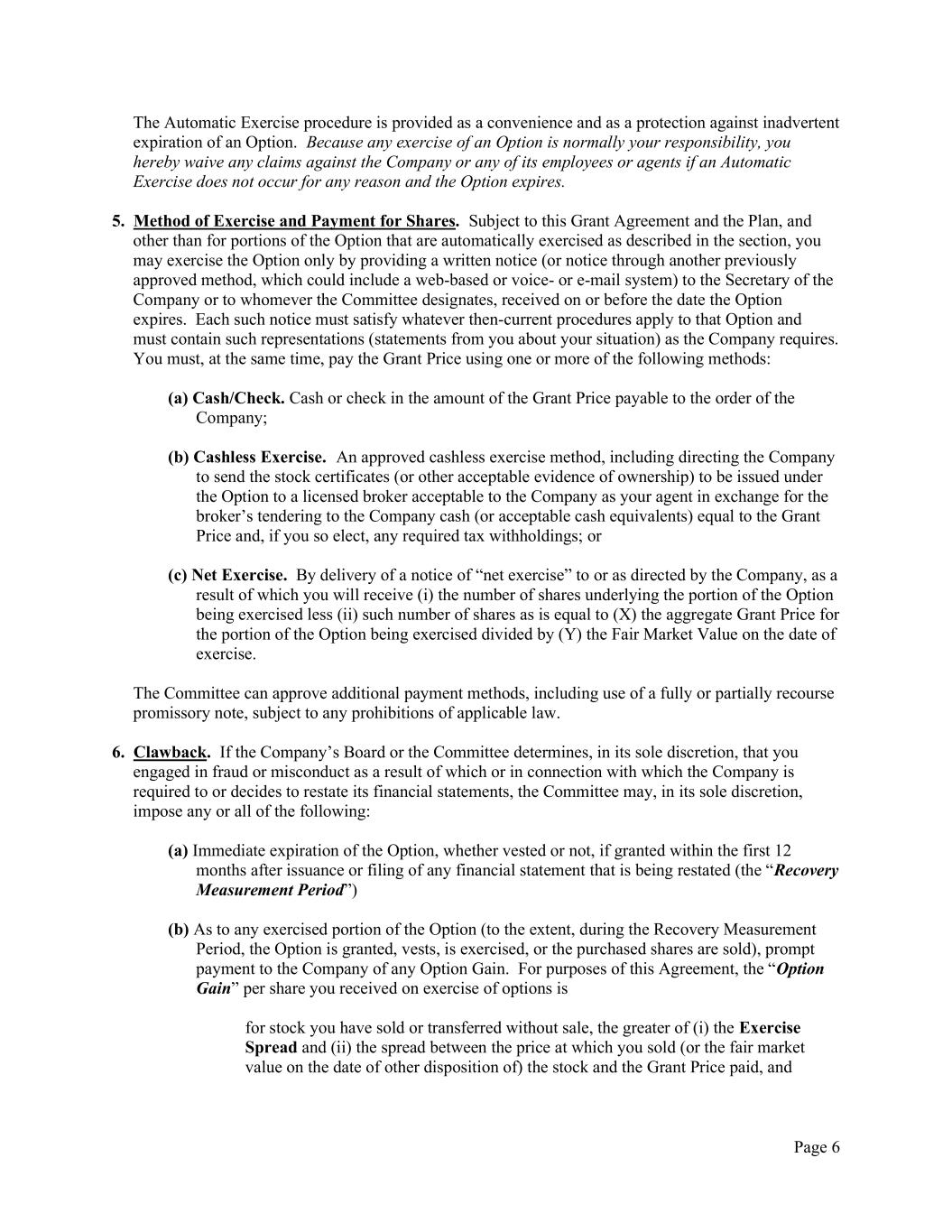 Page 6 The Automatic Exercise procedure is provided as a convenience and as a protection against inadvertent expiration of an Option. Because any exercise of an Option is normally your responsibility, you hereby waive any claims against the Company or any of its employees or agents if an Automatic Exercise does not occur for any reason and the Option expires. 5. Method of Exercise and Payment for Shares. Subject to this Grant Agreement and the Plan, and other than for portions of the Option that are automatically exercised as described in the section, you may exercise the Option only by providing a written notice (or notice through another previously approved method, which could include a web-based or voice- or e-mail system) to the Secretary of the Company or to whomever the Committee designates, received on or before the date the Option expires. Each such notice must satisfy whatever then-current procedures apply to that Option and must contain such representations (statements from you about your situation) as the Company requires. You must, at the same time, pay the Grant Price using one or more of the following methods: (a) Cash/Check. Cash or check in the amount of the Grant Price payable to the order of the Company; (b) Cashless Exercise. An approved cashless exercise method, including directing the Company to send the stock certificates (or other acceptable evidence of ownership) to be issued under the Option to a licensed broker acceptable to the Company as your agent in exchange for the broker’s tendering to the Company cash (or acceptable cash equivalents) equal to the Grant Price and, if you so elect, any required tax withholdings; or (c) Net Exercise. By delivery of a notice of “net exercise” to or as directed by the Company, as a result of which you will receive (i) the number of shares underlying the portion of the Option being exercised less (ii) such number of shares as is equal to (X) the aggregate Grant Price for the portion of the Option being exercised divided by (Y) the Fair Market Value on the date of exercise. The Committee can approve additional payment methods, including use of a fully or partially recourse promissory note, subject to any prohibitions of applicable law. 6. Clawback. If the Company’s Board or the Committee determines, in its sole discretion, that you engaged in fraud or misconduct as a result of which or in connection with which the Company is required to or decides to restate its financial statements, the Committee may, in its sole discretion, impose any or all of the following: (a) Immediate expiration of the Option, whether vested or not, if granted within the first 12 months after issuance or filing of any financial statement that is being restated (the “Recovery Measurement Period”) (b) As to any exercised portion of the Option (to the extent, during the Recovery Measurement Period, the Option is granted, vests, is exercised, or the purchased shares are sold), prompt payment to the Company of any Option Gain. For purposes of this Agreement, the “Option Gain” per share you received on exercise of options is for stock you have sold or transferred without sale, the greater of (i) the Exercise Spread and (ii) the spread between the price at which you sold (or the fair market value on the date of other disposition of) the stock and the Grant Price paid, and