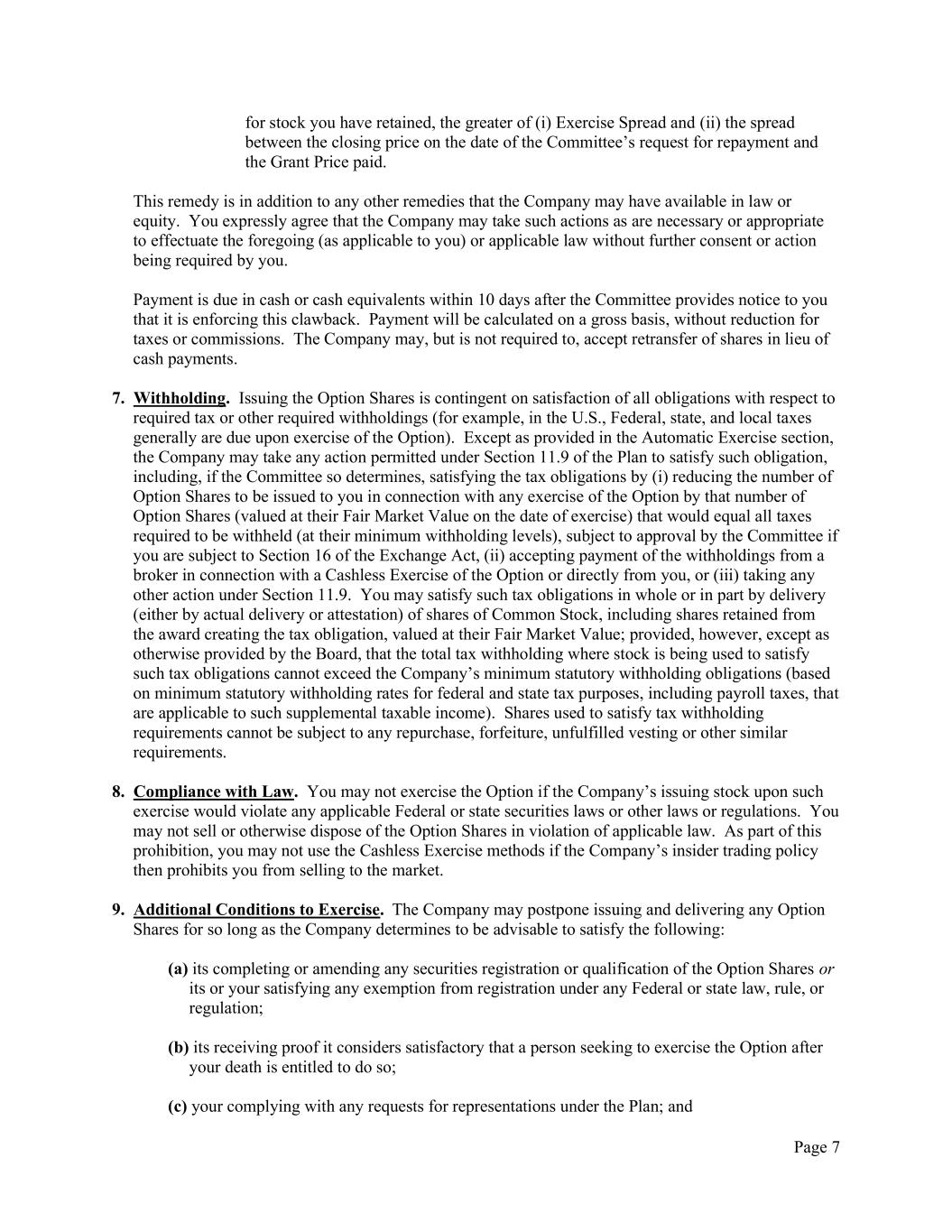 Page 7 for stock you have retained, the greater of (i) Exercise Spread and (ii) the spread between the closing price on the date of the Committee’s request for repayment and the Grant Price paid. This remedy is in addition to any other remedies that the Company may have available in law or equity. You expressly agree that the Company may take such actions as are necessary or appropriate to effectuate the foregoing (as applicable to you) or applicable law without further consent or action being required by you. Payment is due in cash or cash equivalents within 10 days after the Committee provides notice to you that it is enforcing this clawback. Payment will be calculated on a gross basis, without reduction for taxes or commissions. The Company may, but is not required to, accept retransfer of shares in lieu of cash payments. 7. Withholding. Issuing the Option Shares is contingent on satisfaction of all obligations with respect to required tax or other required withholdings (for example, in the U.S., Federal, state, and local taxes generally are due upon exercise of the Option). Except as provided in the Automatic Exercise section, the Company may take any action permitted under Section 11.9 of the Plan to satisfy such obligation, including, if the Committee so determines, satisfying the tax obligations by (i) reducing the number of Option Shares to be issued to you in connection with any exercise of the Option by that number of Option Shares (valued at their Fair Market Value on the date of exercise) that would equal all taxes required to be withheld (at their minimum withholding levels), subject to approval by the Committee if you are subject to Section 16 of the Exchange Act, (ii) accepting payment of the withholdings from a broker in connection with a Cashless Exercise of the Option or directly from you, or (iii) taking any other action under Section 11.9. You may satisfy such tax obligations in whole or in part by delivery (either by actual delivery or attestation) of shares of Common Stock, including shares retained from the award creating the tax obligation, valued at their Fair Market Value; provided, however, except as otherwise provided by the Board, that the total tax withholding where stock is being used to satisfy such tax obligations cannot exceed the Company’s minimum statutory withholding obligations (based on minimum statutory withholding rates for federal and state tax purposes, including payroll taxes, that are applicable to such supplemental taxable income). Shares used to satisfy tax withholding requirements cannot be subject to any repurchase, forfeiture, unfulfilled vesting or other similar requirements. 8. Compliance with Law. You may not exercise the Option if the Company’s issuing stock upon such exercise would violate any applicable Federal or state securities laws or other laws or regulations. You may not sell or otherwise dispose of the Option Shares in violation of applicable law. As part of this prohibition, you may not use the Cashless Exercise methods if the Company’s insider trading policy then prohibits you from selling to the market. 9. Additional Conditions to Exercise. The Company may postpone issuing and delivering any Option Shares for so long as the Company determines to be advisable to satisfy the following: (a) its completing or amending any securities registration or qualification of the Option Shares or its or your satisfying any exemption from registration under any Federal or state law, rule, or regulation; (b) its receiving proof it considers satisfactory that a person seeking to exercise the Option after your death is entitled to do so; (c) your complying with any requests for representations under the Plan; and